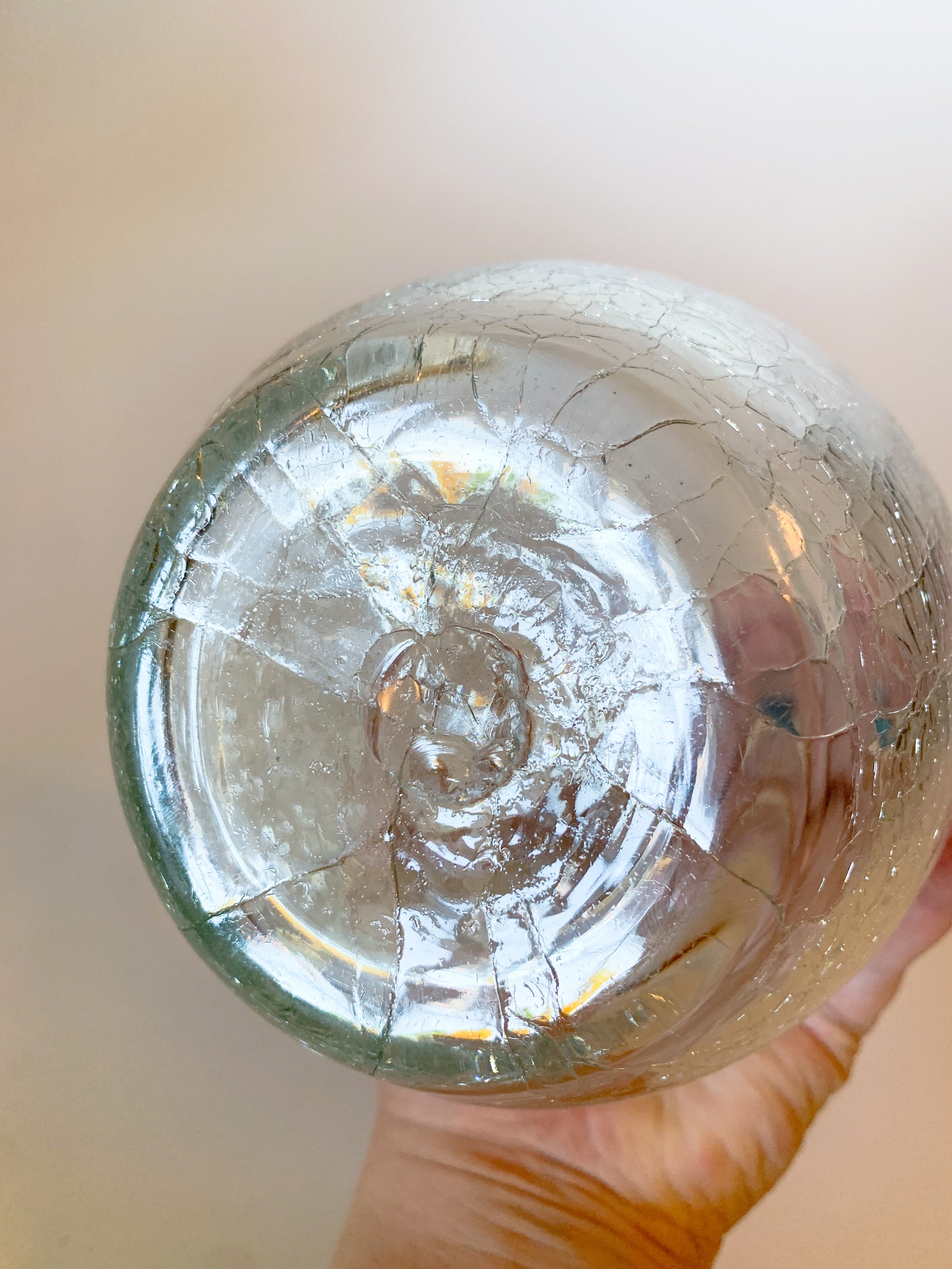 A great piece of hand blown art glass! This 1950s Blenko #417 Clear Crackle blown glass jug has a bright blue handle. Use as a vase or in a collection of colorful glass in styled shelves.