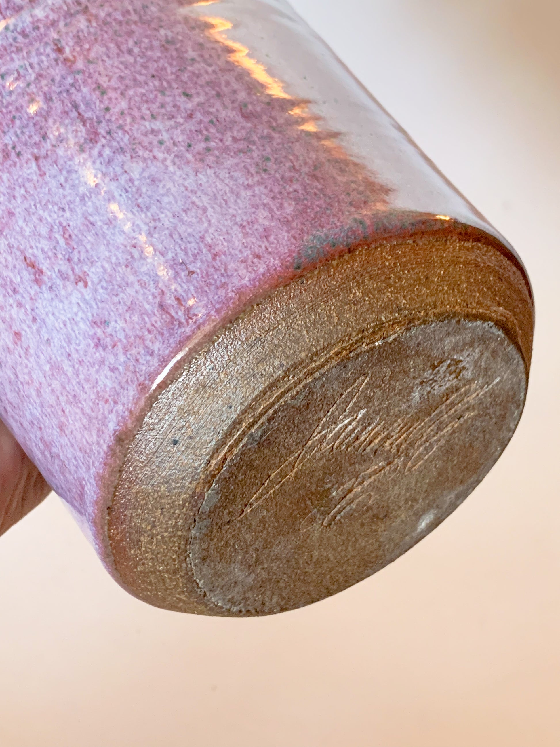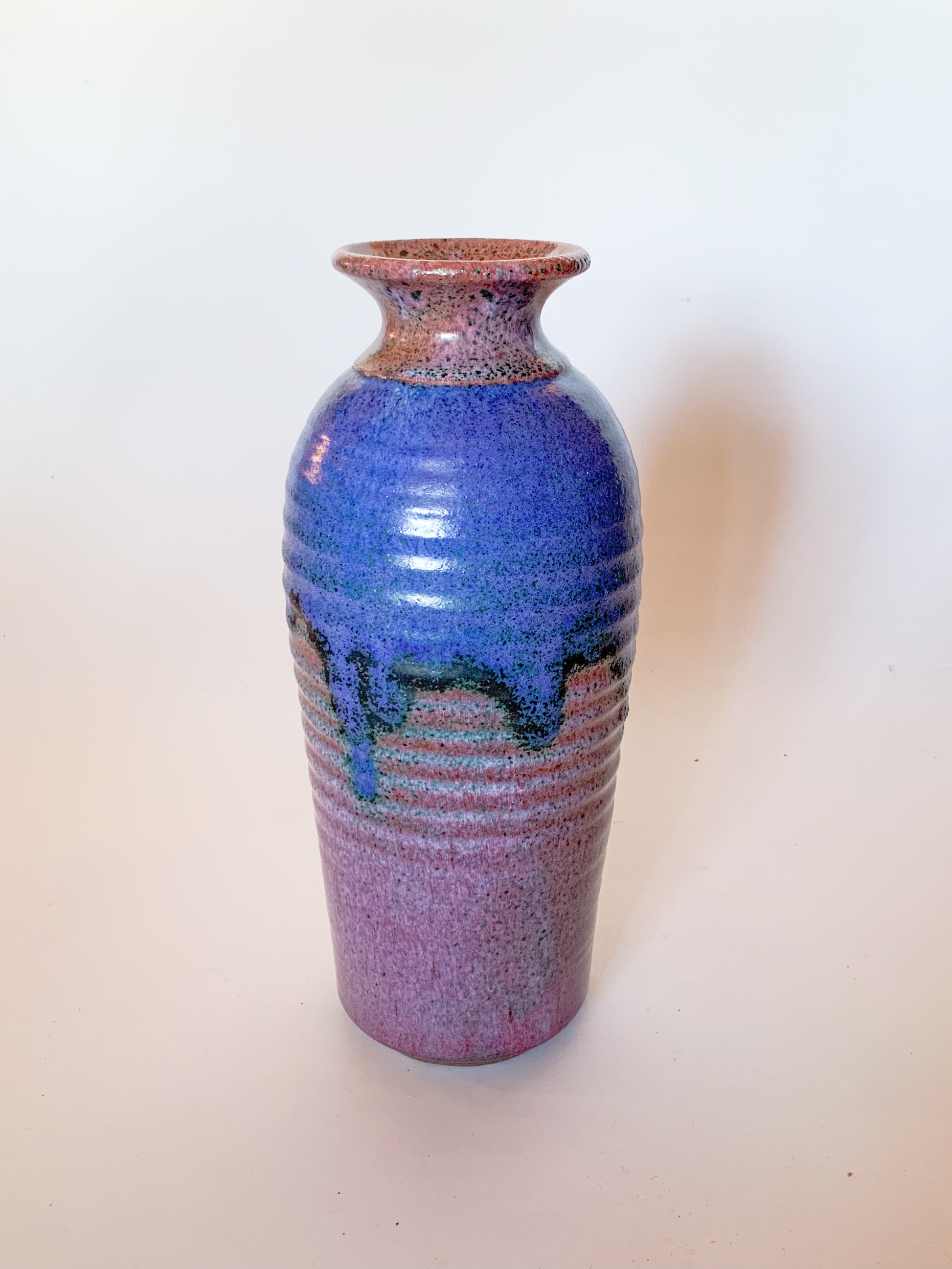 The star on this beautiful studio pottery vase is the unique glaze over the sculpted ribbed sides. The drips and speckles and layers of purple glaze are very artfully done. This piece is signed on the underside by the artist, and what looks to be '56 date.