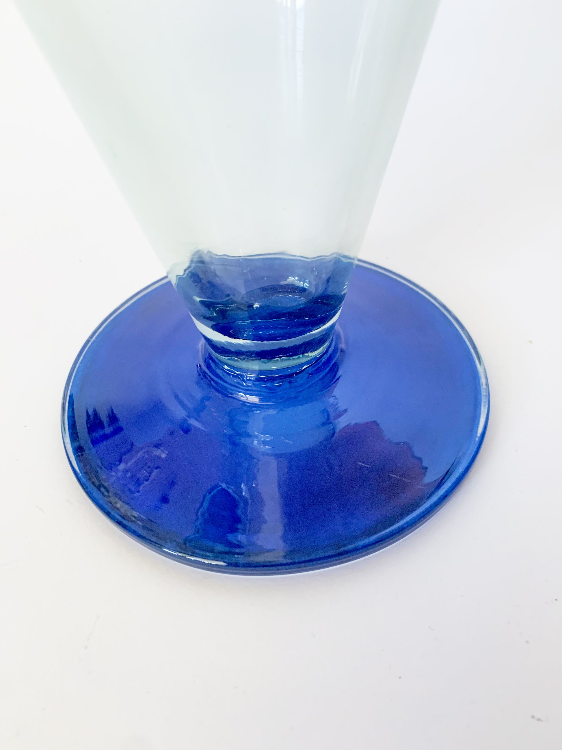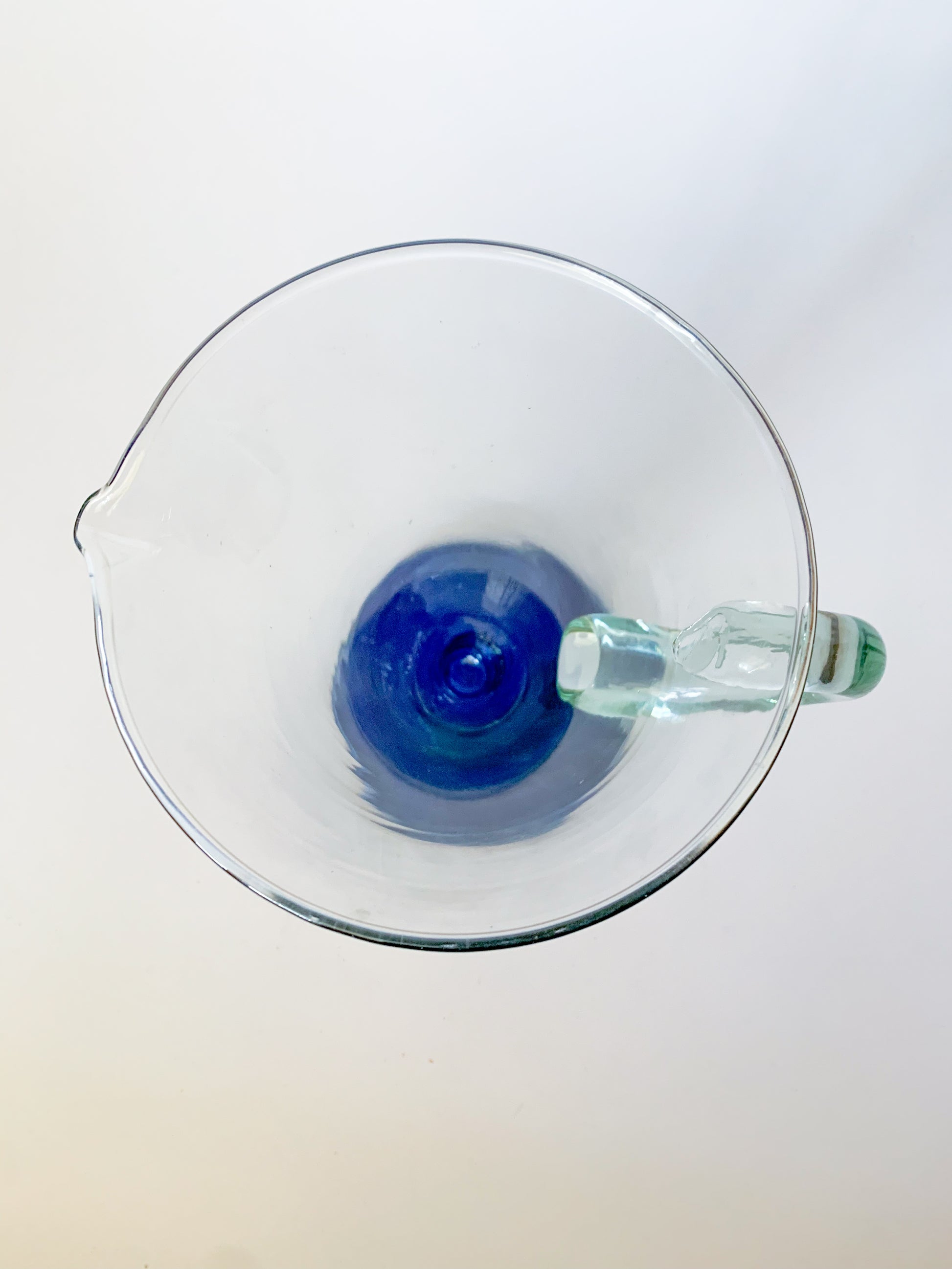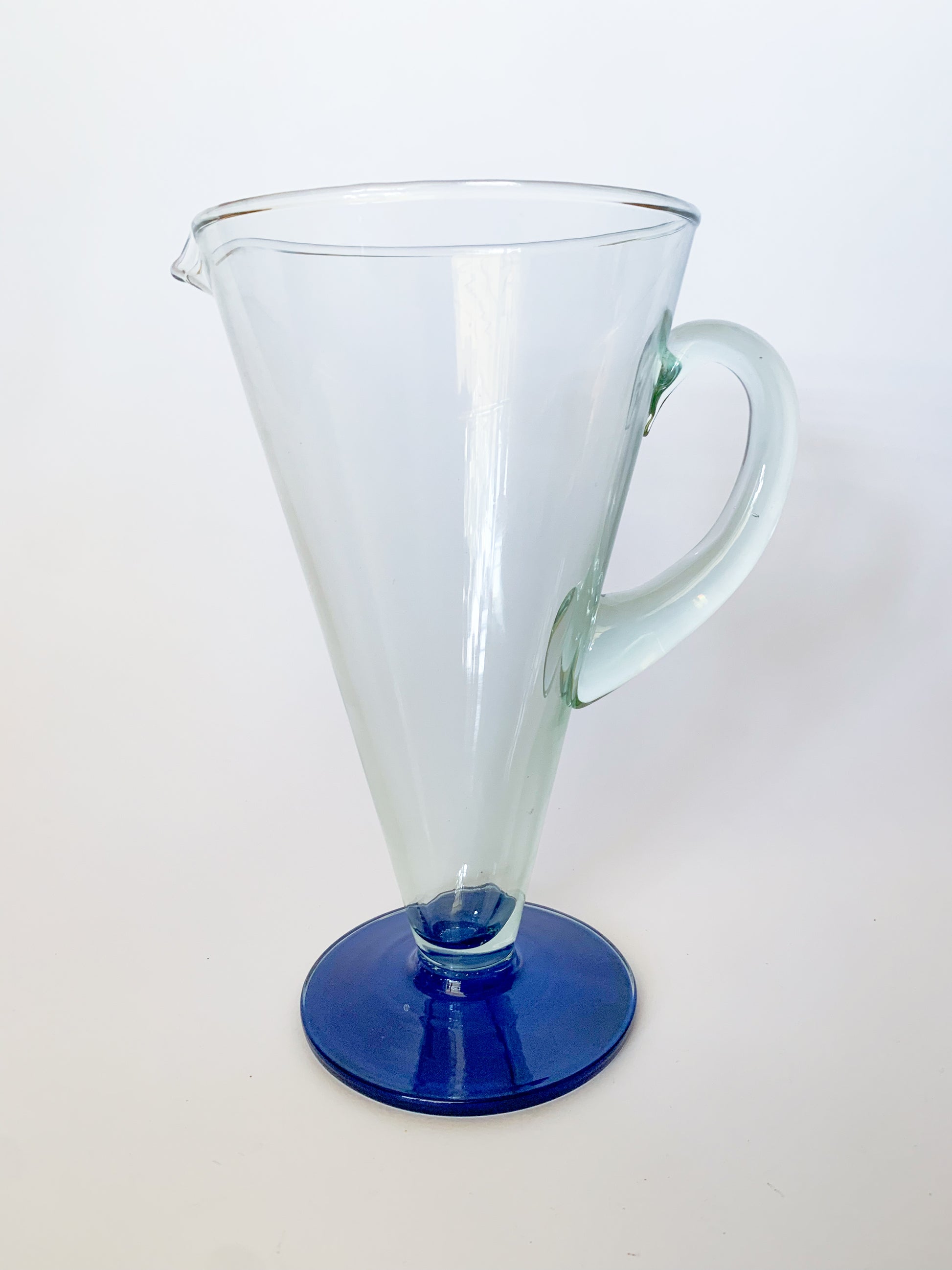Fantastic mod style 1950s Spanish large blown glass jug pitcher with slight blue green tint to glass, and blue base/foot. The blue on the bottom is original, and possibly painted on, but in excellent condition. A very refined and modern design that would make an excellent addition to a bar or used as a vase.