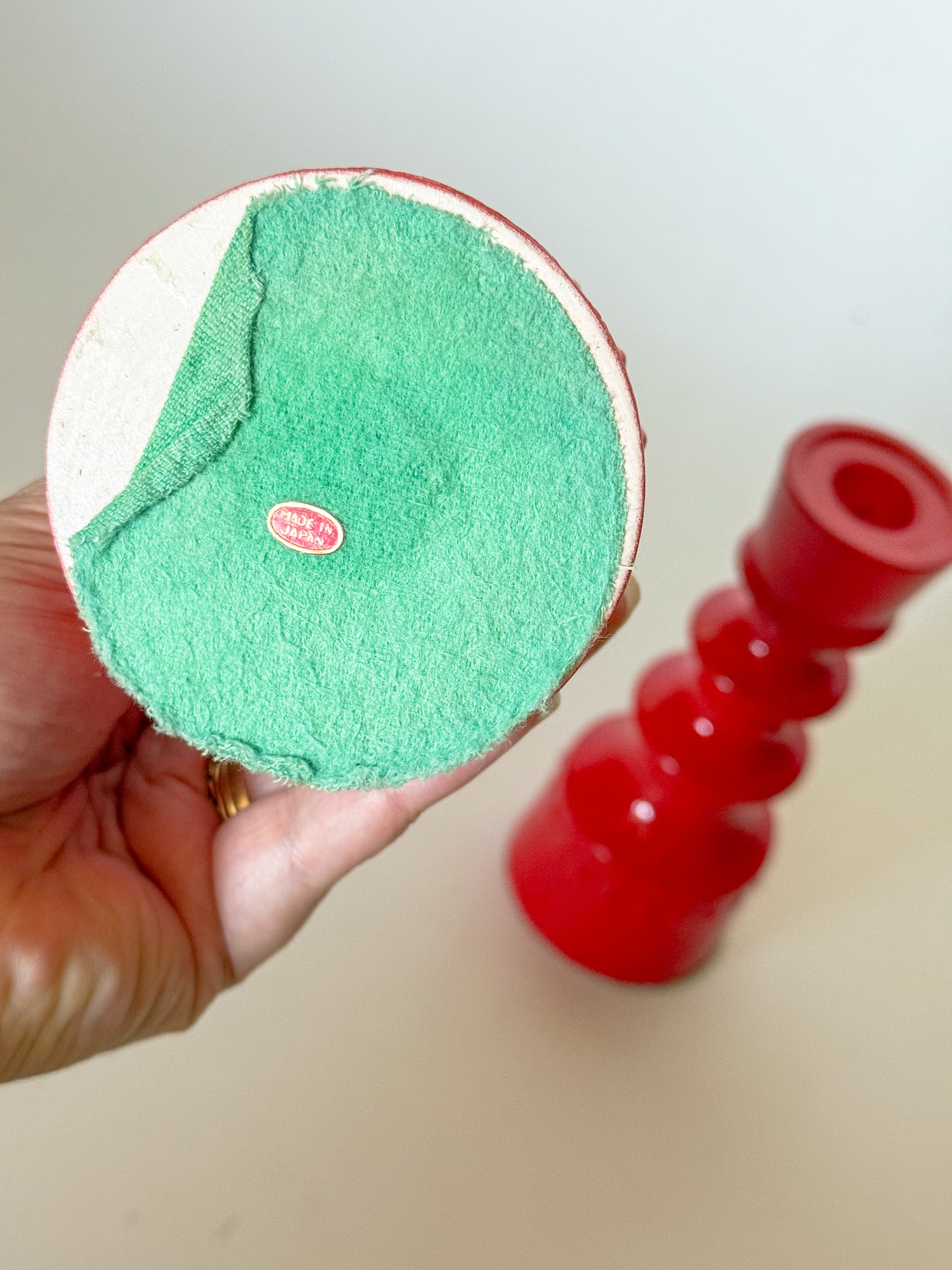 Fantastic vintage Scandinavian red ceramic taper candlestick holders with a Mid Century Modern turned ring style shape and diamond stud band motif around the base. This pair is the perfect unexpected pop of red in a space, and a great Scandi-modern style that works well with a variety of decor styles. Very chic!