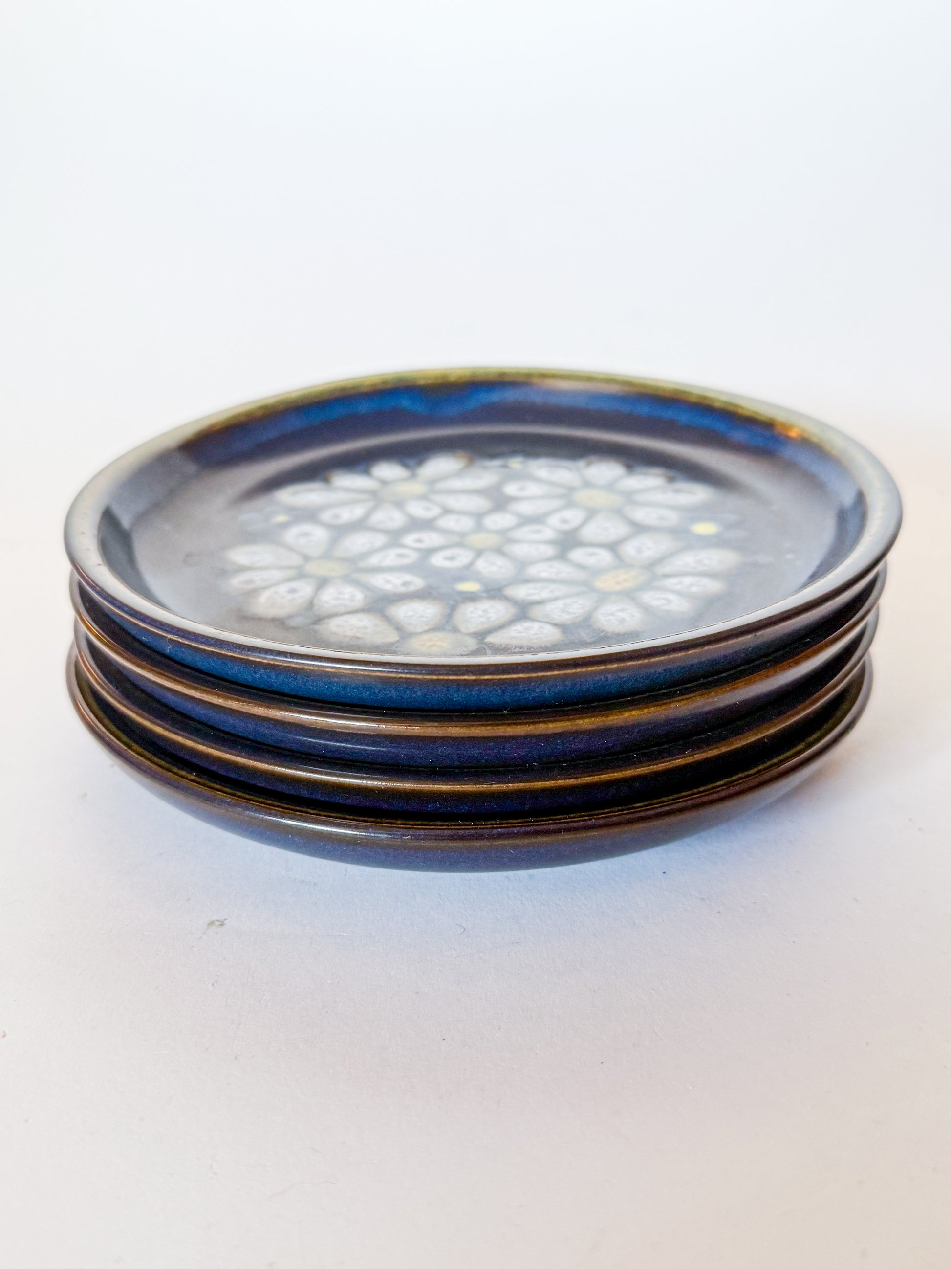 Charming set of four vintage 1970s Denby Kismet Blue daisy bread and butter plates. The background of the stoneware is a rich navy blue with a yellow and white daisy pattern in the center. Crafted in England, vintage Denby can be a rare find in the US.