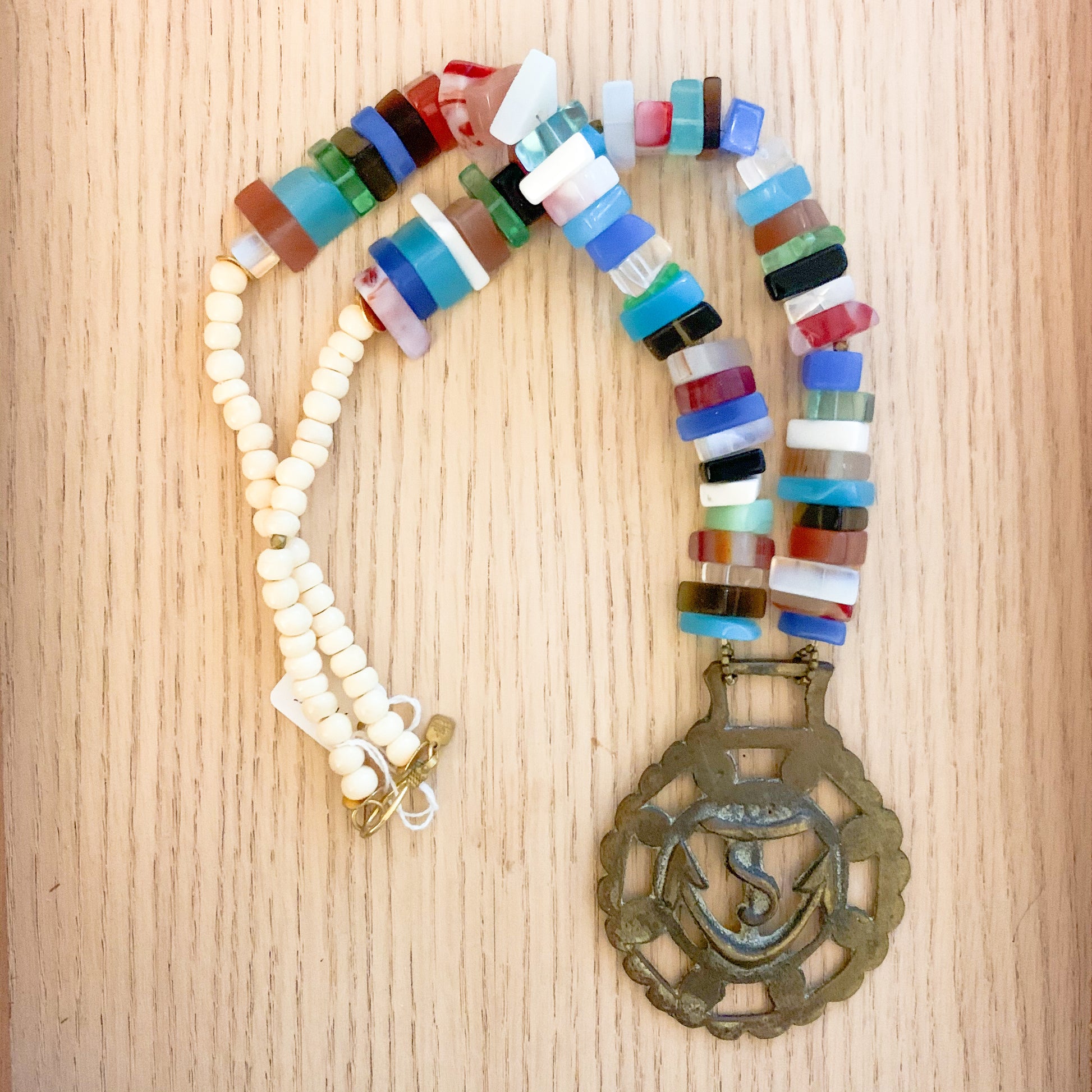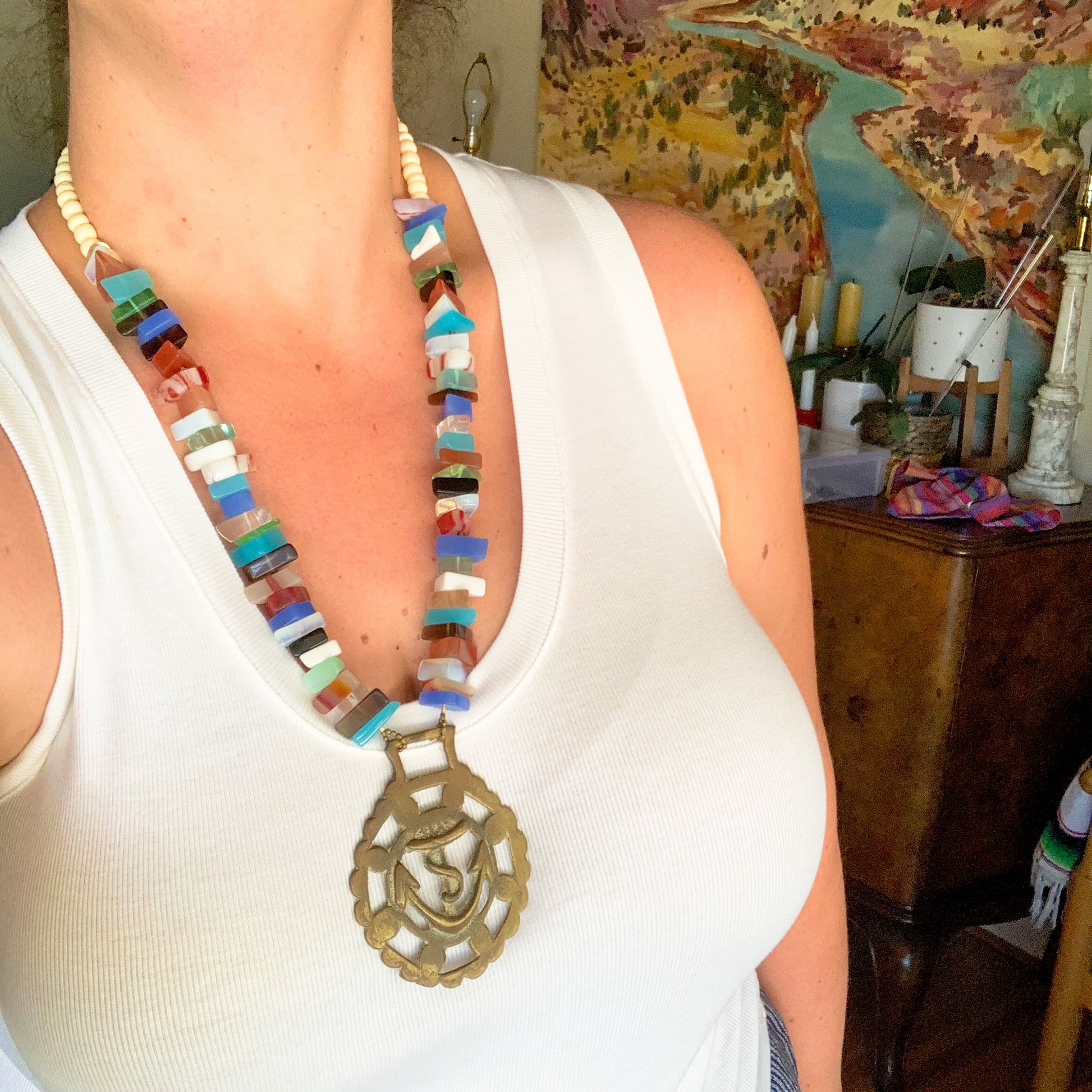 Steady and calm, deeply anchored in truth. A classy statement piece featuring a vintage brass equestrian medal with colorful quartz nuggets and bone beads.
