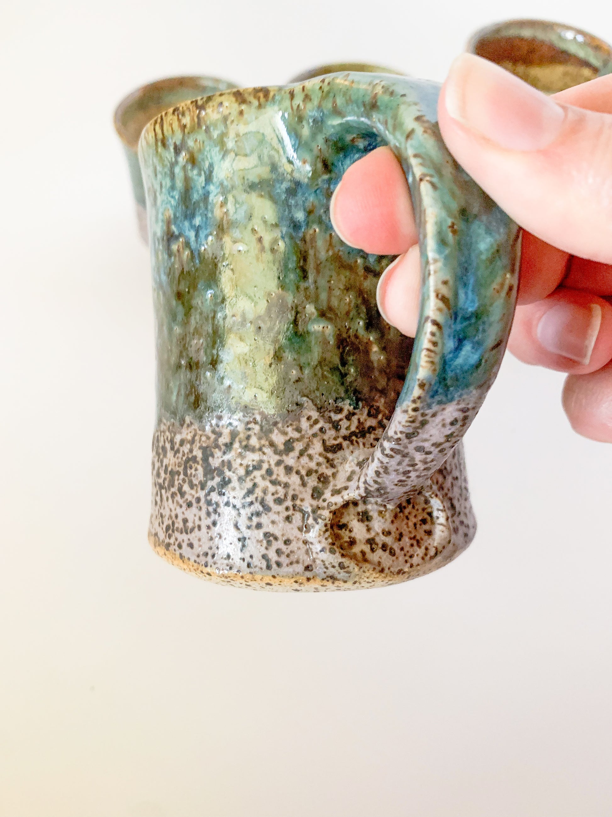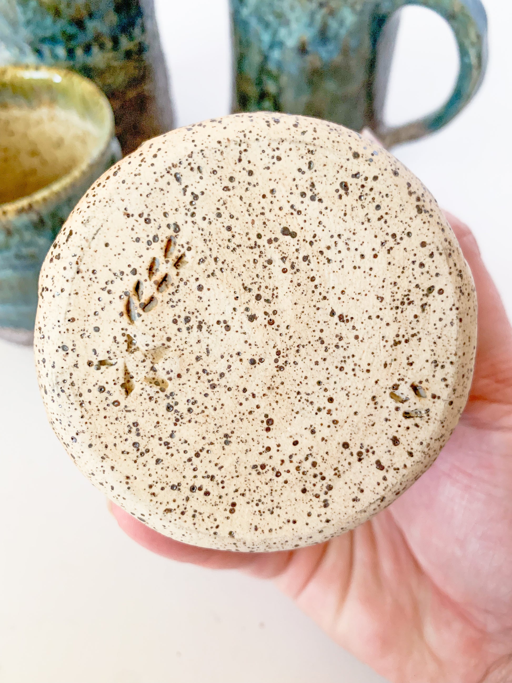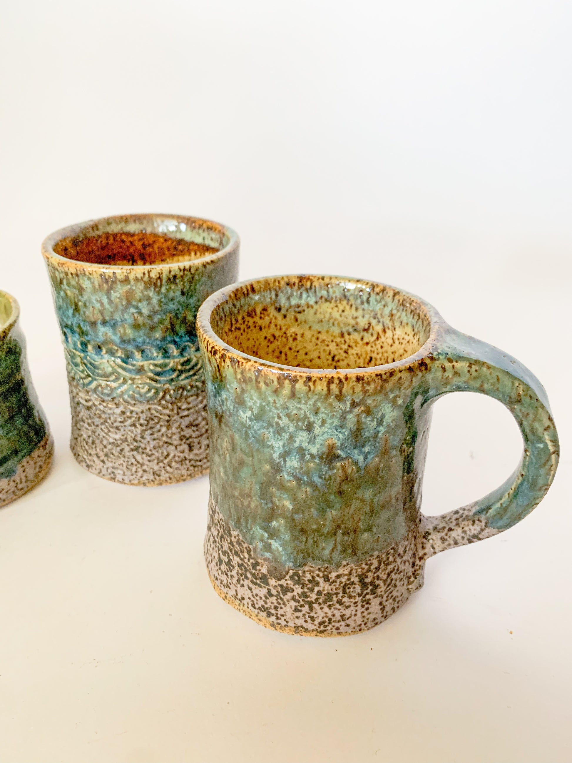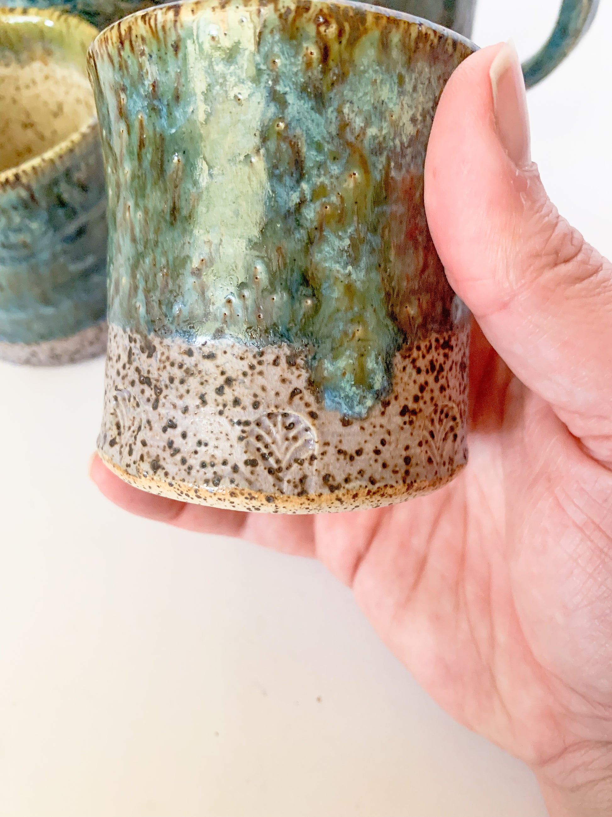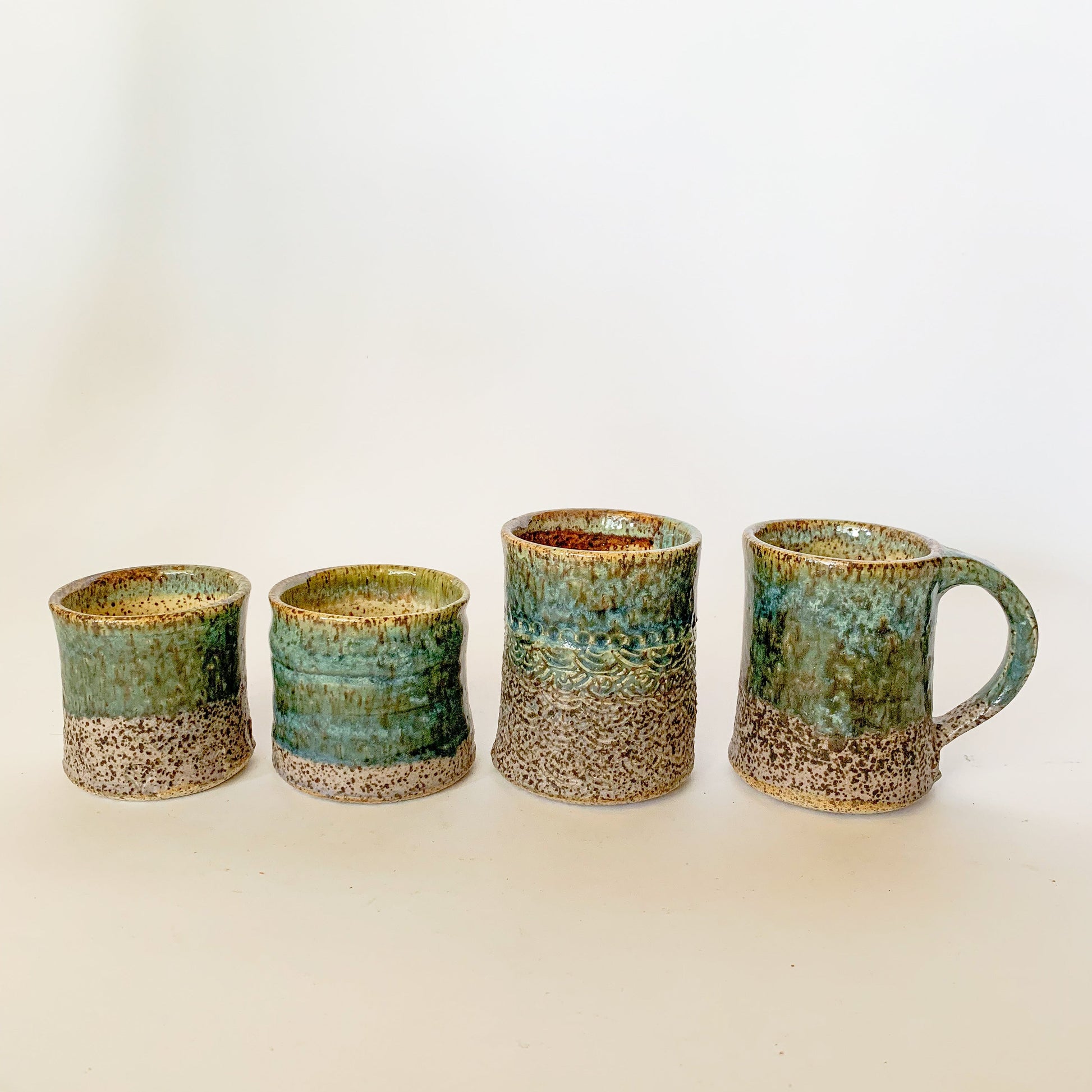 The perfect "Starter Set" of mugs! These would make an excellent wedding or housewarming gift for the coffee lover. Just pair with a bag of local coffee, and they will be in heaven. I love the speckled clay and design impressions around the base. This handmade set features a pair of regular size mugs, one with a handle and one without, and then two smaller mugs without hands that are the perfect size for a cappucino or cortado.