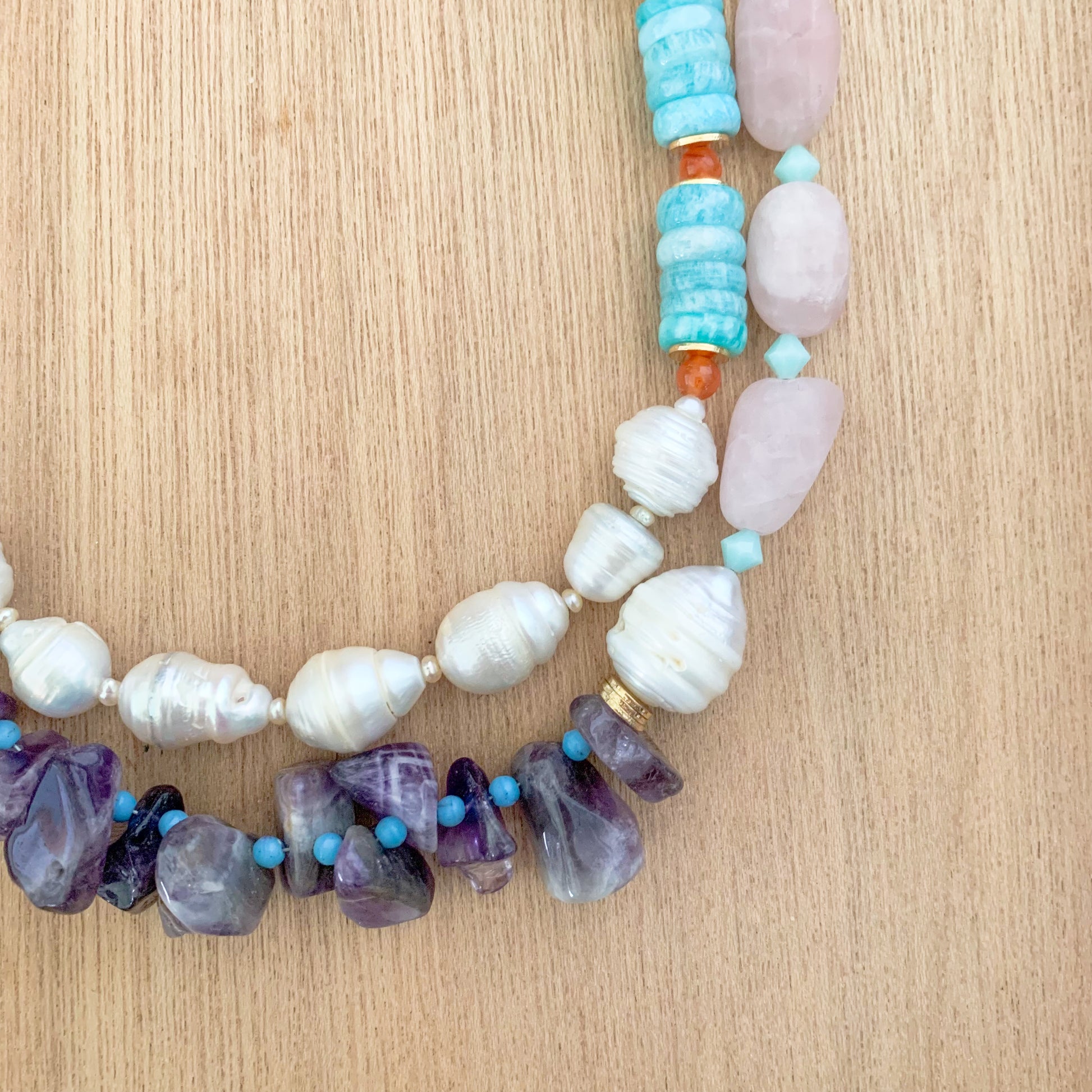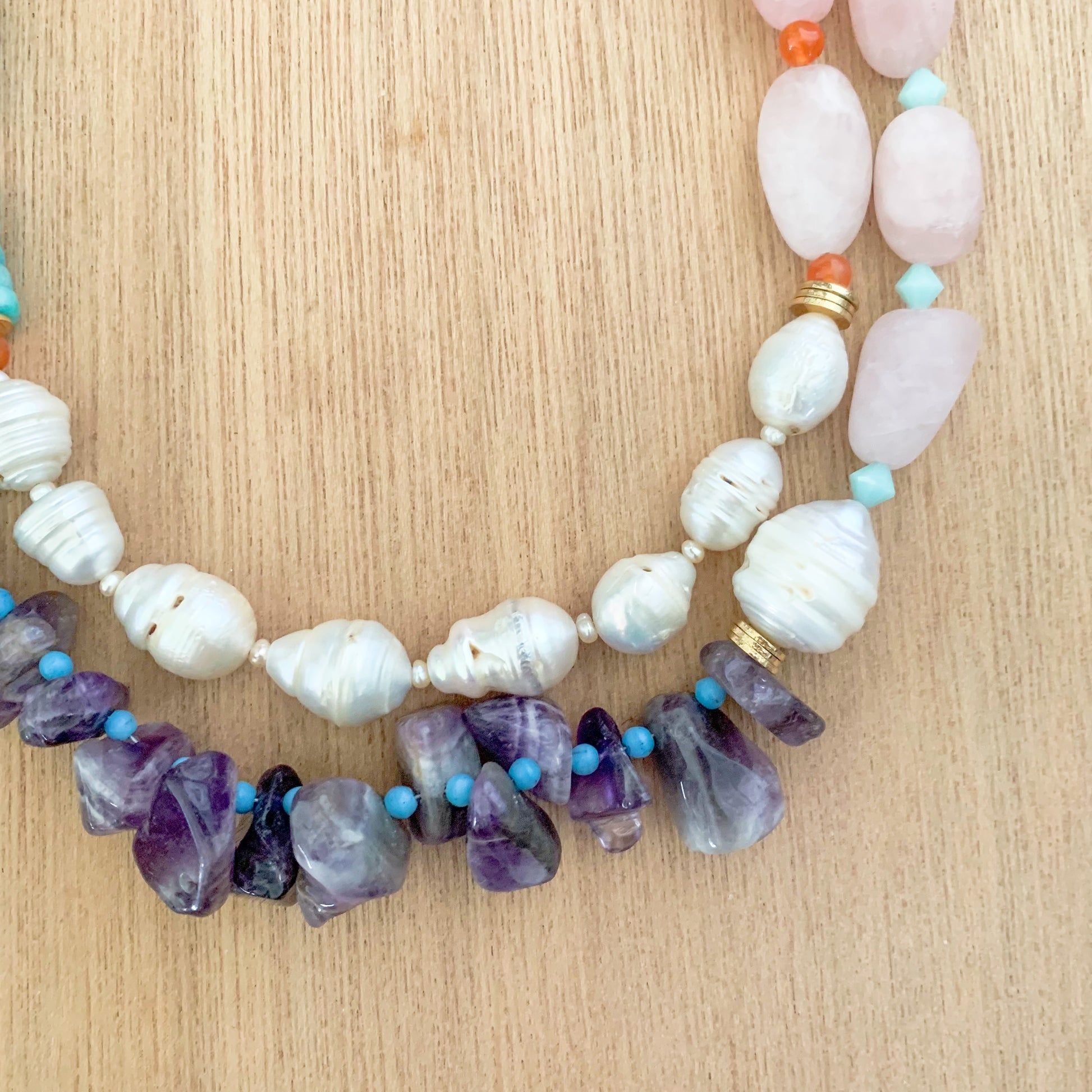 Amethyst, Amazonite, Rose Quartz, Carnelian, and luscious baroque pearls OH MY. The gemstones in these necklaces are stunning. Layer a couple together for a more decadent look.