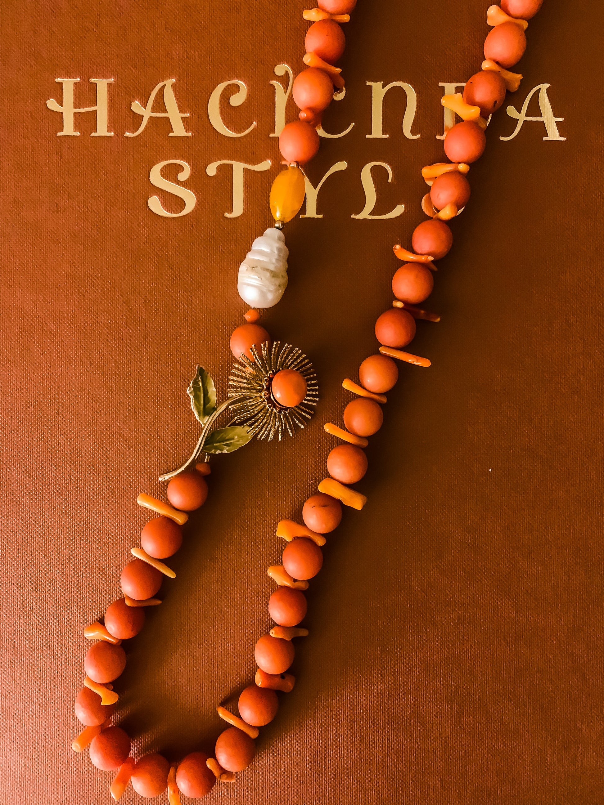 Matte orange jade beads are paired with orange coral branches and a charming vintage Warner flower brooch with an orange jeweled center. A cheerful statement for any season!