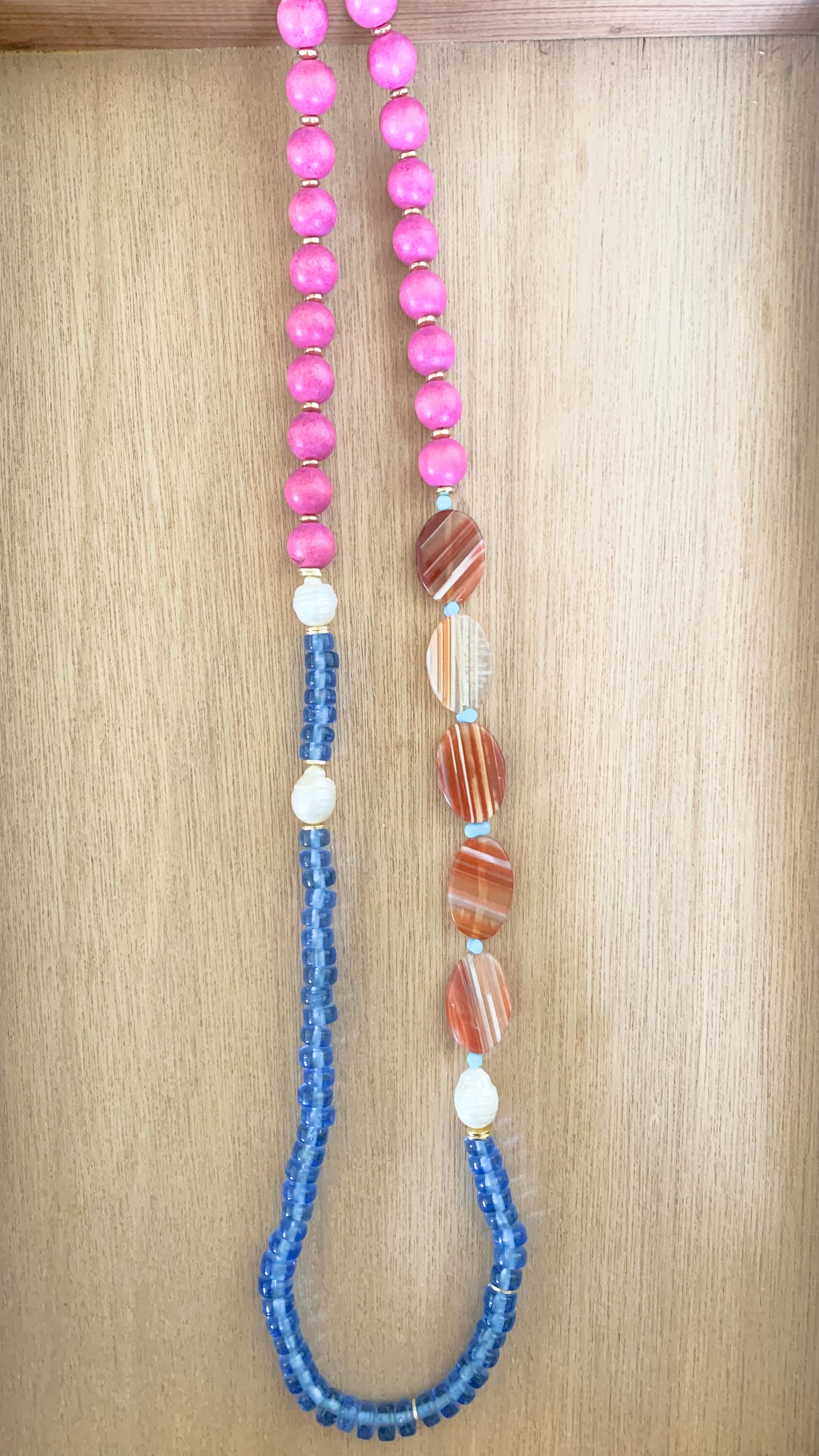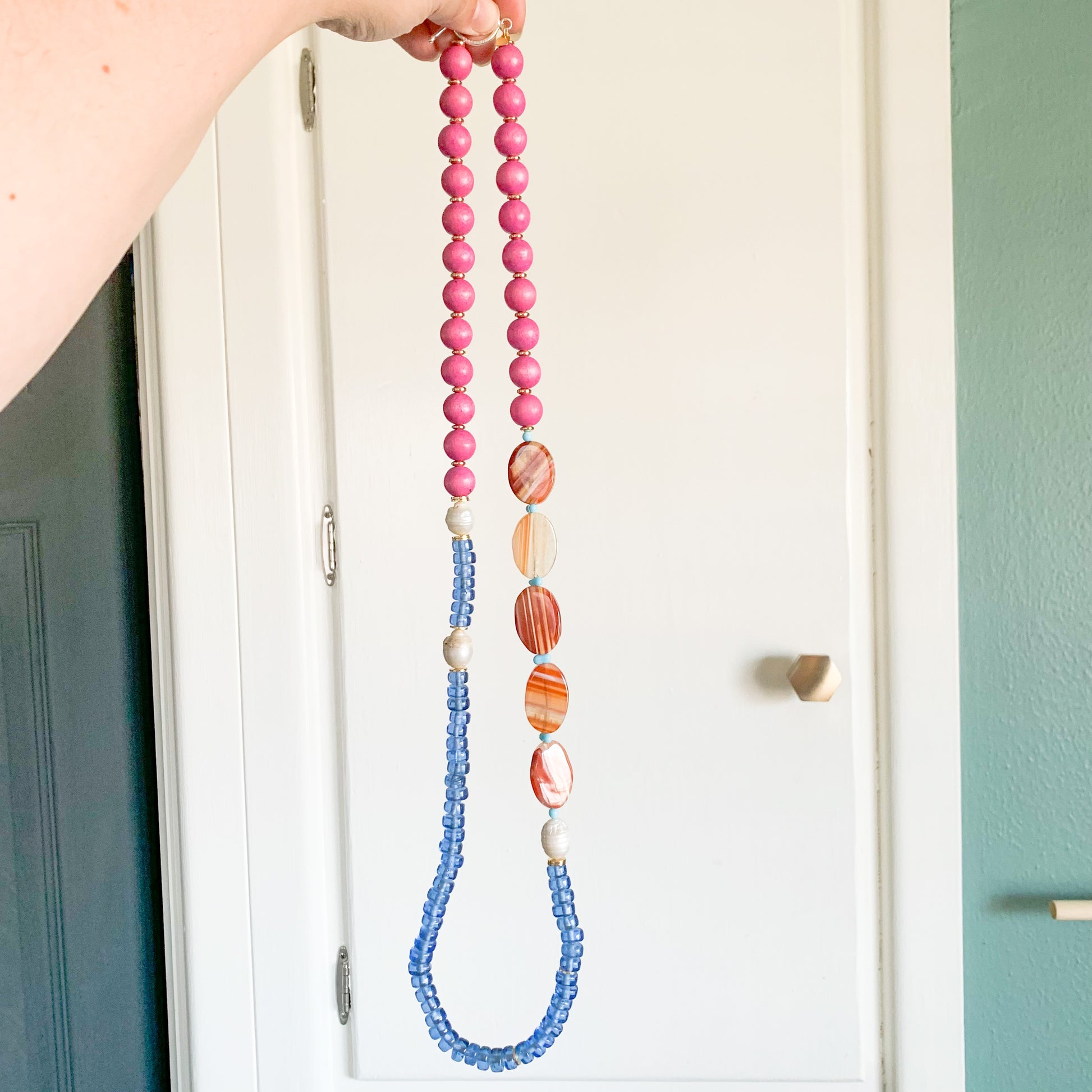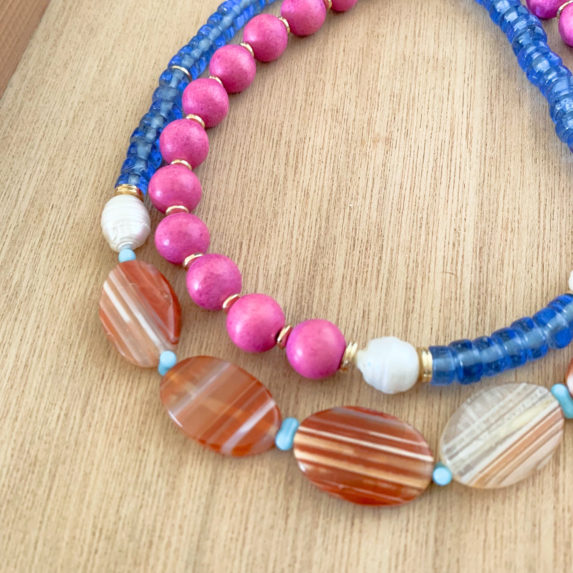 Baroque pearls combined with periwinkle colored glass beads, orchid pink wood beads, orange swirly agate gems, worn long or doubled for a short and smart look.