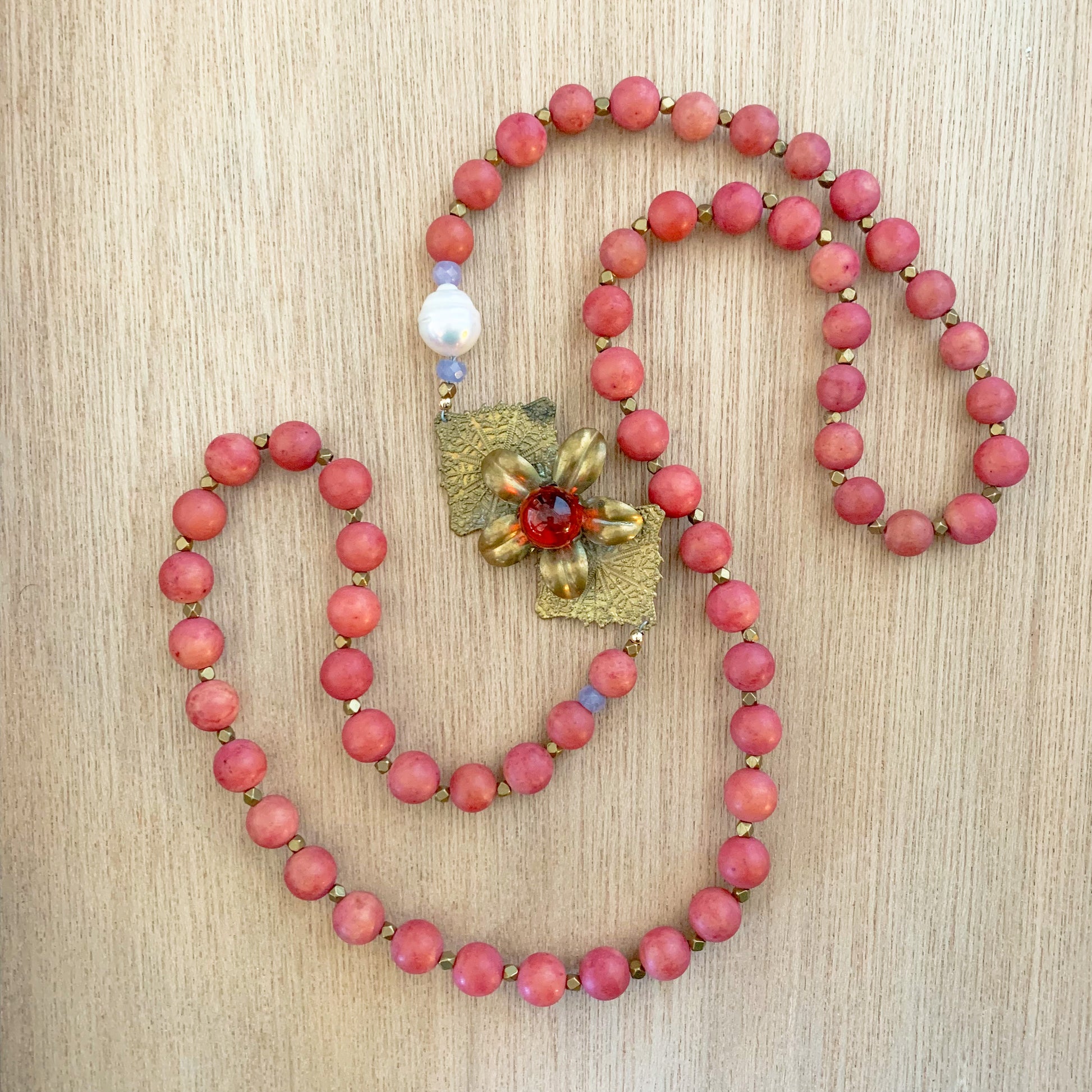 Matte brick red beads are paired with faceted brass and an antique brass Victorian pin with a red jeweled center. This stunning pin is likely an art deco piece from the 1920s!