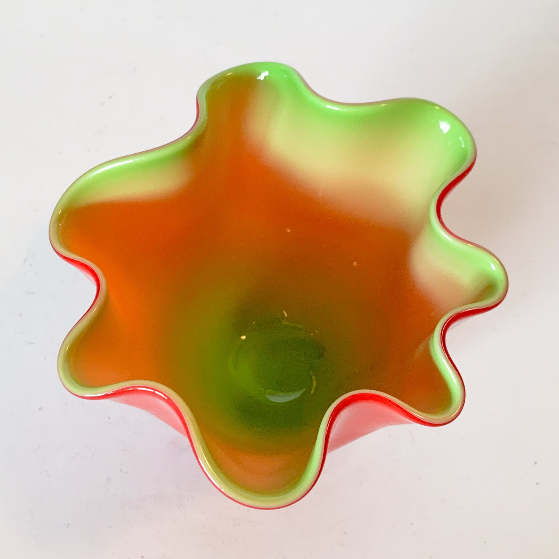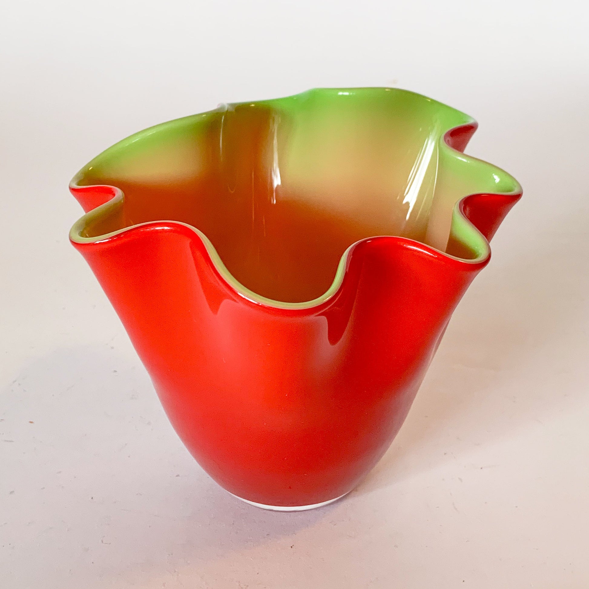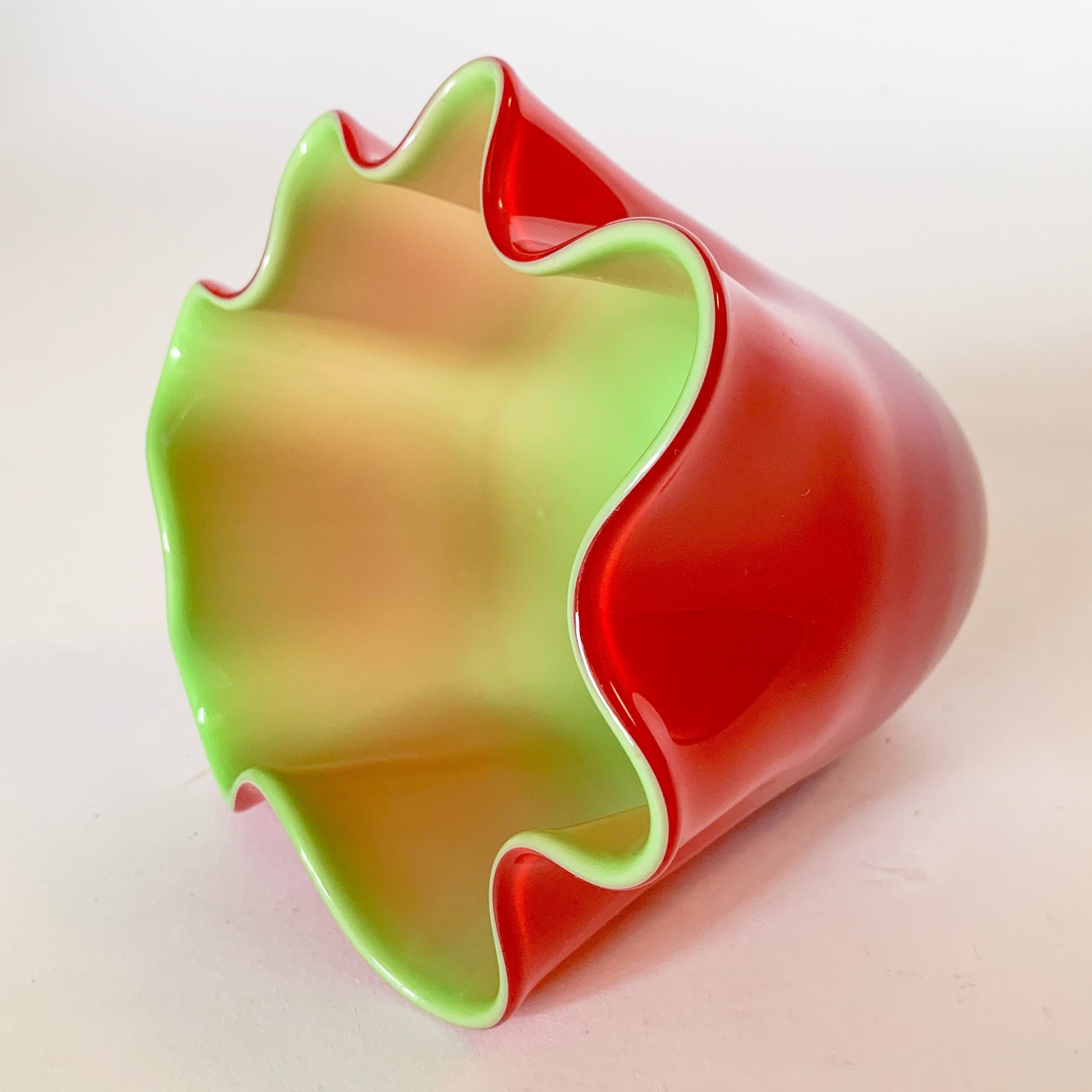Blown Glass Fazzaletto Handkerchief vase in the style of Venini, in beautifully vivid red exterior and bright green interior. Polished pontil mark on bottom.