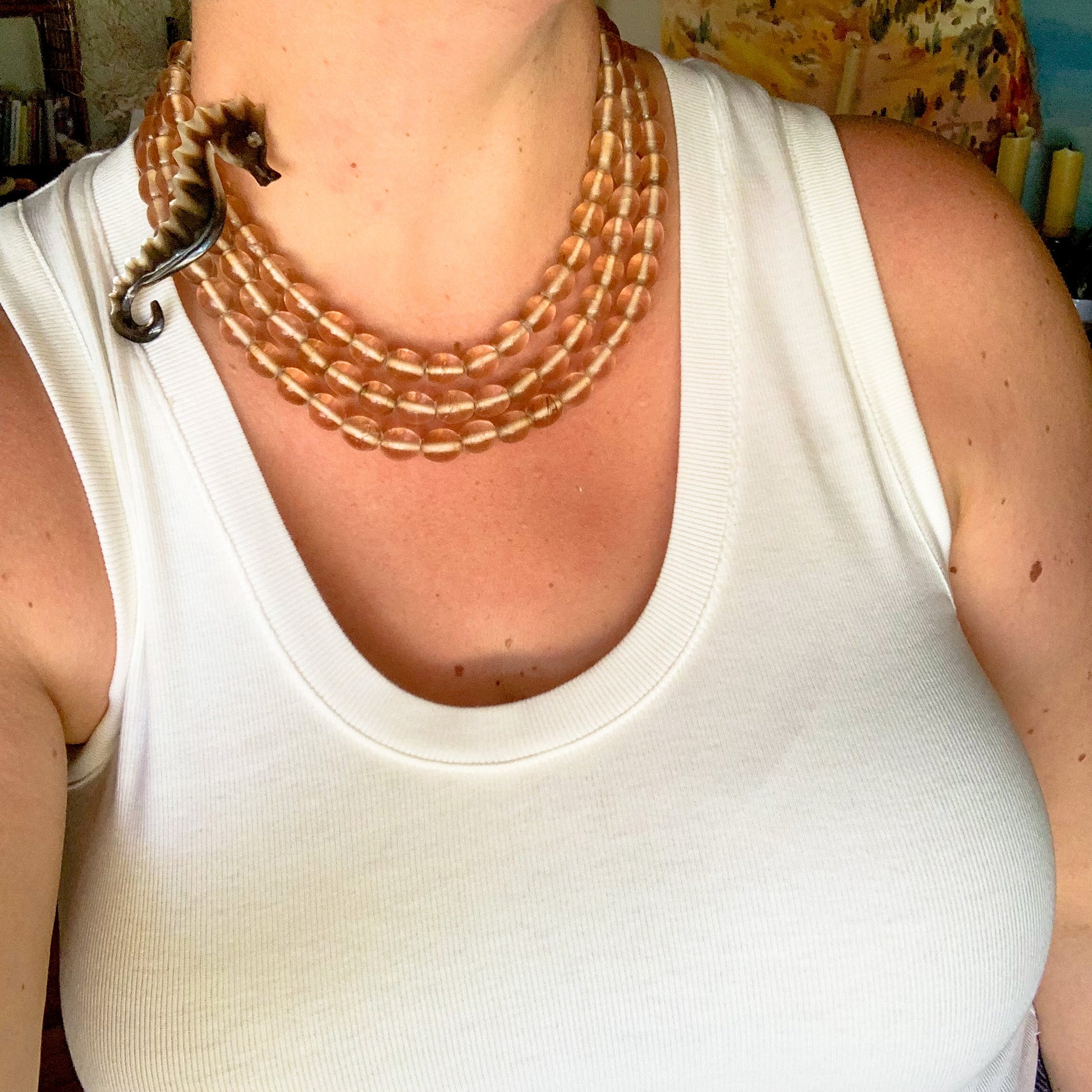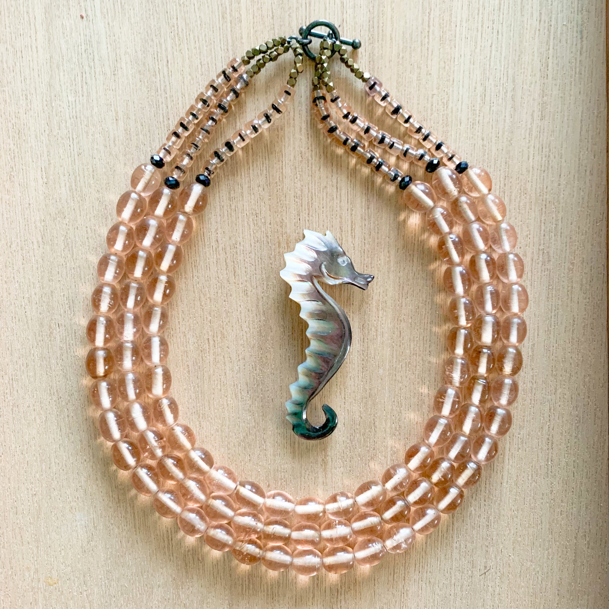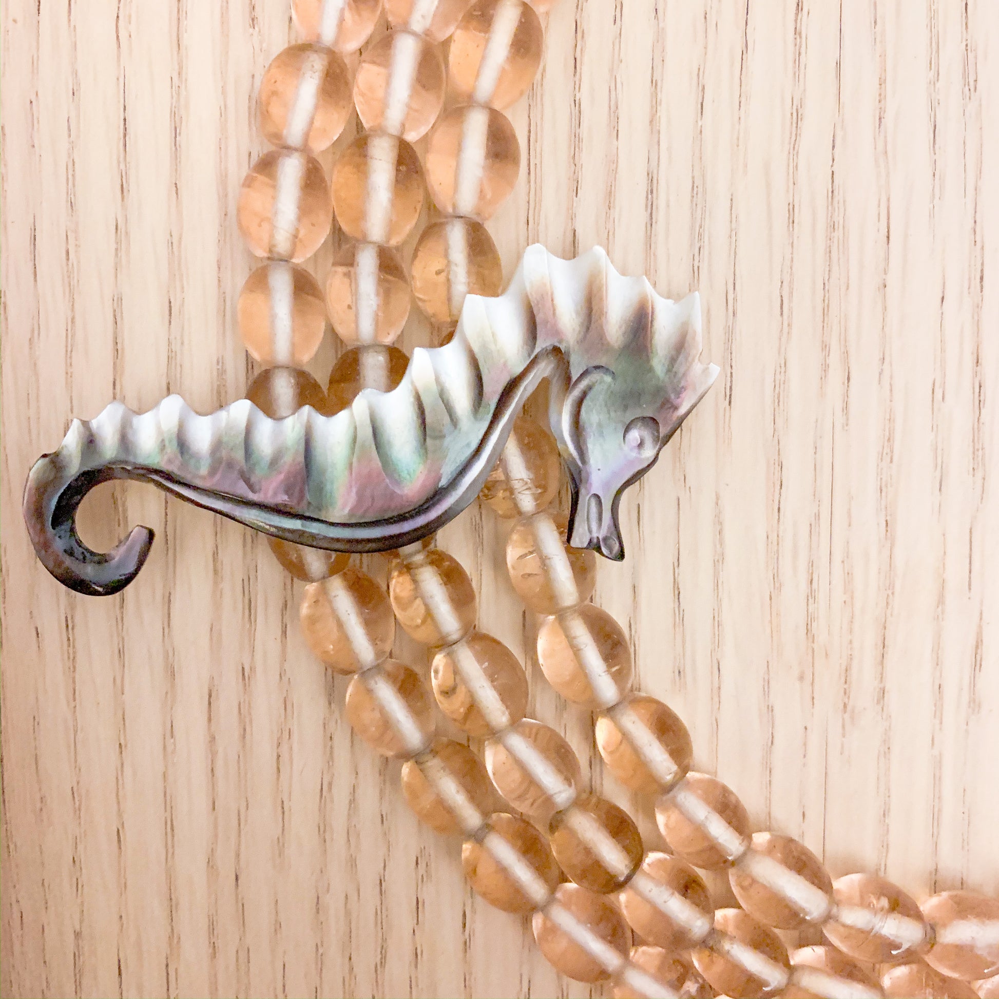 There isn't much sweeter than watching a soft pink sunset at the beach, with the reflections mirrored in the glassy ocean. But this charming sea horse may be a close second. Carved out of mother of pearl, all of the soothing colors of dusk at the beach can be spotted in him as he moves about. Even though we think he's pretty cute, he is removable for a simpler look.