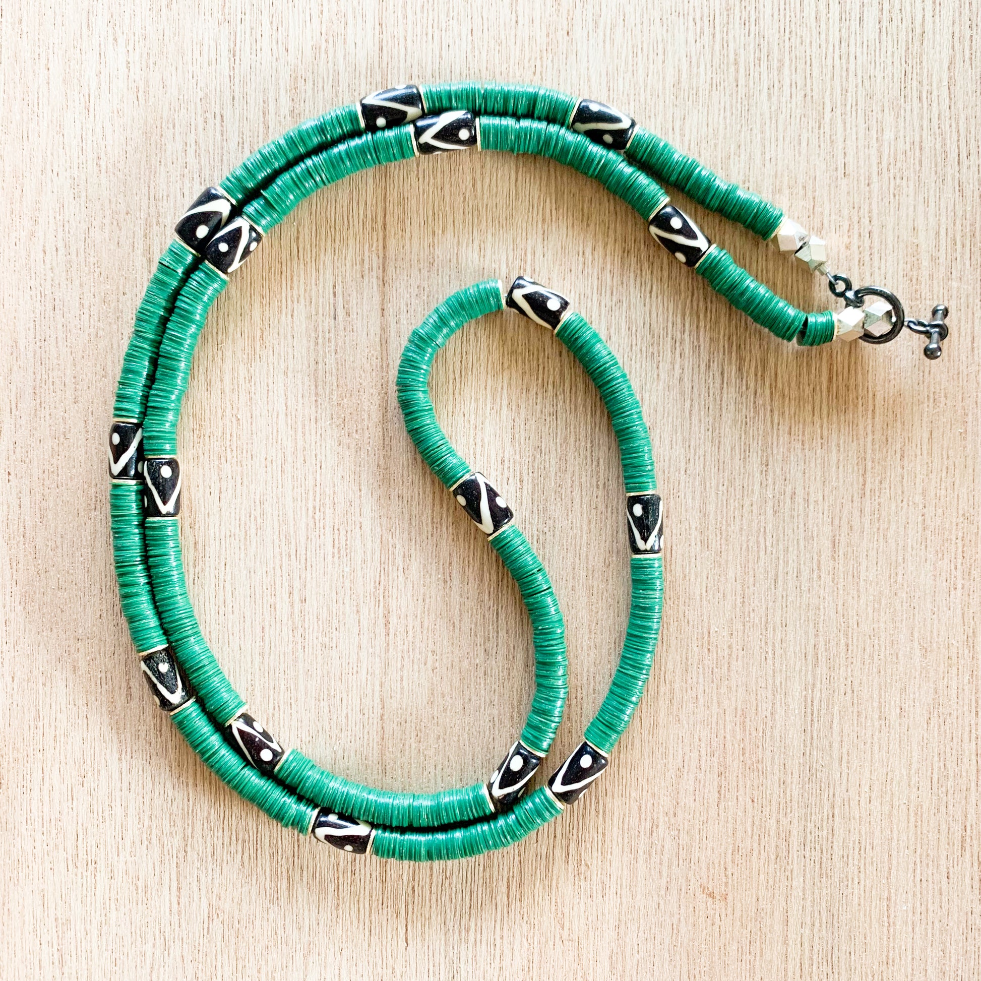 Checkered Layers: Green and Tribal Long Statement Necklaces