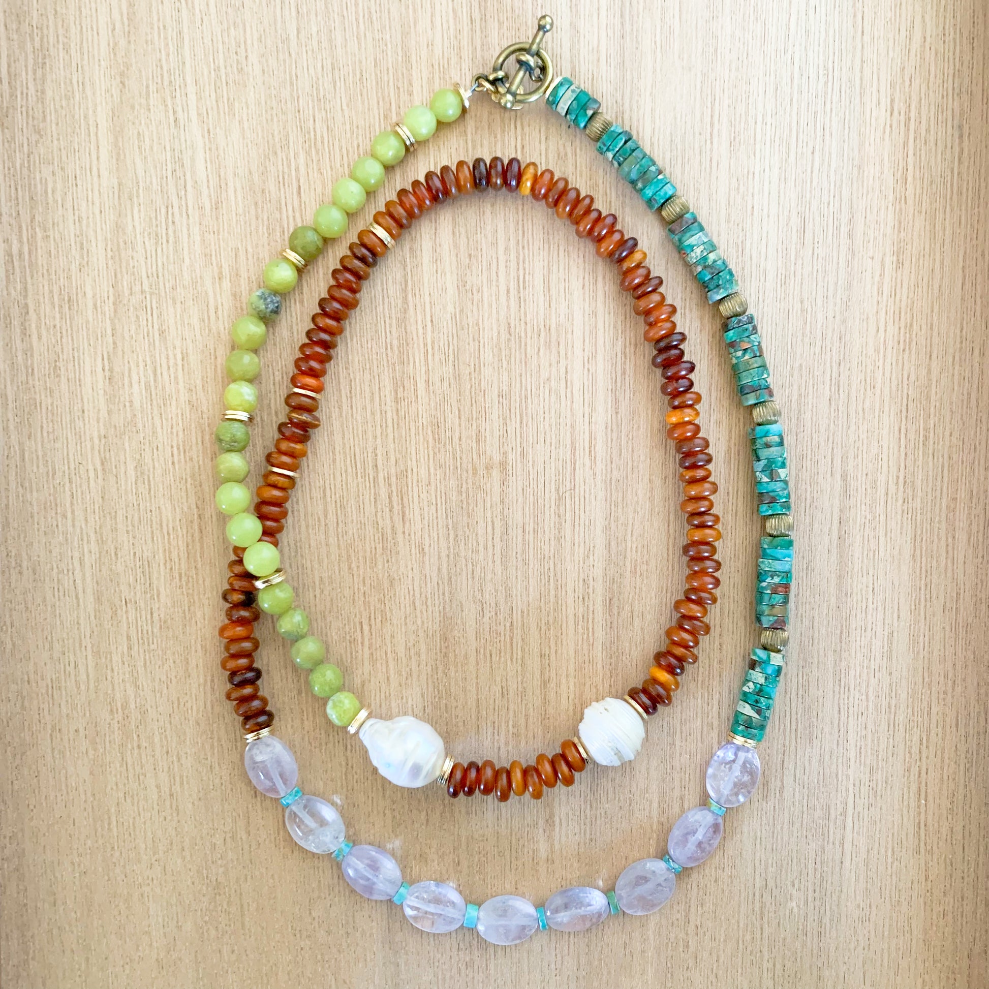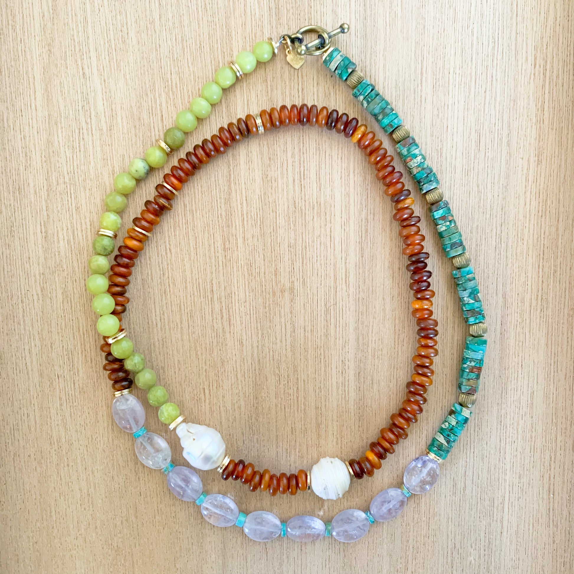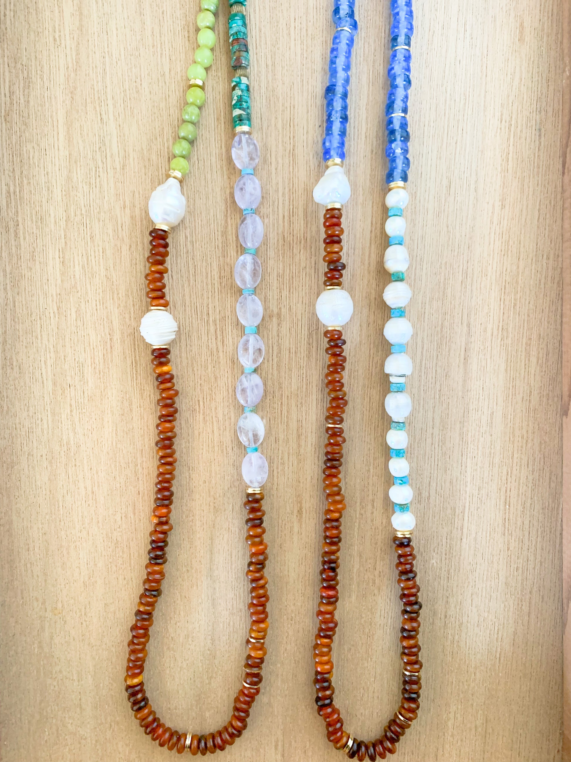 Baroque pearls combined with rust colored horn beads, pale lavender amethyst gems and turquoise slices, and green sea sediment jasper, worn long or doubled for a short and smart look.