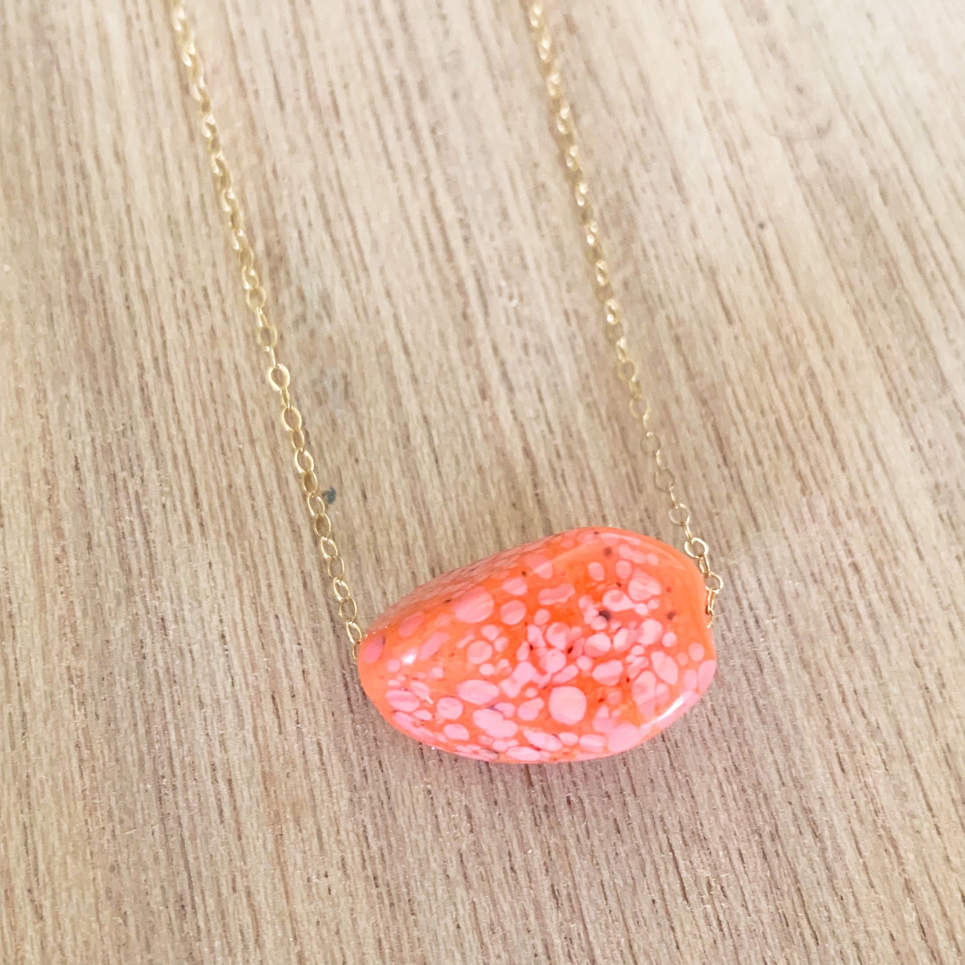 Choose your length on this dainty 14k gold fill chain to suit what fits you best! The sweetest speckled vintage coral glass bead from Japan slides along the chain creating a perfect summer staple.