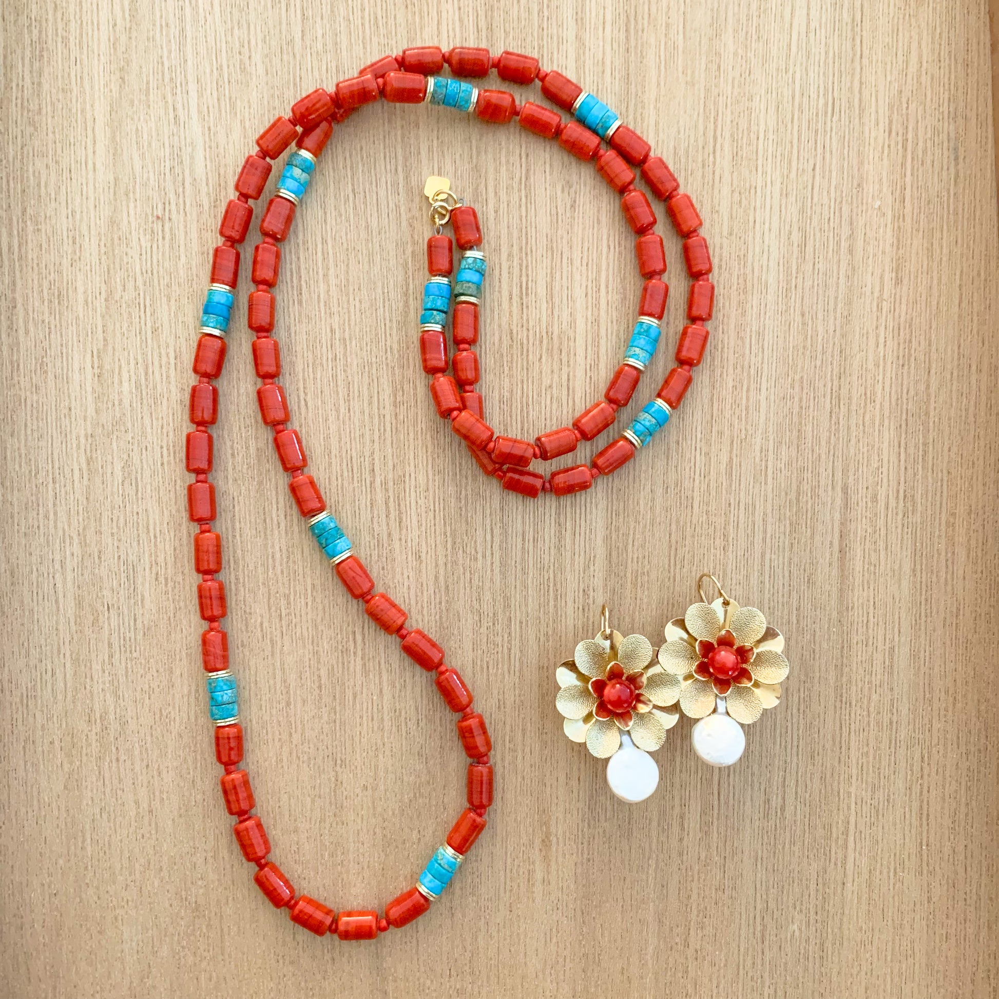 Red glass beads from Japan and turquoise jasper beads with gilt accents.
