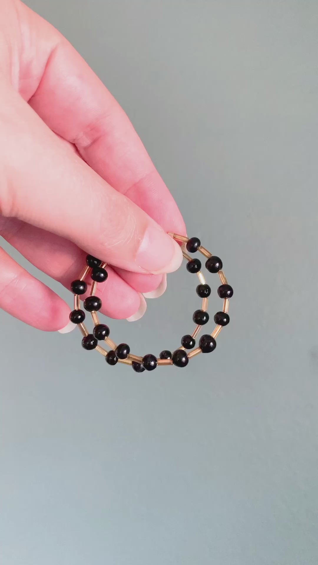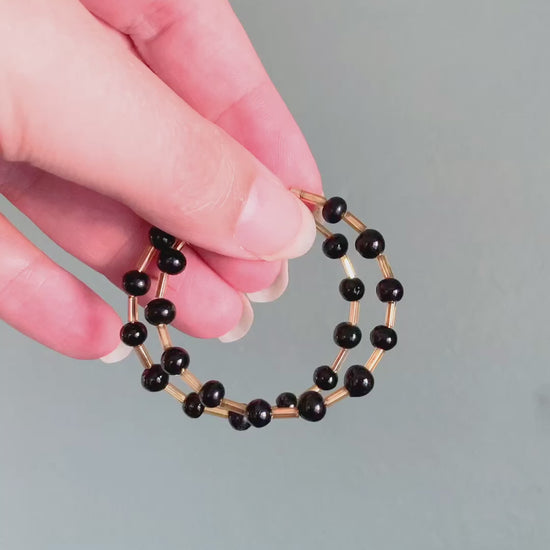 A whimsical black and gold hoop that features vintage black Czech glass beads on 45mm 14k gold fill hoops. These lightweight earrings are the perfect way to add a little shine and fun to any outfit!
