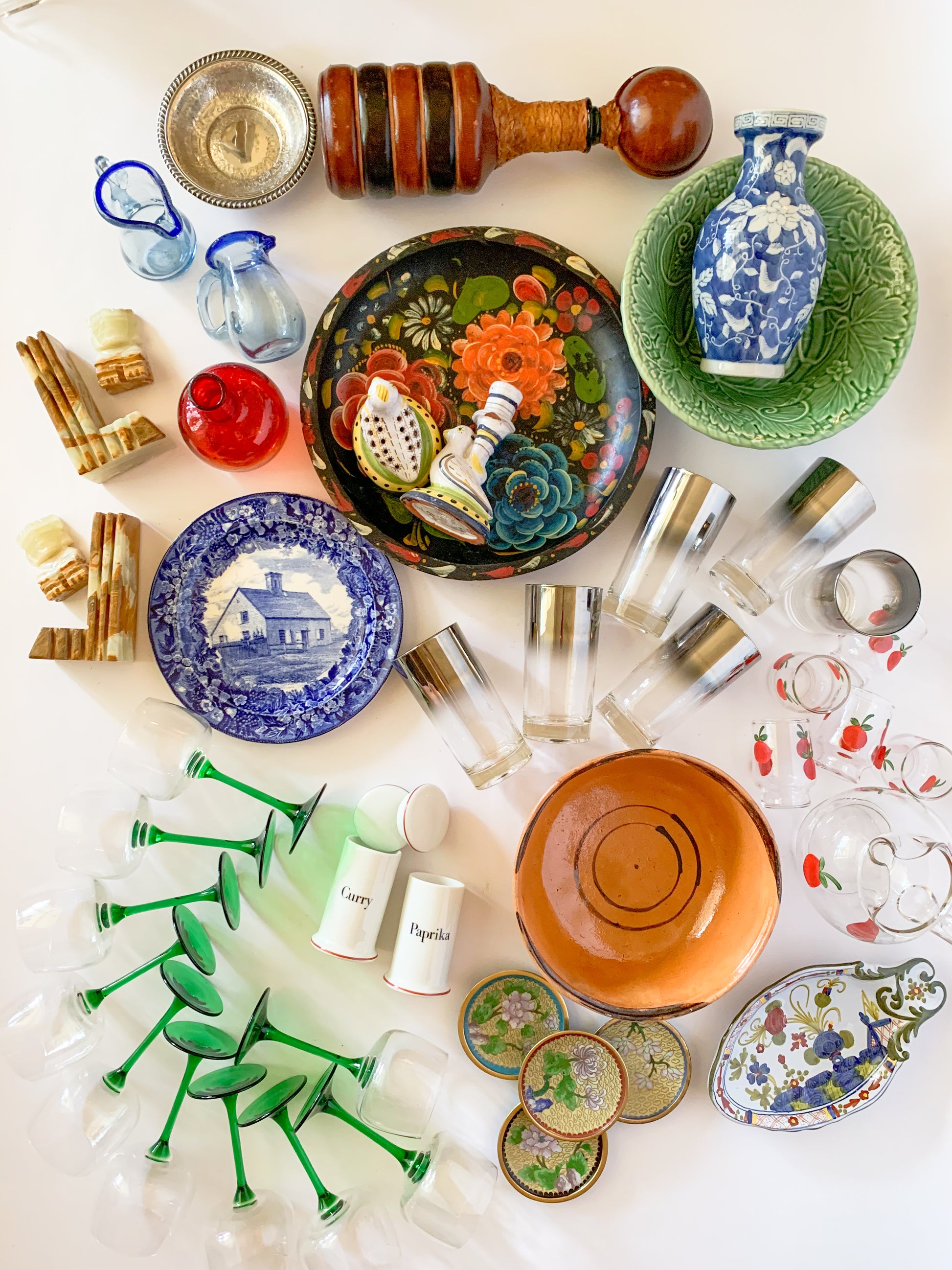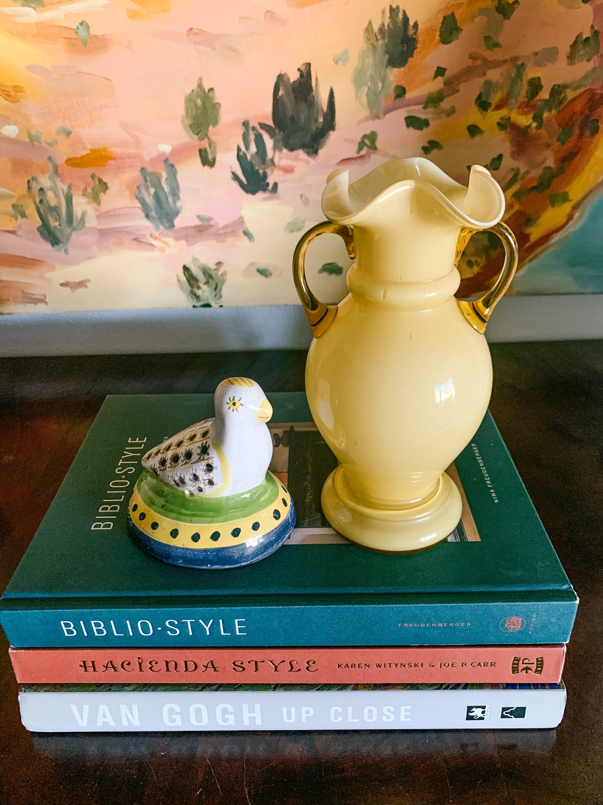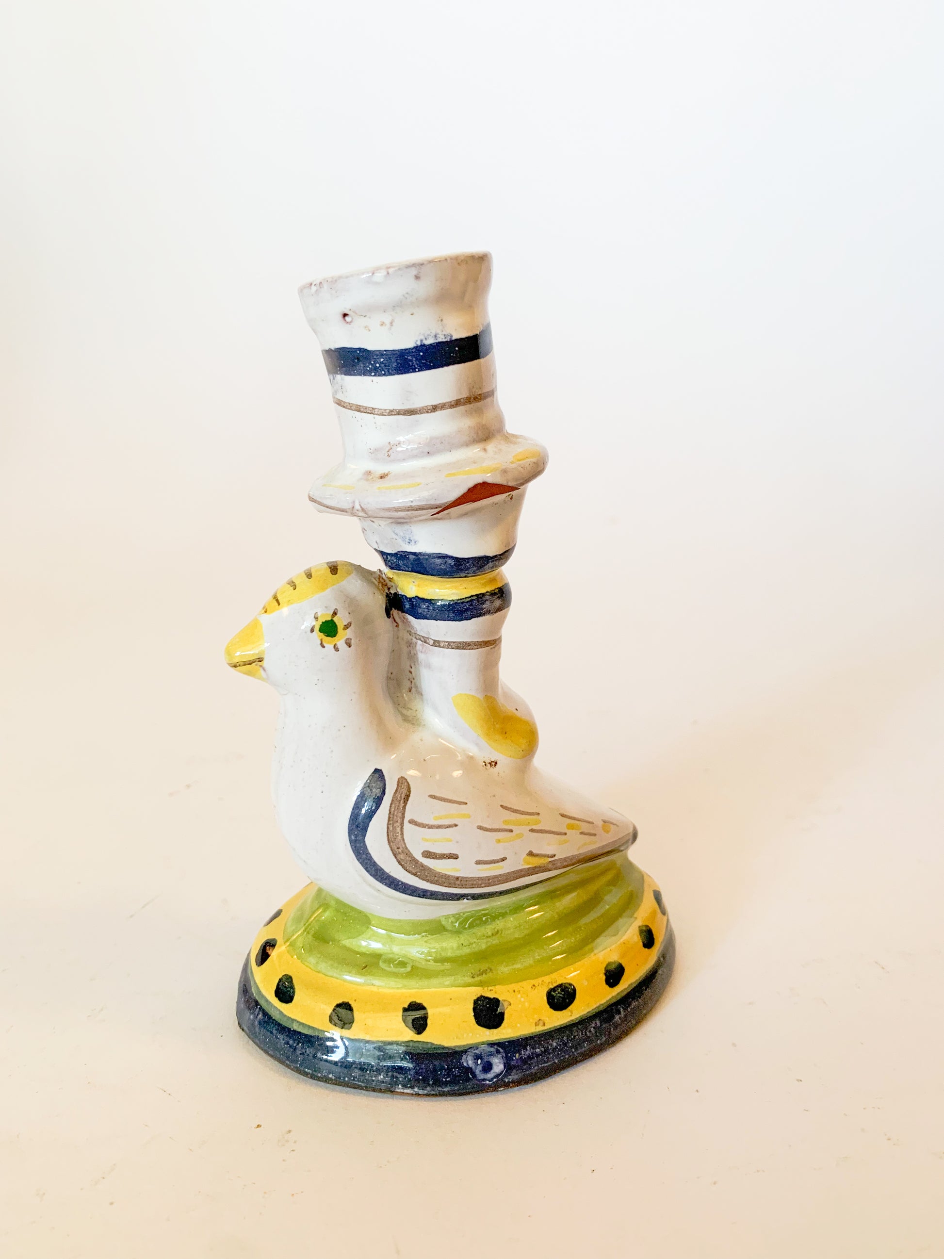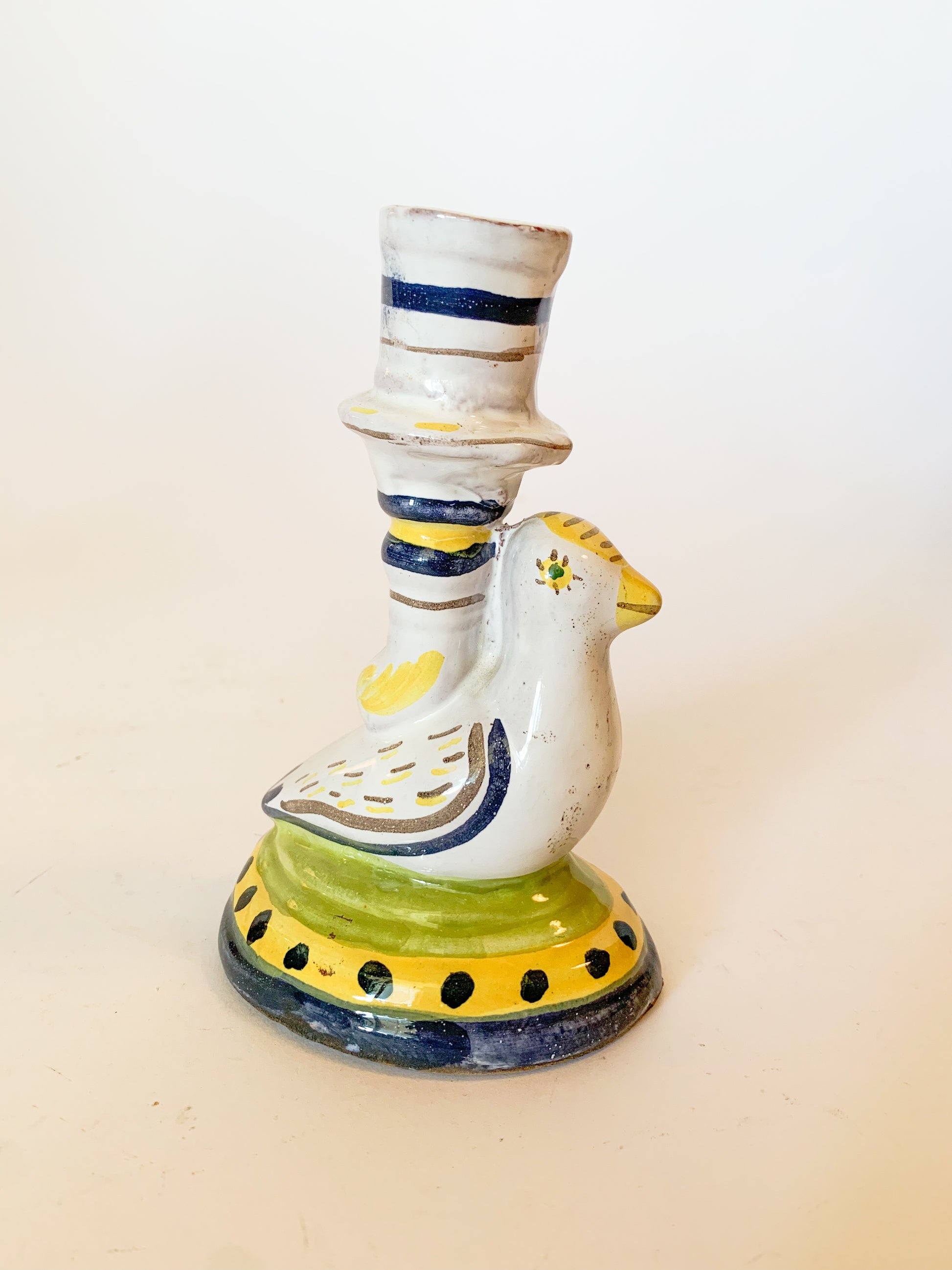 A lovely pair of Portuguese Faience Birds. These are great little pieces to top a stack of books or in your styled shelves. They are authorized copies of 18th century museum pieces. One would have been used as a flower frog, pomander, (stems of flowers held in the holes) or incense holder, the other is a candle holder. We love the folk art nature of the designs and glazes.