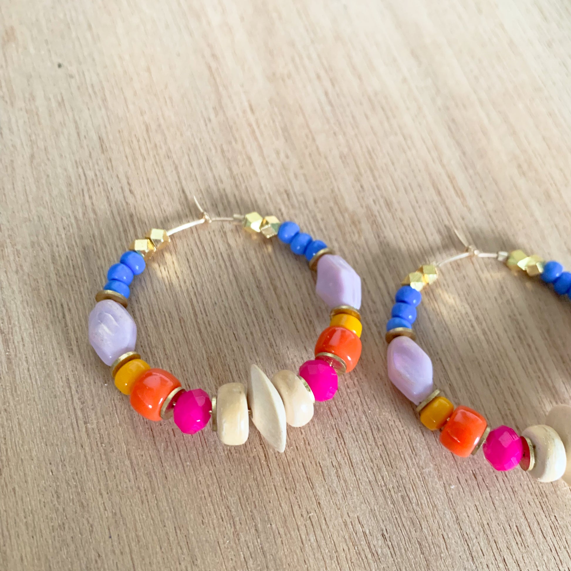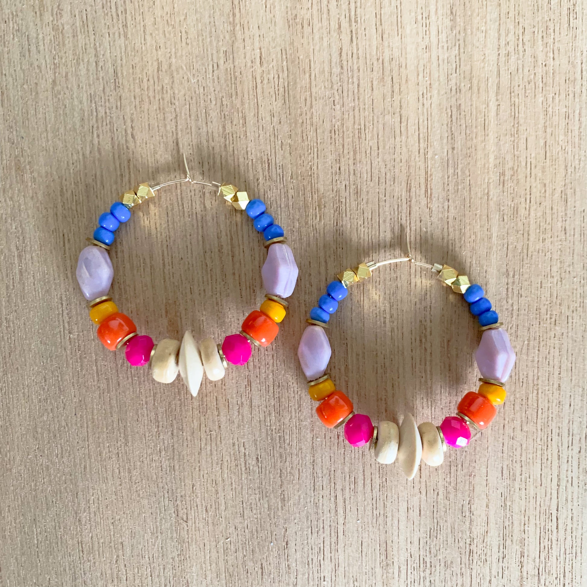 A new take on our favorite signature colorful hoops. Featuring glass beads from Italy, vintage Czech glass beads, and wood on 45mm 14k gold fill hoops.