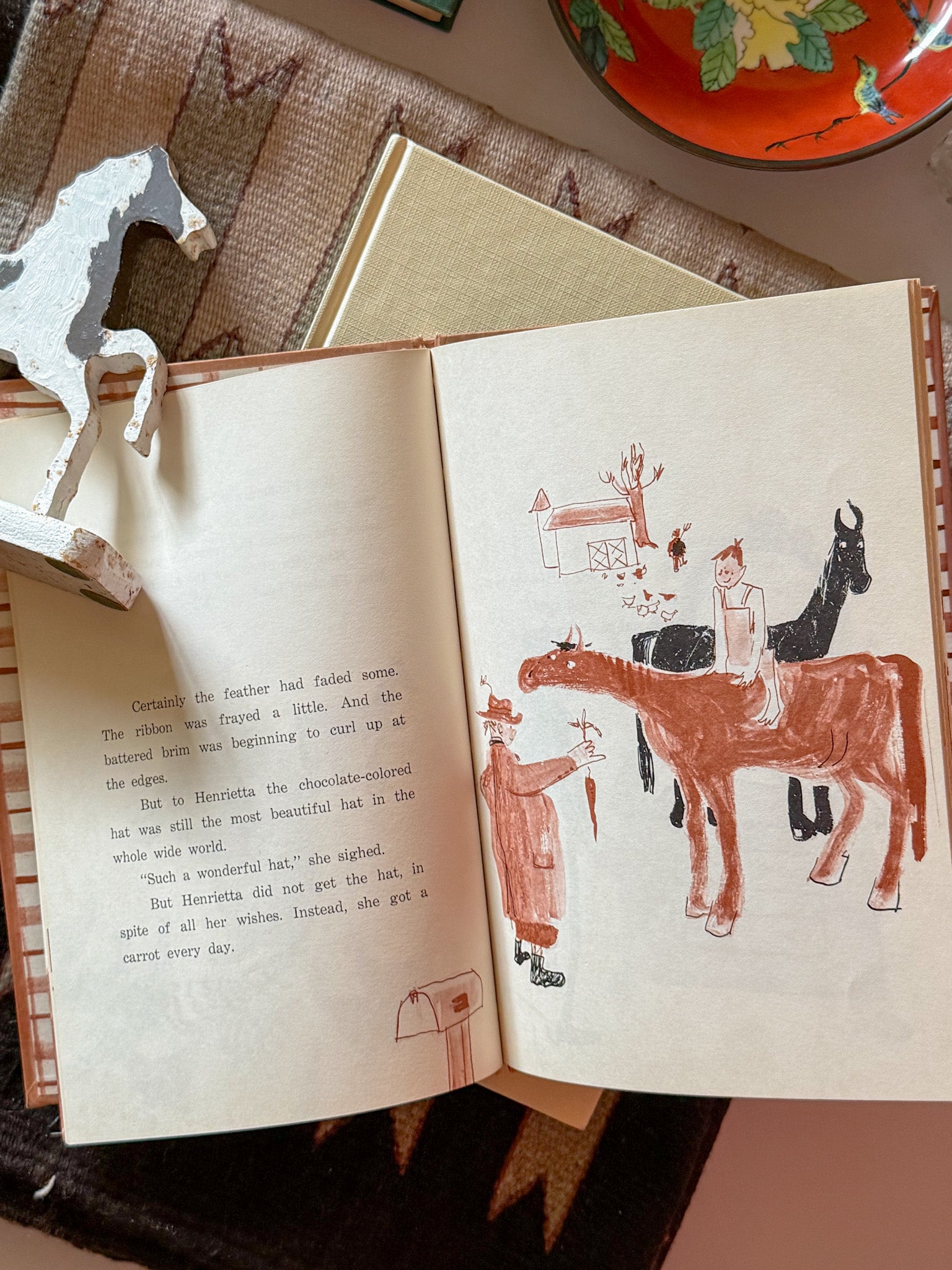 A charming childrens' story of a horse named Henrietta who longs for a dapper fedora. The illustrations done in neutrals with hints of green are so sweet, and the story takes you back to a simpler time.