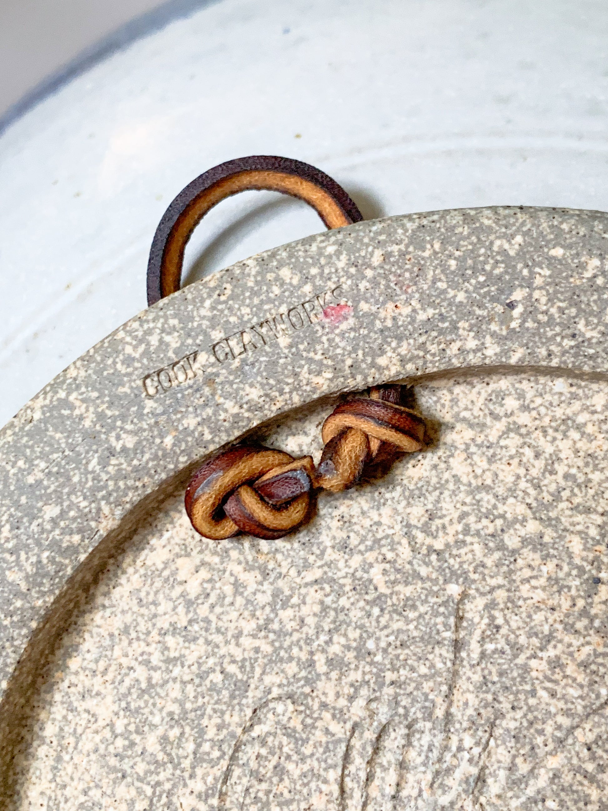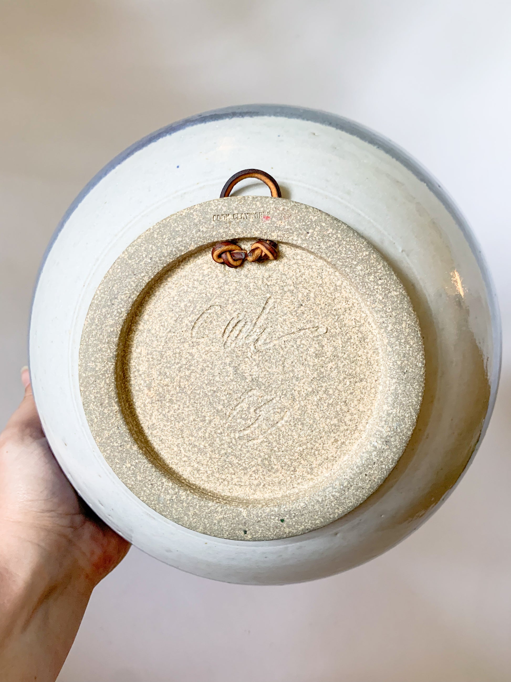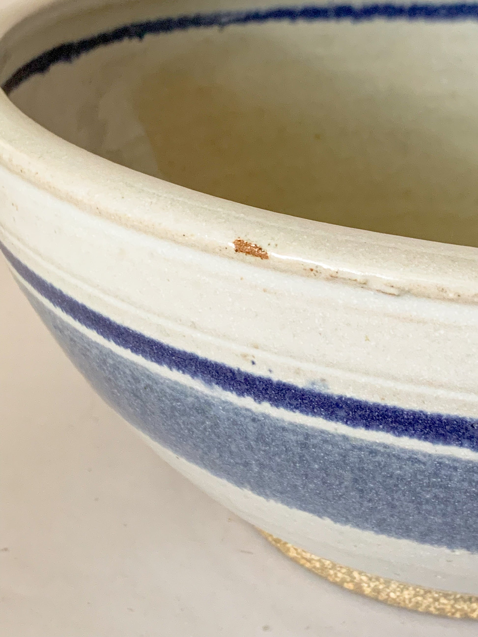 We love a good blue and white piece of pottery, and this large mixing bowl is no exception. The milky glaze shows off darker blue glazed rings inside and out. It is an excellent example of high quality elegant studio pottery with the maker's mark on bottom. It also has a leather strap hook so it can be hung on the wall.
