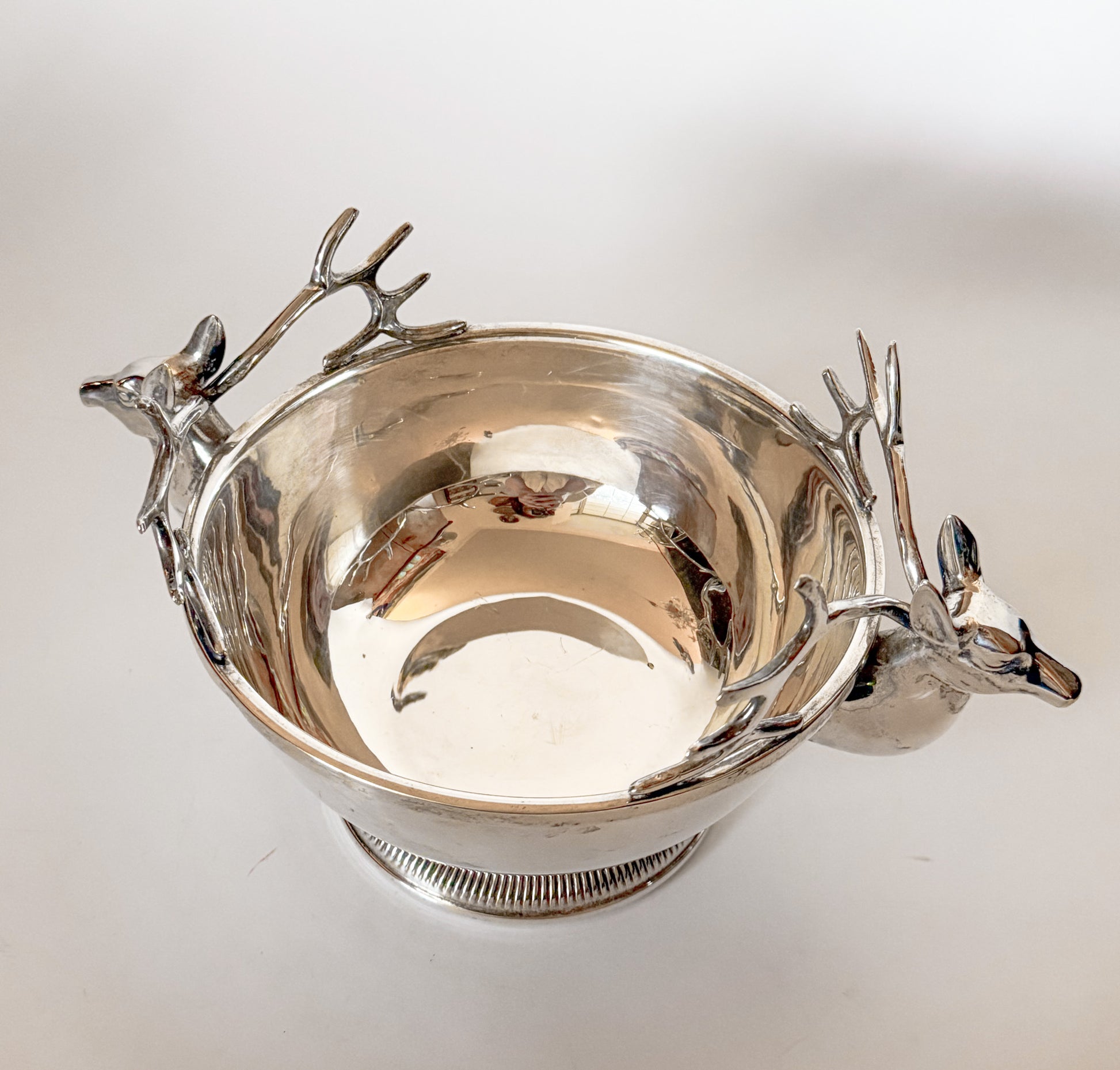 This stunning Silver Plated Double Deer Stag Centerpiece Pedestal Bowl is a beautiful addition for almost any decor style. This piece is silver plated and features exquisite fluting detailing to the base trim and large stag heads on opposing sides. The bowl is perfect as a decorative piece filled with paper white bulbs, an orchid, vintage Christmas ornaments, or as a centerpiece or on a kitchen island or credenza. This piece really shines when polished! Truly stunning.