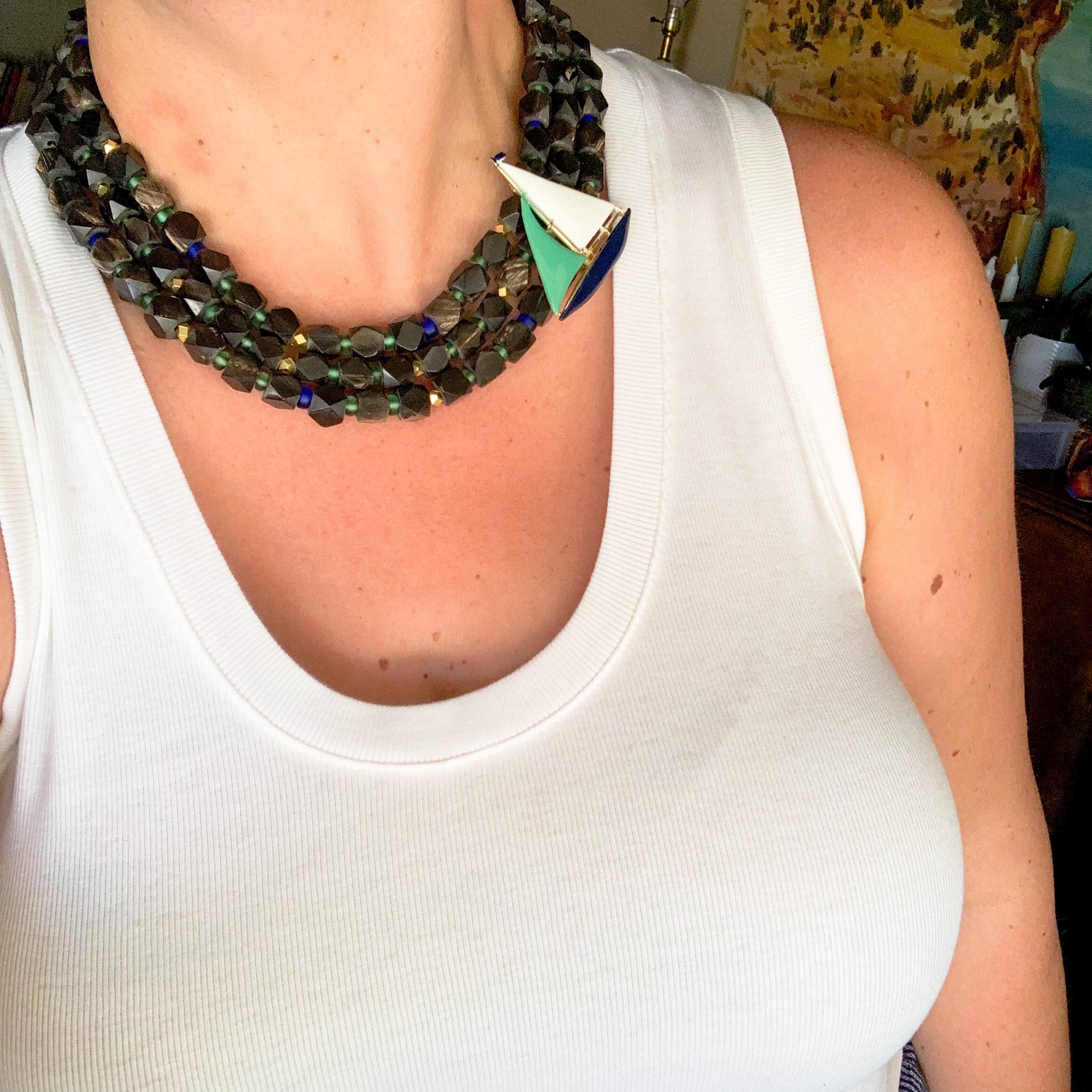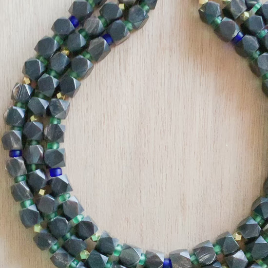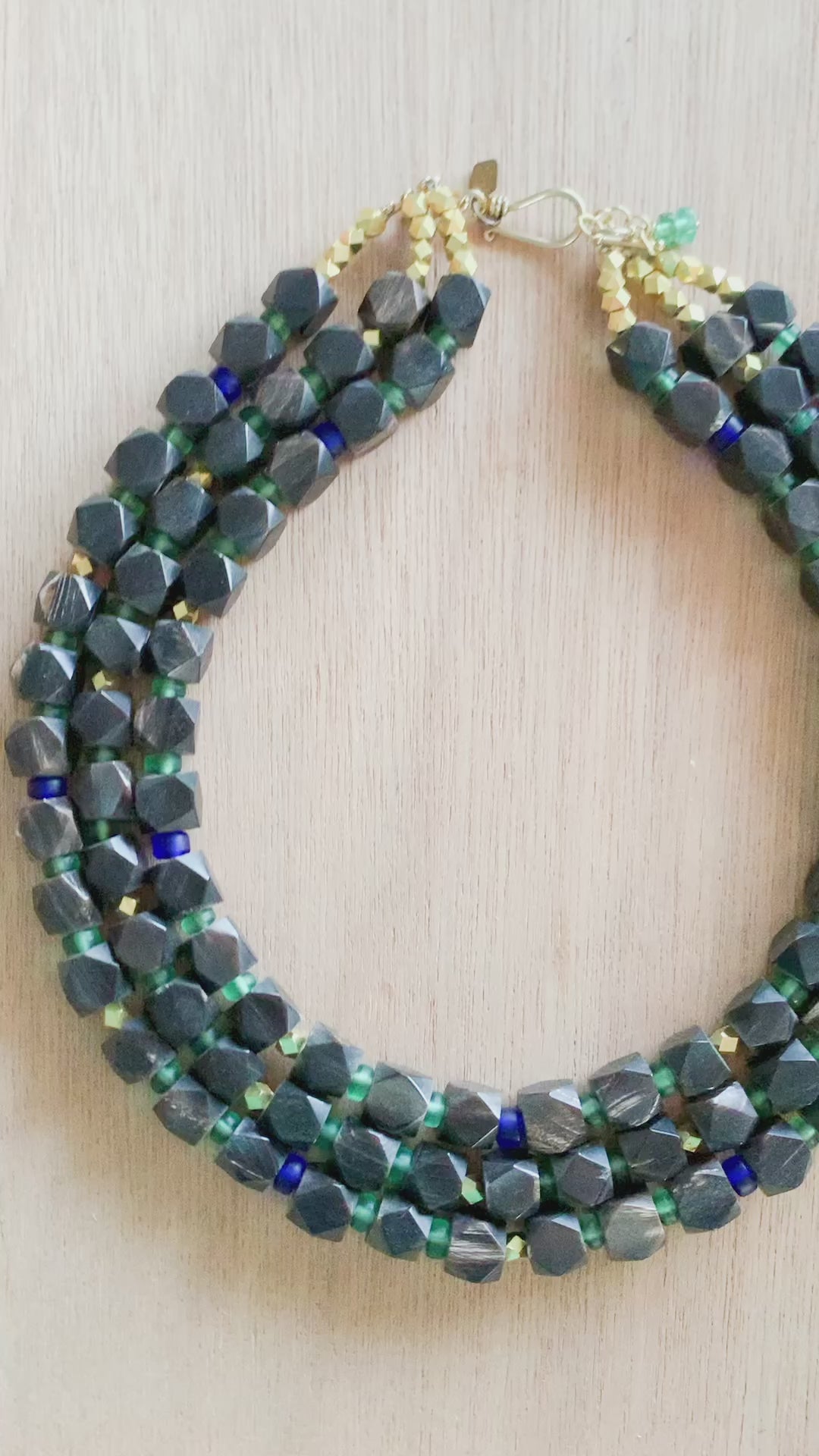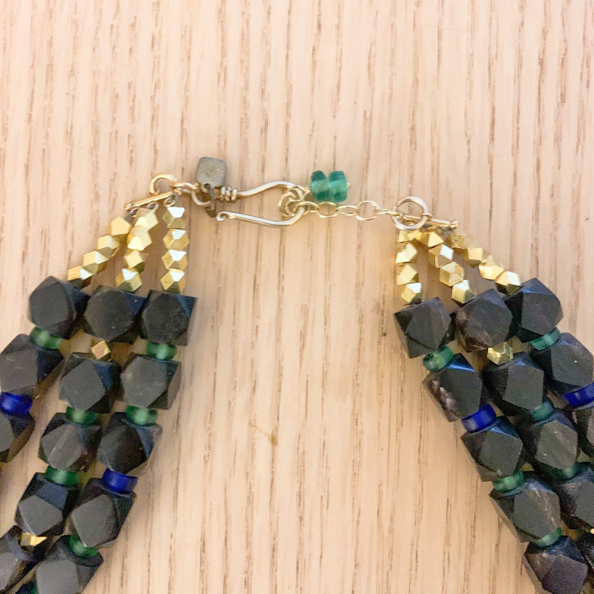 - 3 strands of brown H0RN beads, spaced with blue and green glass