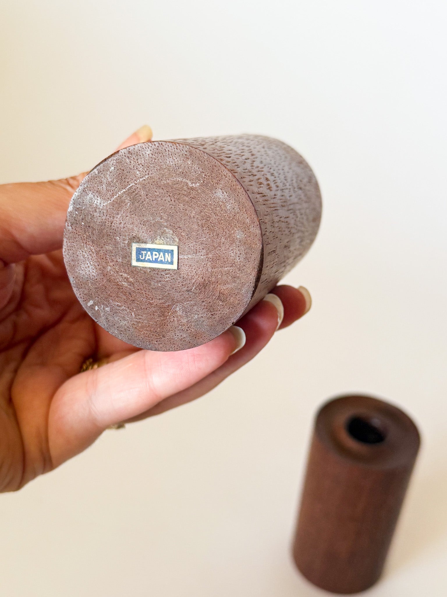 Fantastic simple and modern Danish style wood cylinder taper candle holders. These are Danish in style, and made in Japan. They seem to be made of walnut.