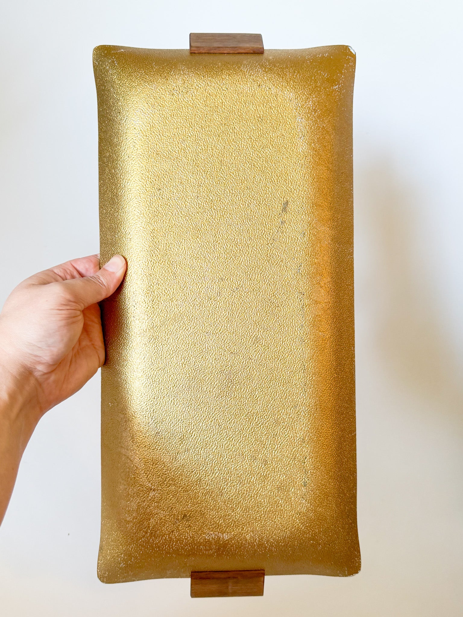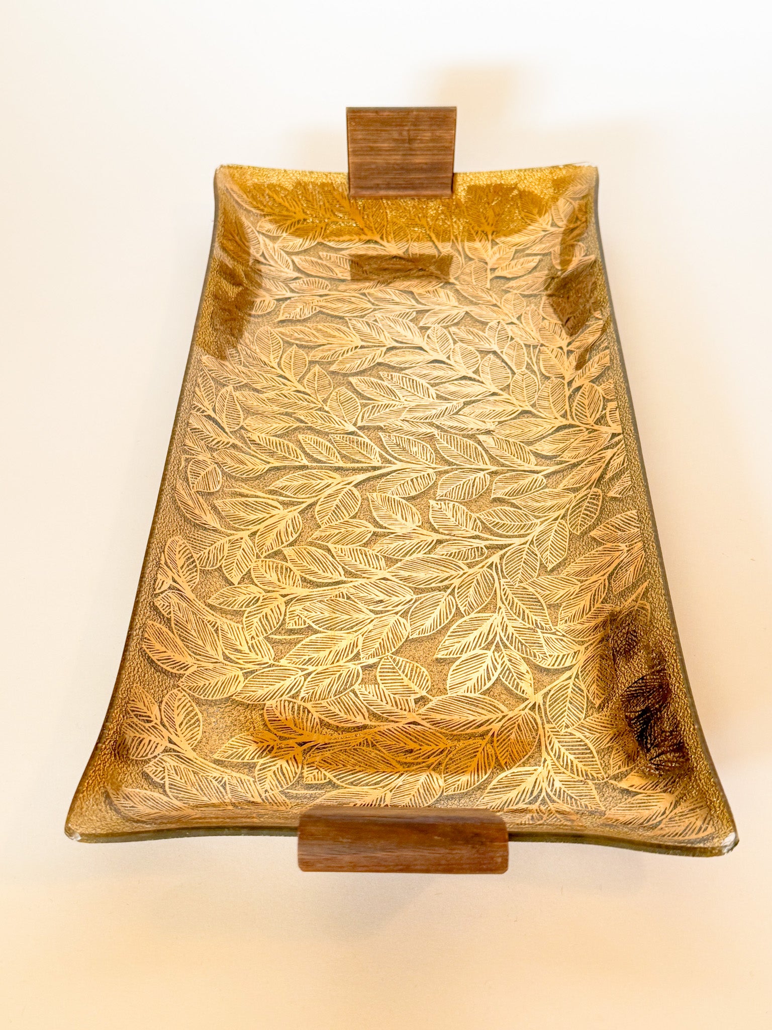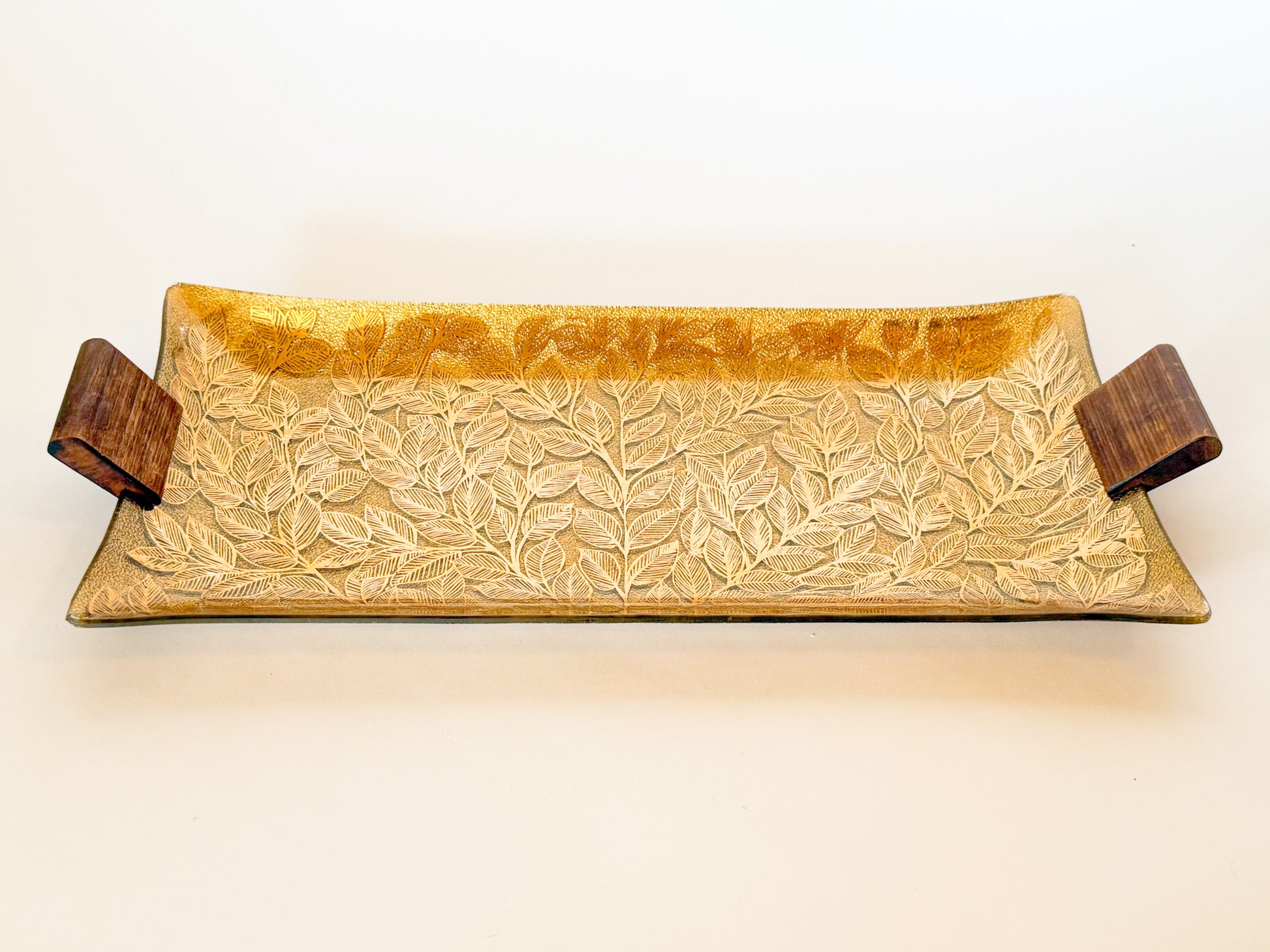 A lovely Mid Century Modern GIlt back painted molded handkerchief style glass tray with wood handles and gold painted leaf motif, by Ernest Sohn. Signed on the lower left corner. This tray is elegant Mid Century style. It has a lovely warmth to the gold. A great centerpiece for a table, or put on a stand in your bookcases!