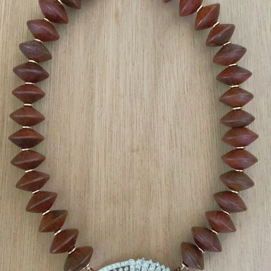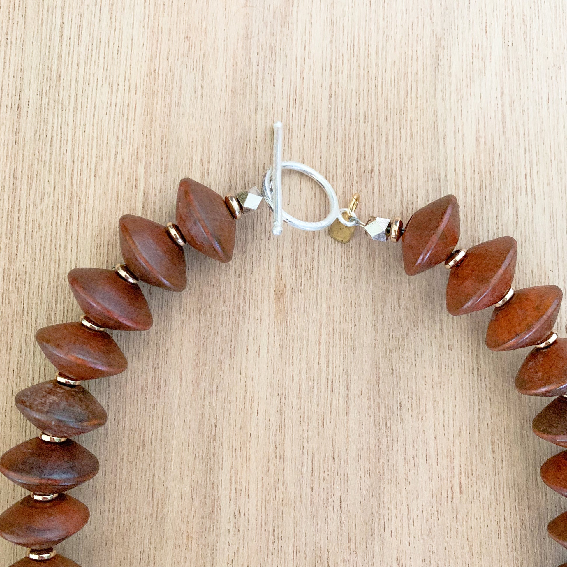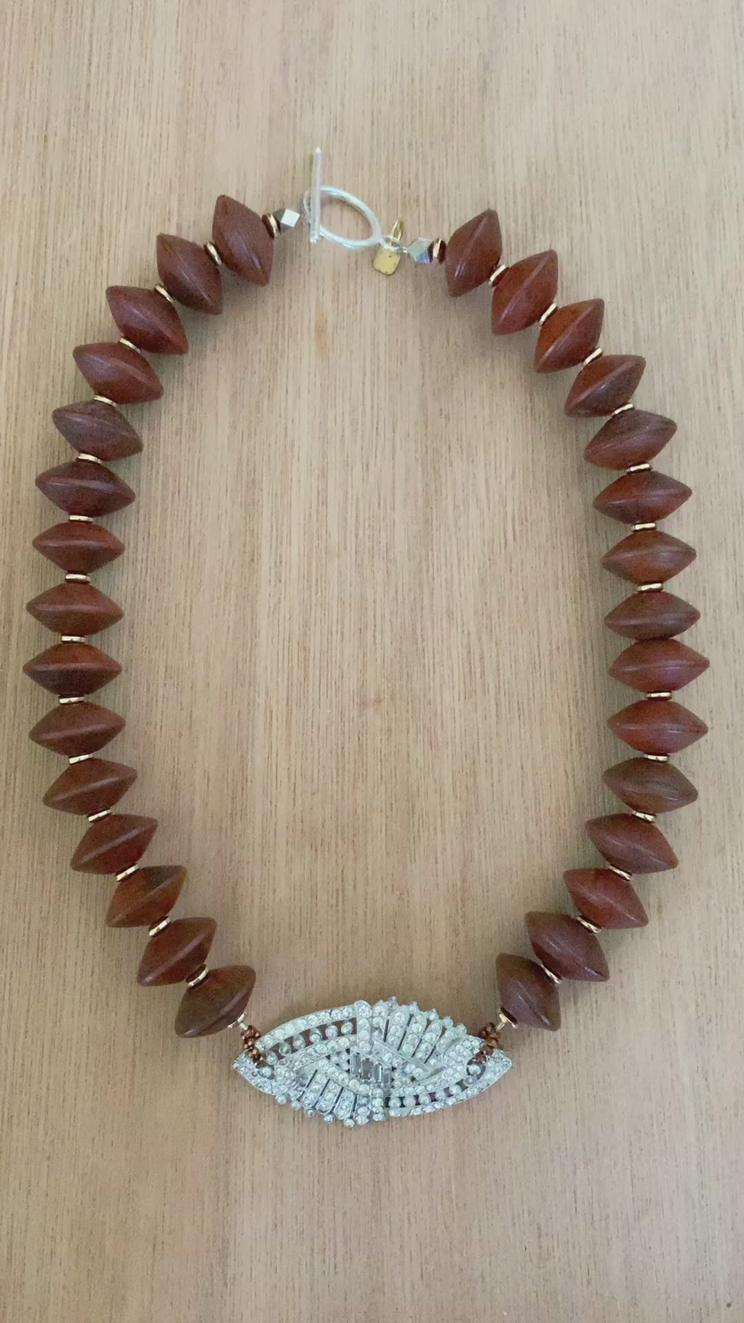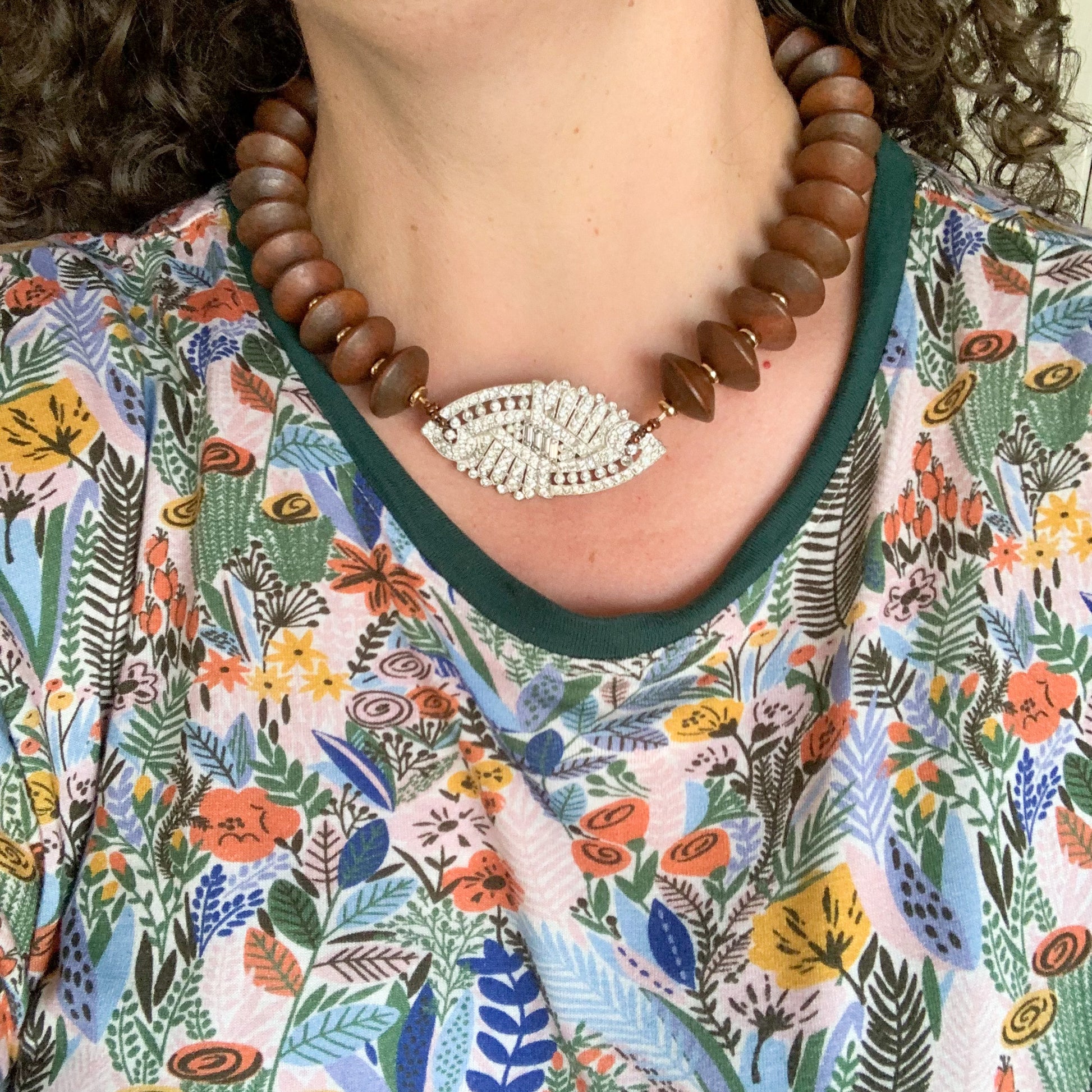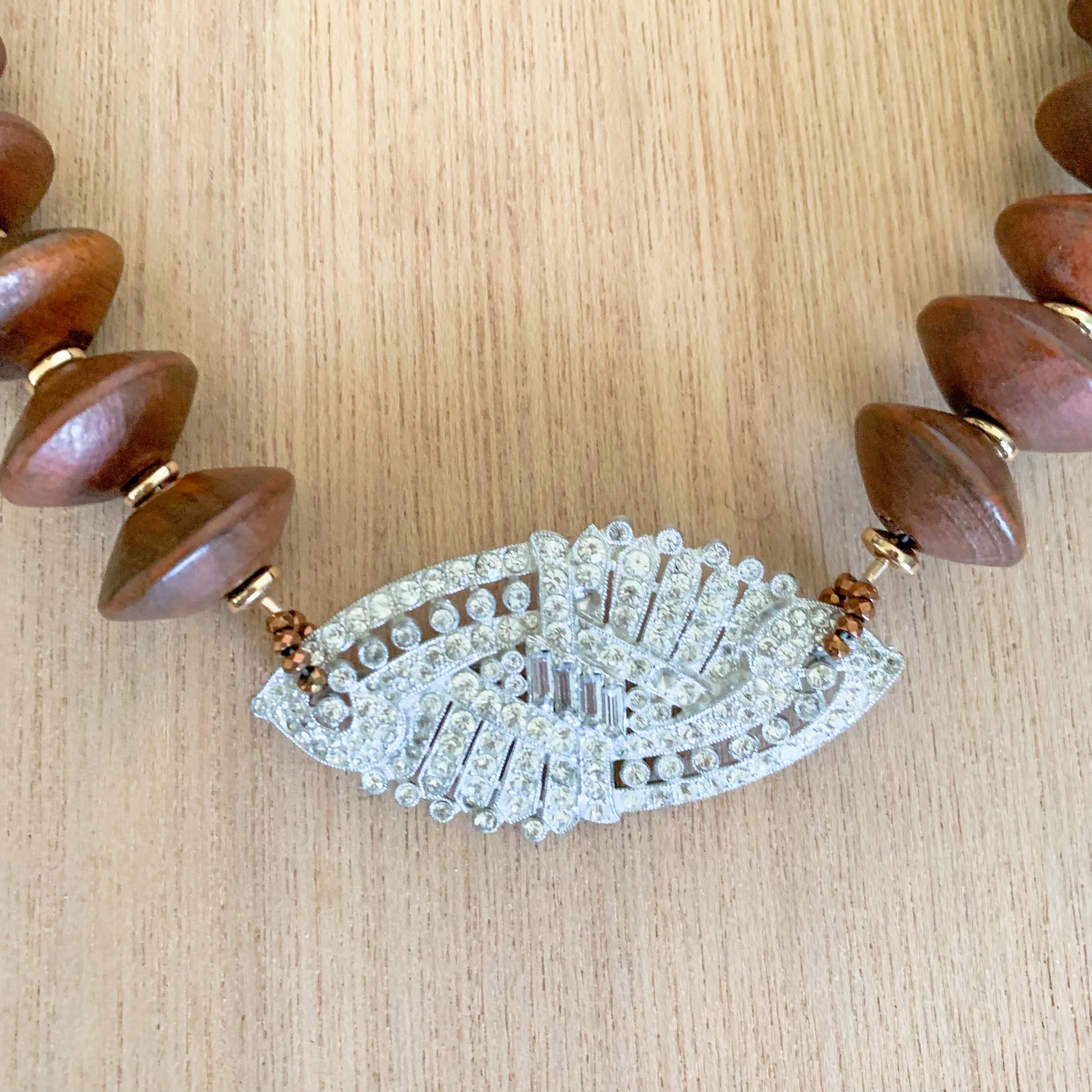 Natural wood beads create a simple backdrop for a real sparkly vintage stunner! This 1930s vintage brooch is elegant, but with the wood she’s not too much for every day looks. A light weight look you’ll get countless compliments on!