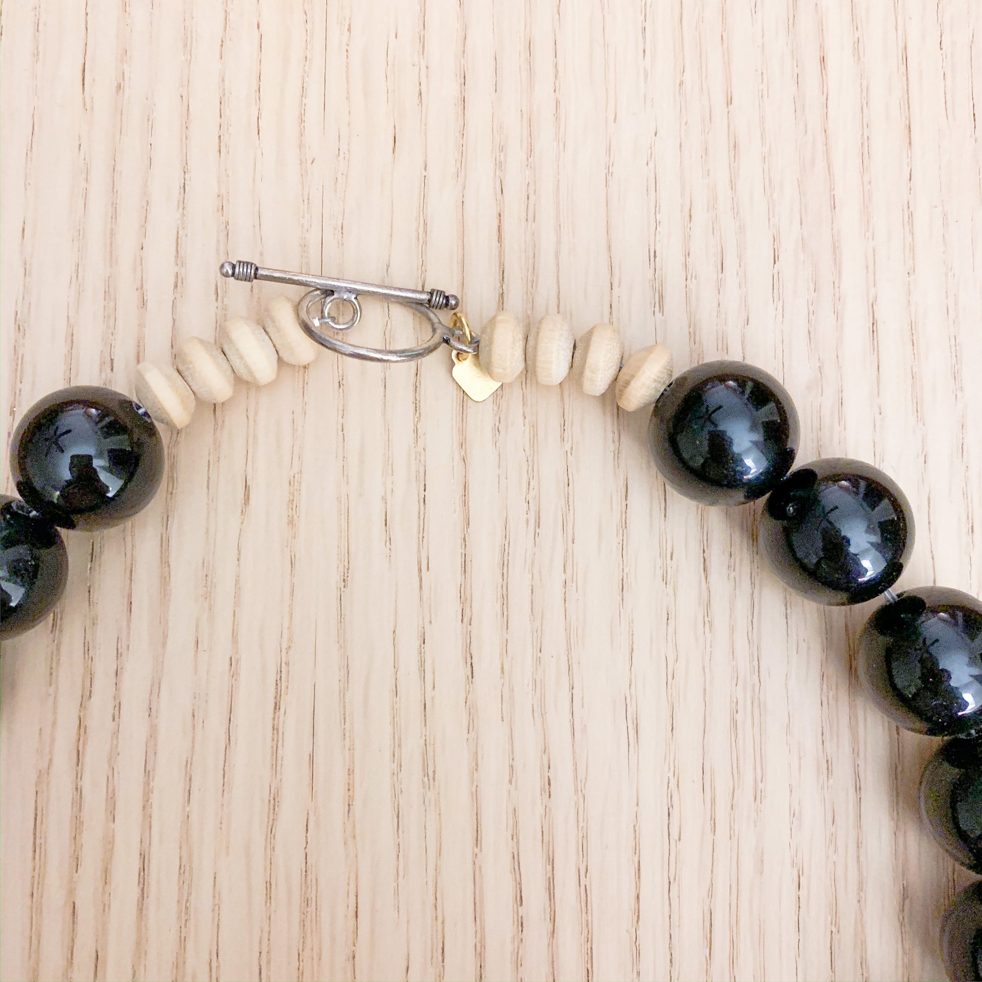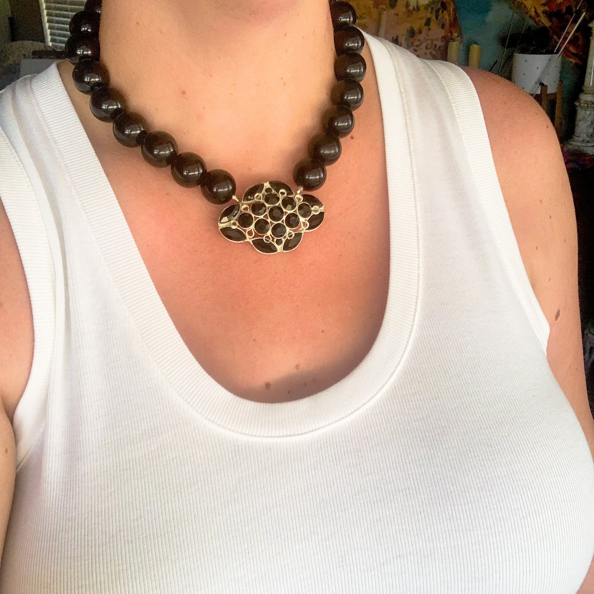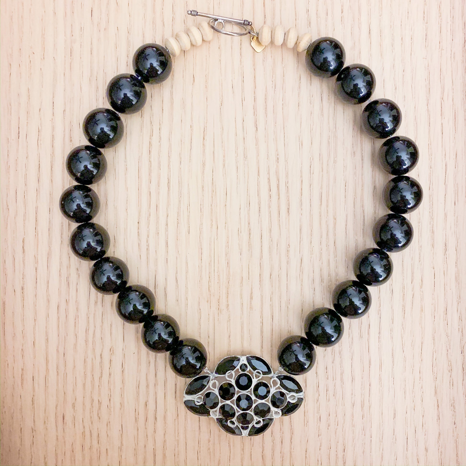 Thought we usually love color around here, the sparkle of these oh-so-smooth highly polished black onyx stones paired with the unusual vintage brooch make for a not-so-basic black statement piece. The versatility of this piece is off the charts, and will be sure to liven up any wardrobe.