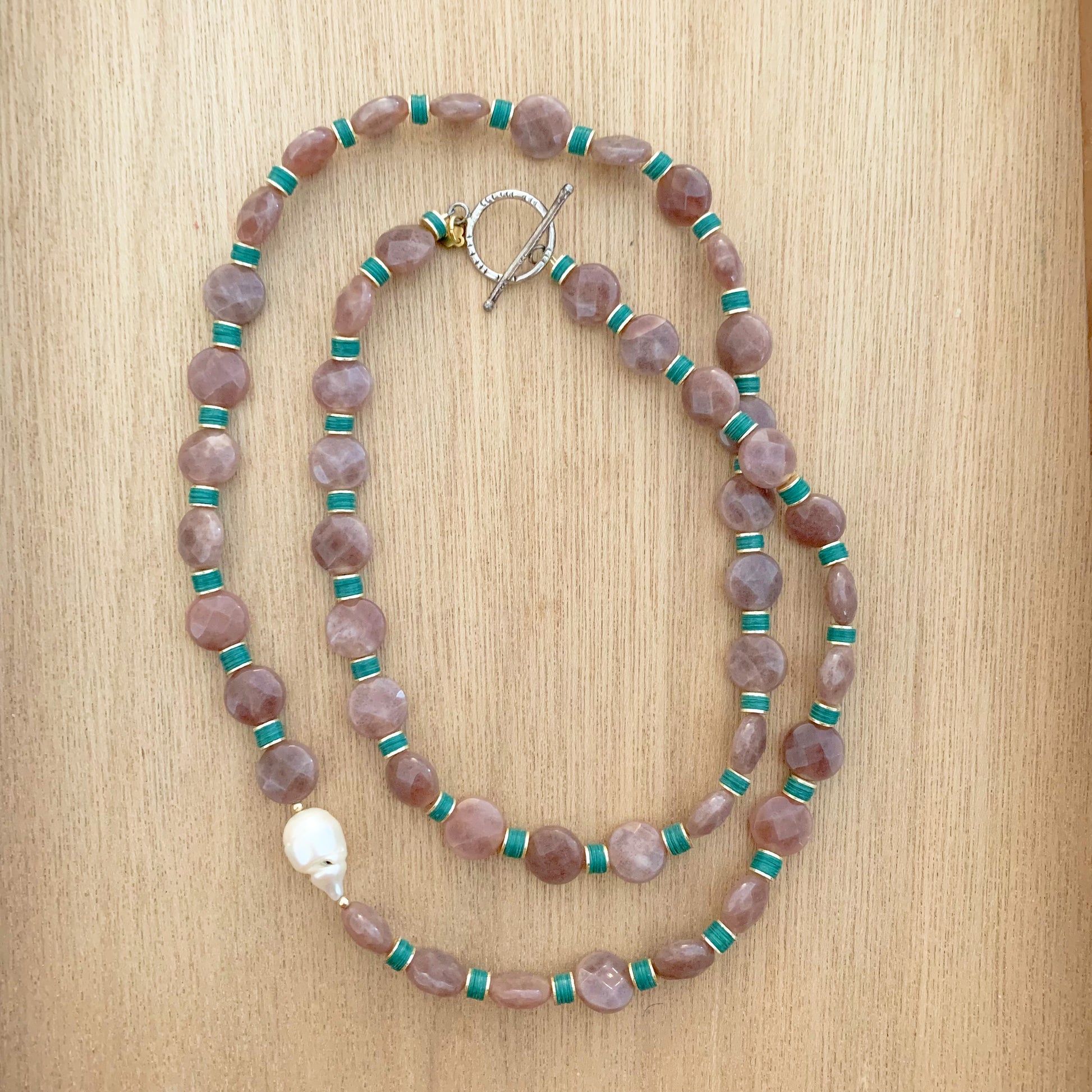 Natural Oyster colored faceted beads with green African vinyl and gilt accents, featuring a beautiful baroque freshwater pearl.