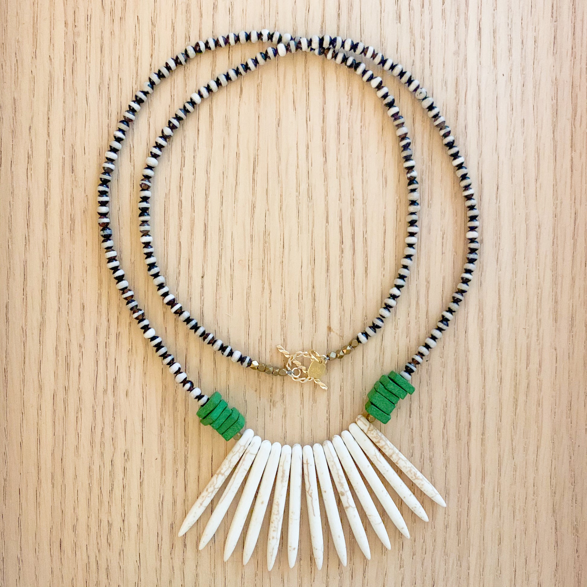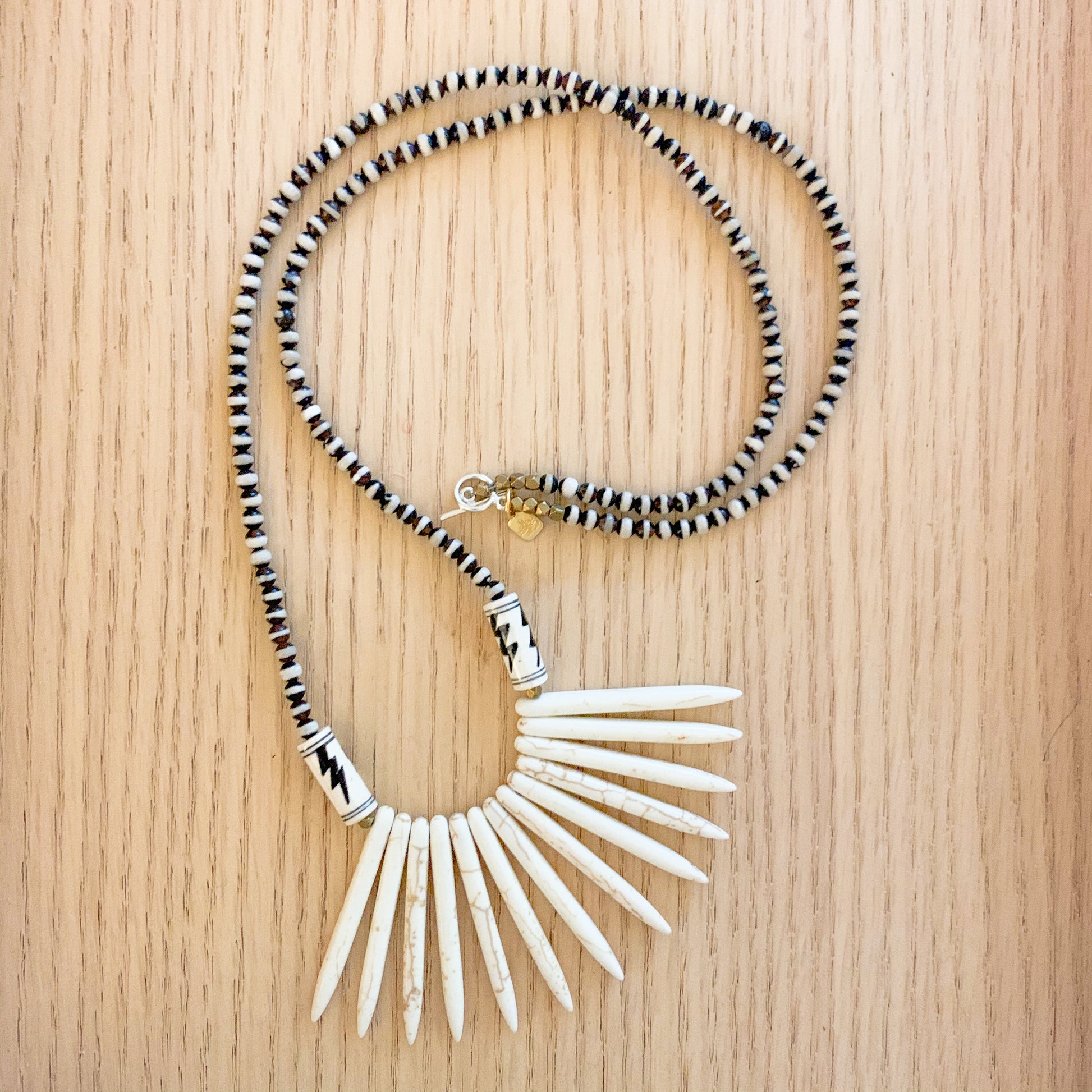 Give any outfit an ethnic statement with this fierce and bold long necklace. Wear with anything from a chambray shirt to a simple black dress. Striped agate beads set off unique hand painted beads from Peru, with an array of ivory colored magnesite spikes as the feature.