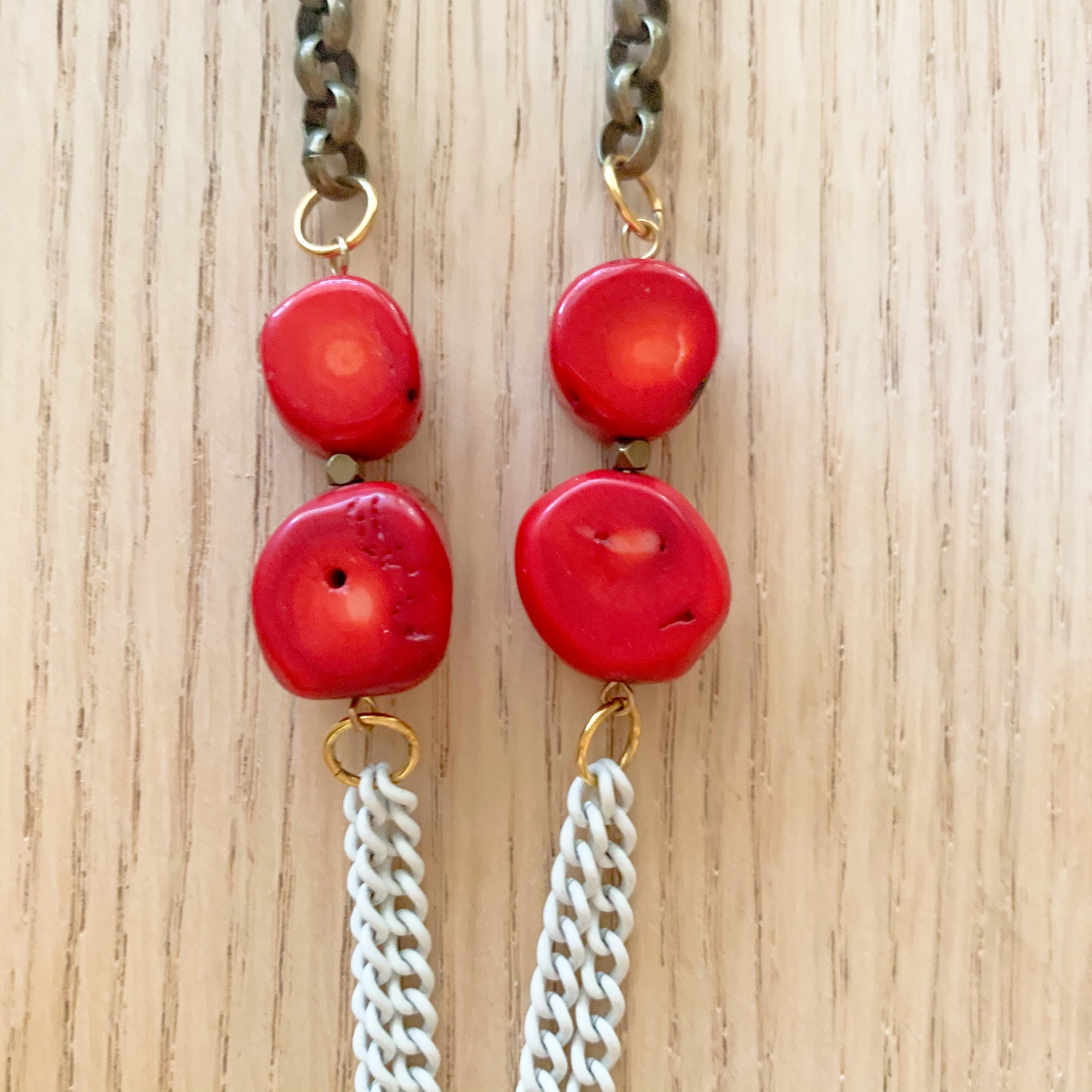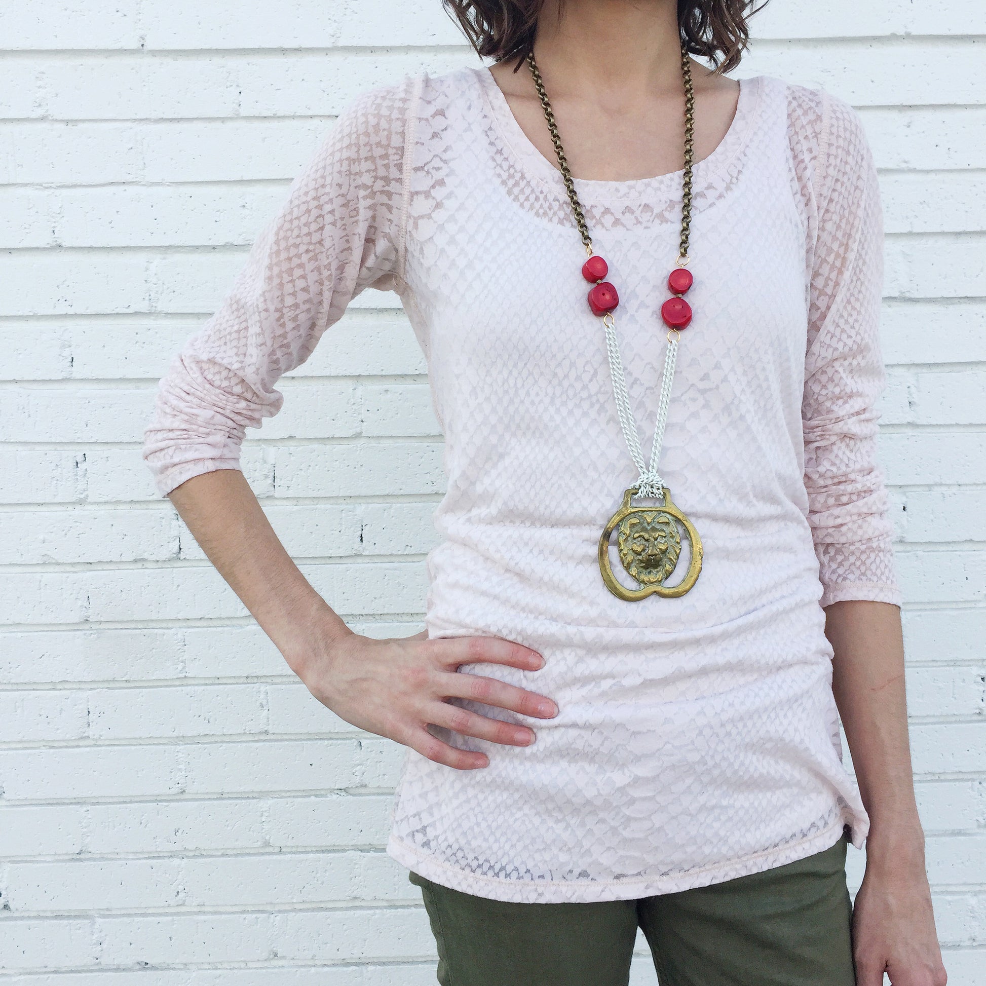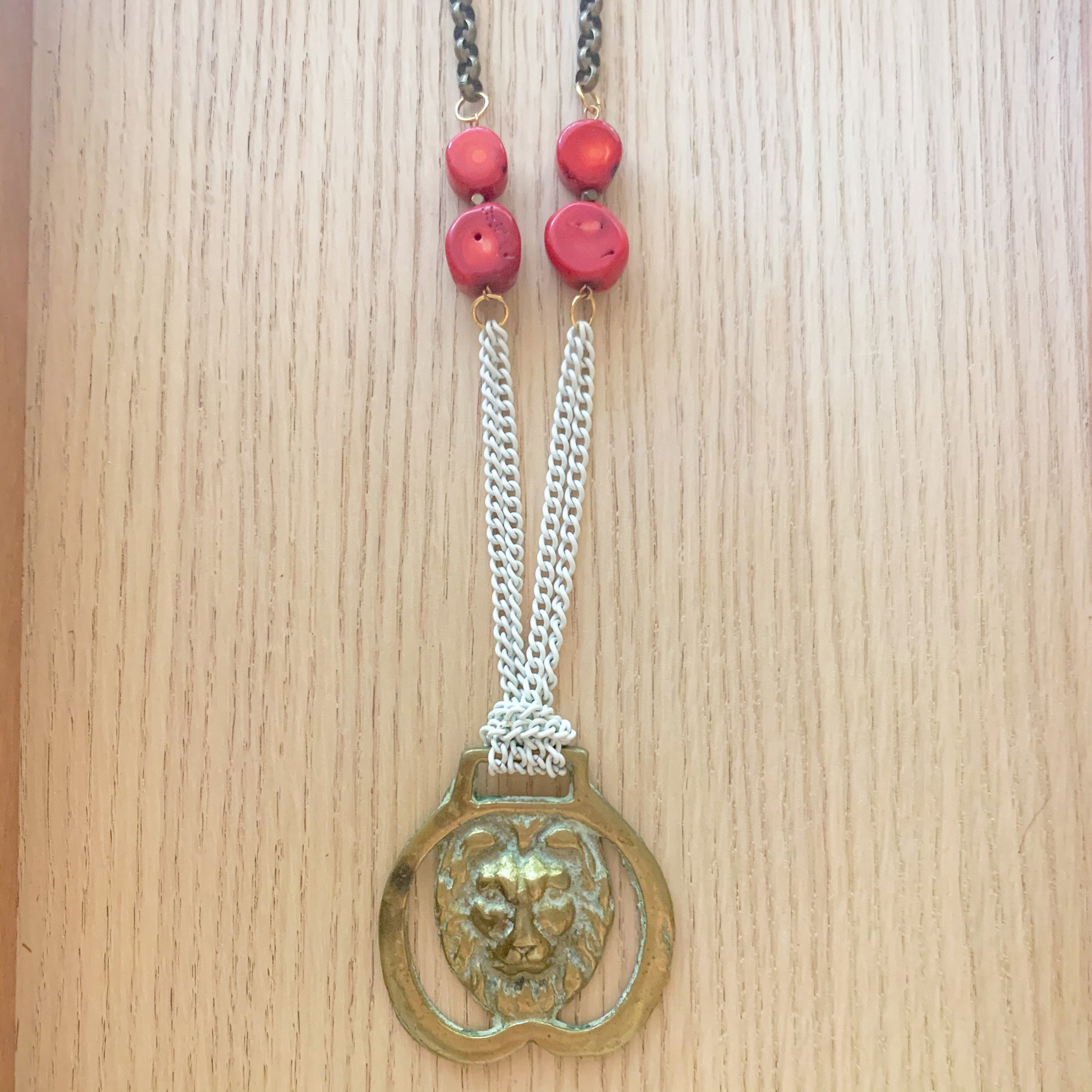 You'll get the prize when wearing this statement piece featuring a vintage brass equestrian medal with a graphic lion design in the middle. Vintage white enamel chains are knotted around the medal and connect to large nugget red coral and antiqued brass chain.