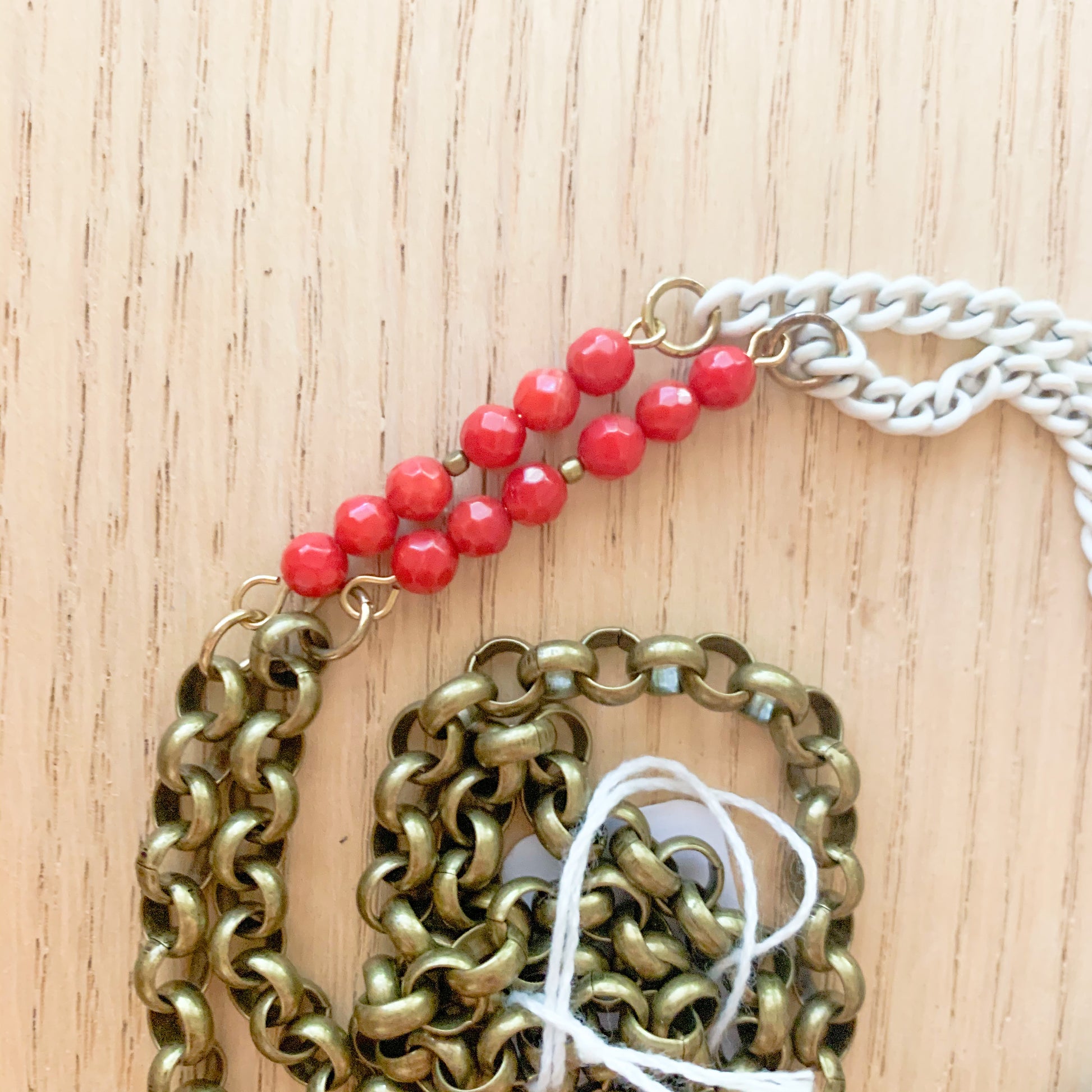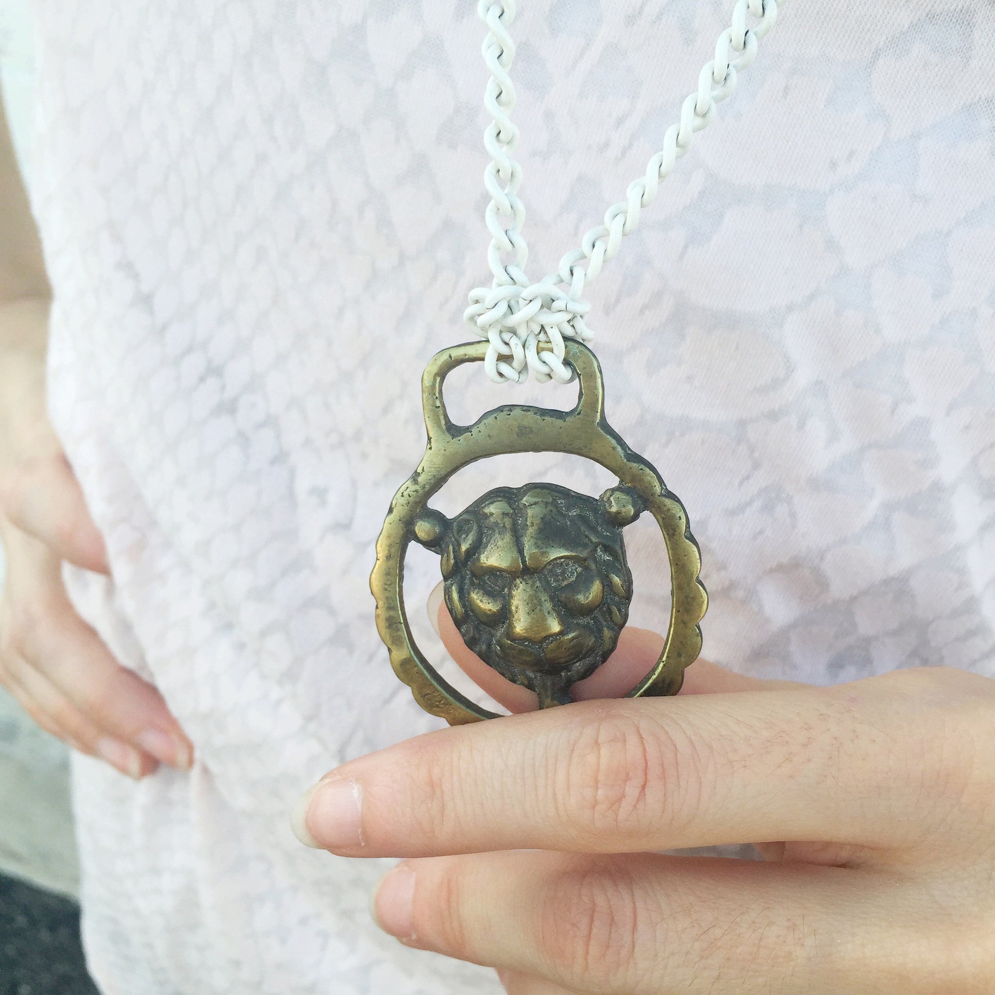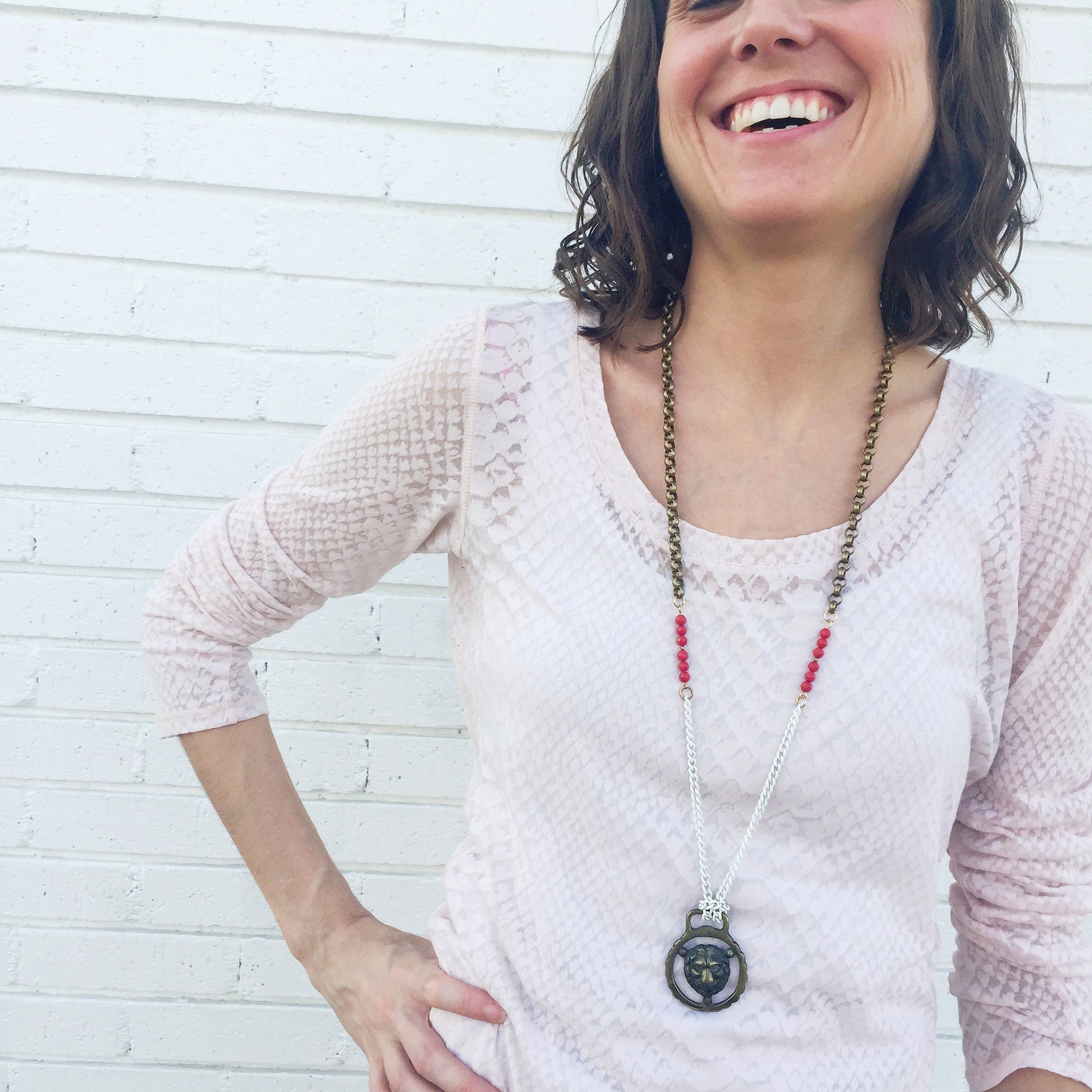 You'll get the prize when wearing this statement piece featuring a vintage mini brass equestrian medal with a graphic lion design in the middle. Vintage white enamel chains are knotted around the medal and connect to faceted red coral and antiqued brass chain.