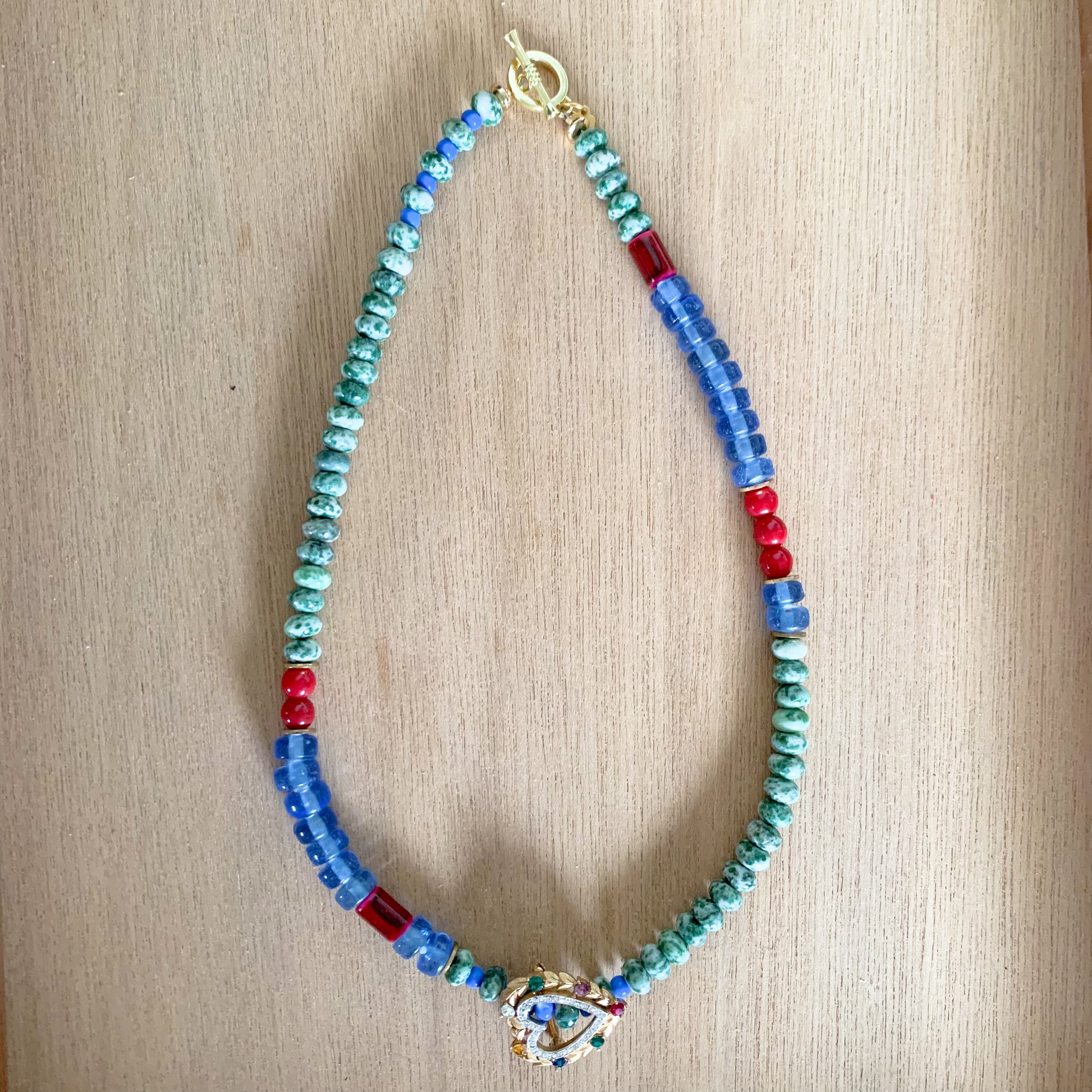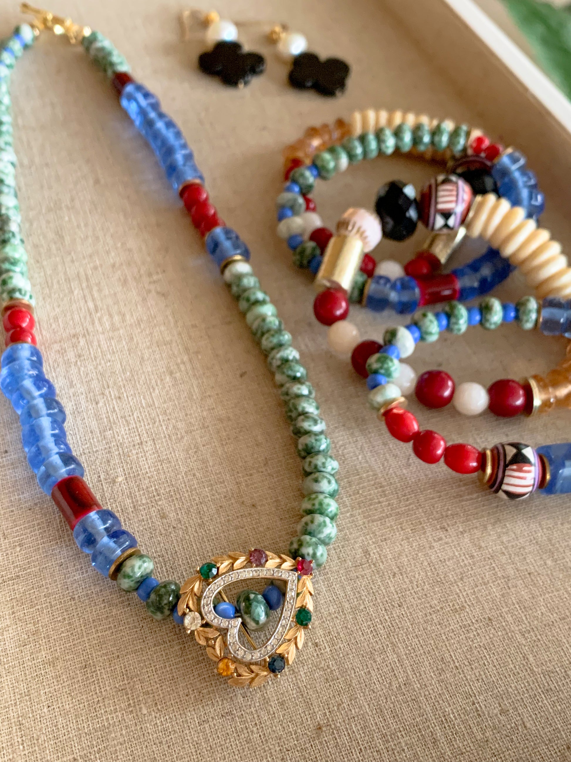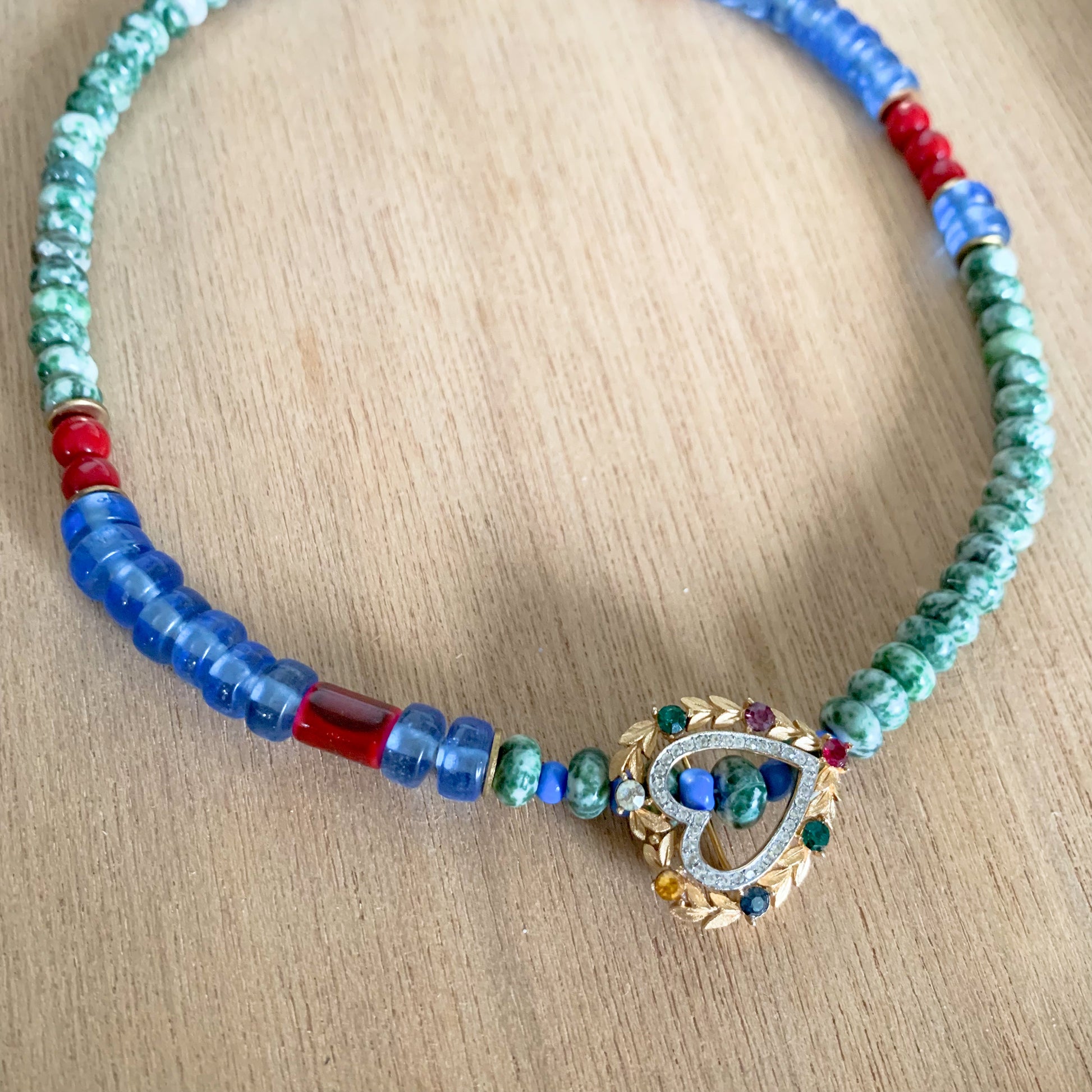 This cutie has our hearts! A short and versatile statement necklace with loads of personality. The vintage jeweled heart brooch is removable, so you can go with or without, or reposition it to where you like it best. I personally love it in the front as shown, for a fresh take.