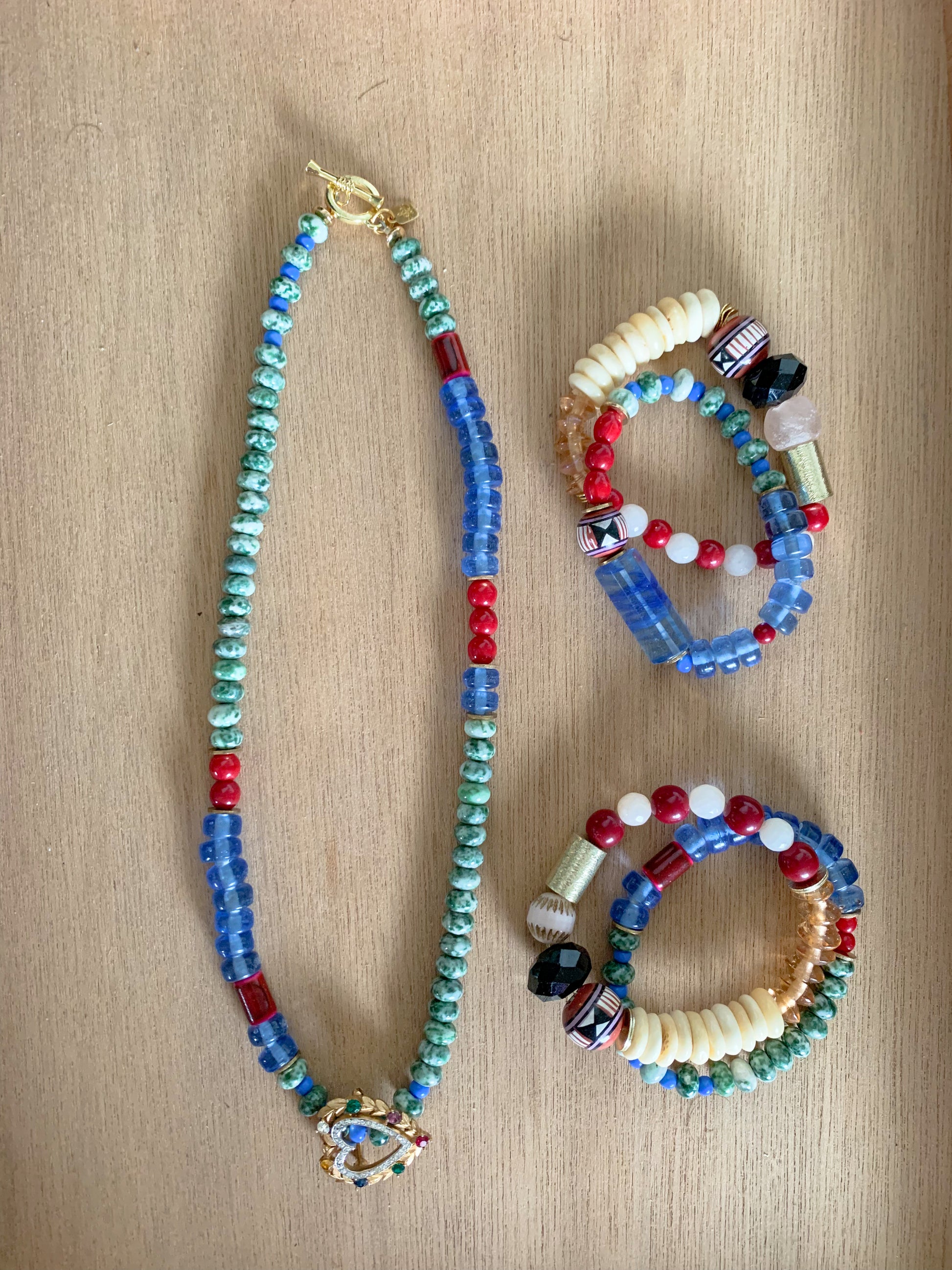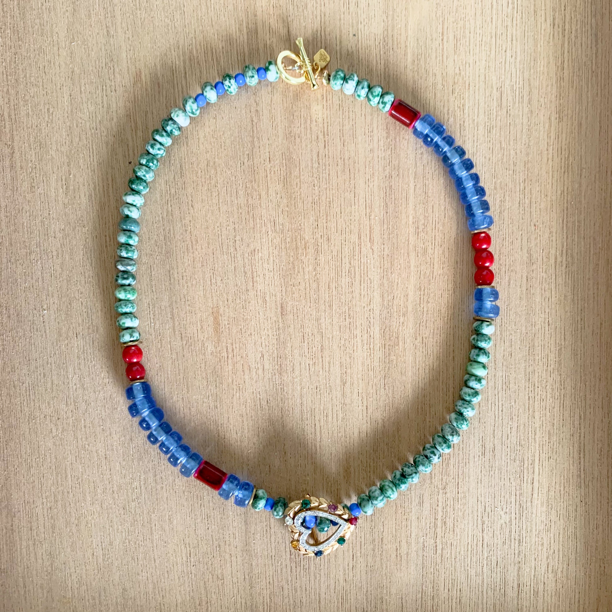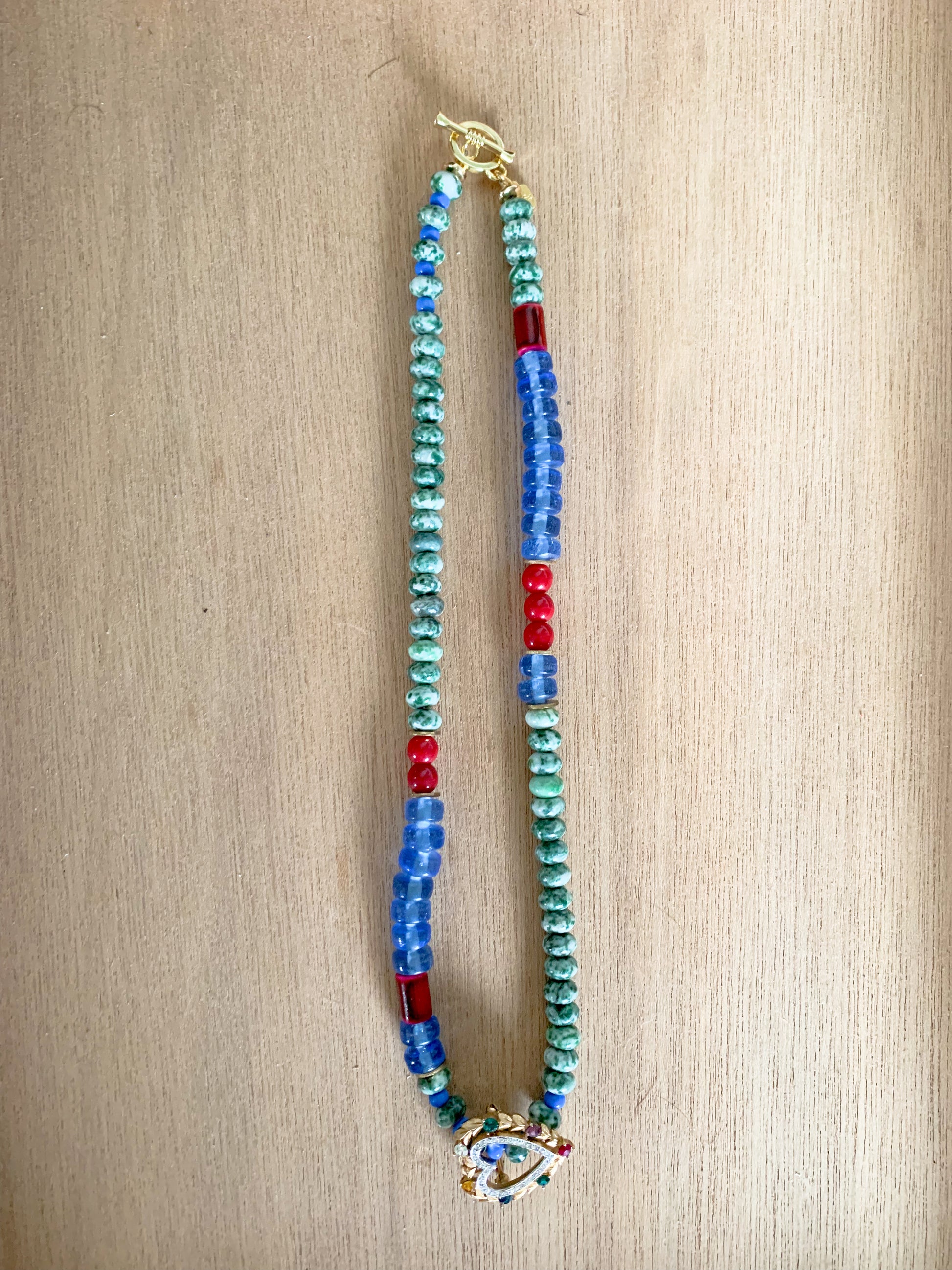 This cutie has our hearts! A short and versatile statement necklace with loads of personality. The vintage jeweled heart brooch is removable, so you can go with or without, or reposition it to where you like it best. I personally love it in the front as shown, for a fresh take.