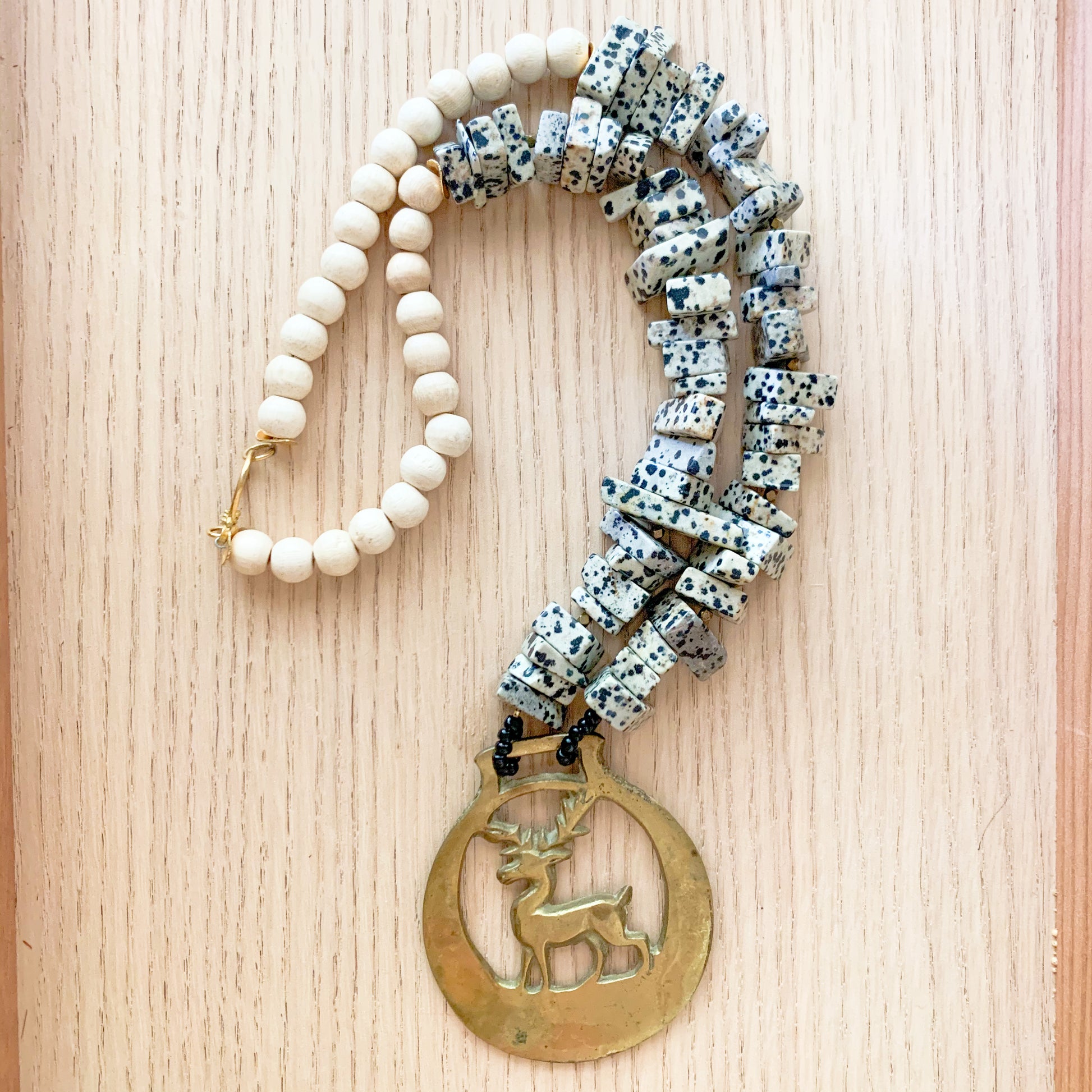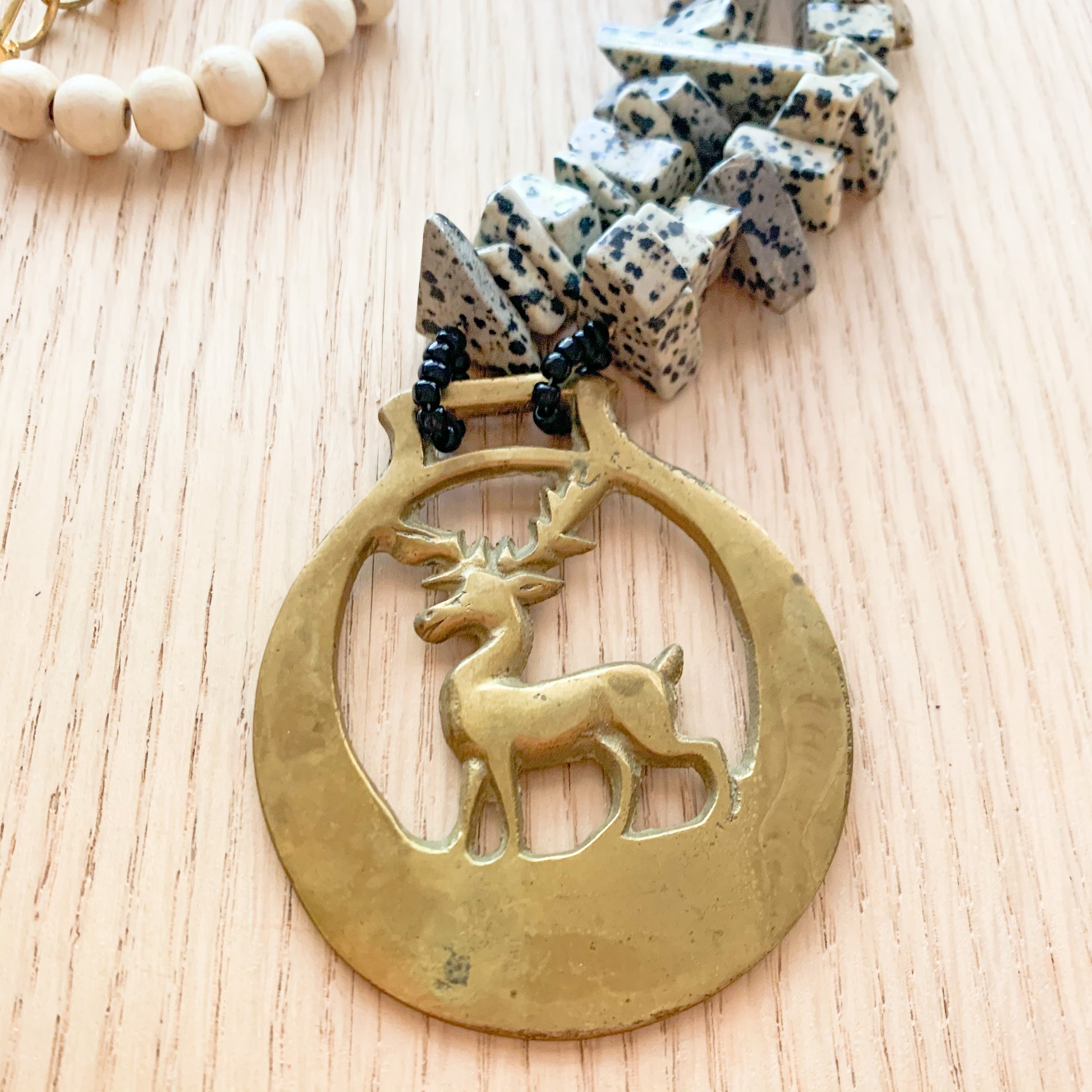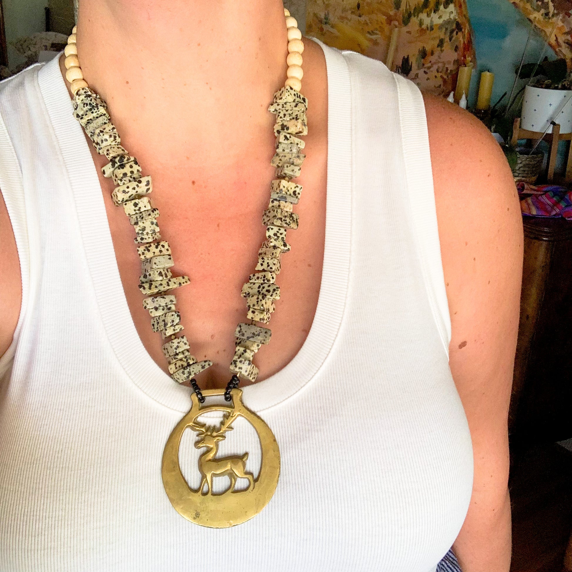 Won't you be a dear, be a darling? A fun deer (moose? reindeer?) statement piece featuring a vintage brass equestrian medal with spotted Dalmatian jasper nuggets and bone beads.