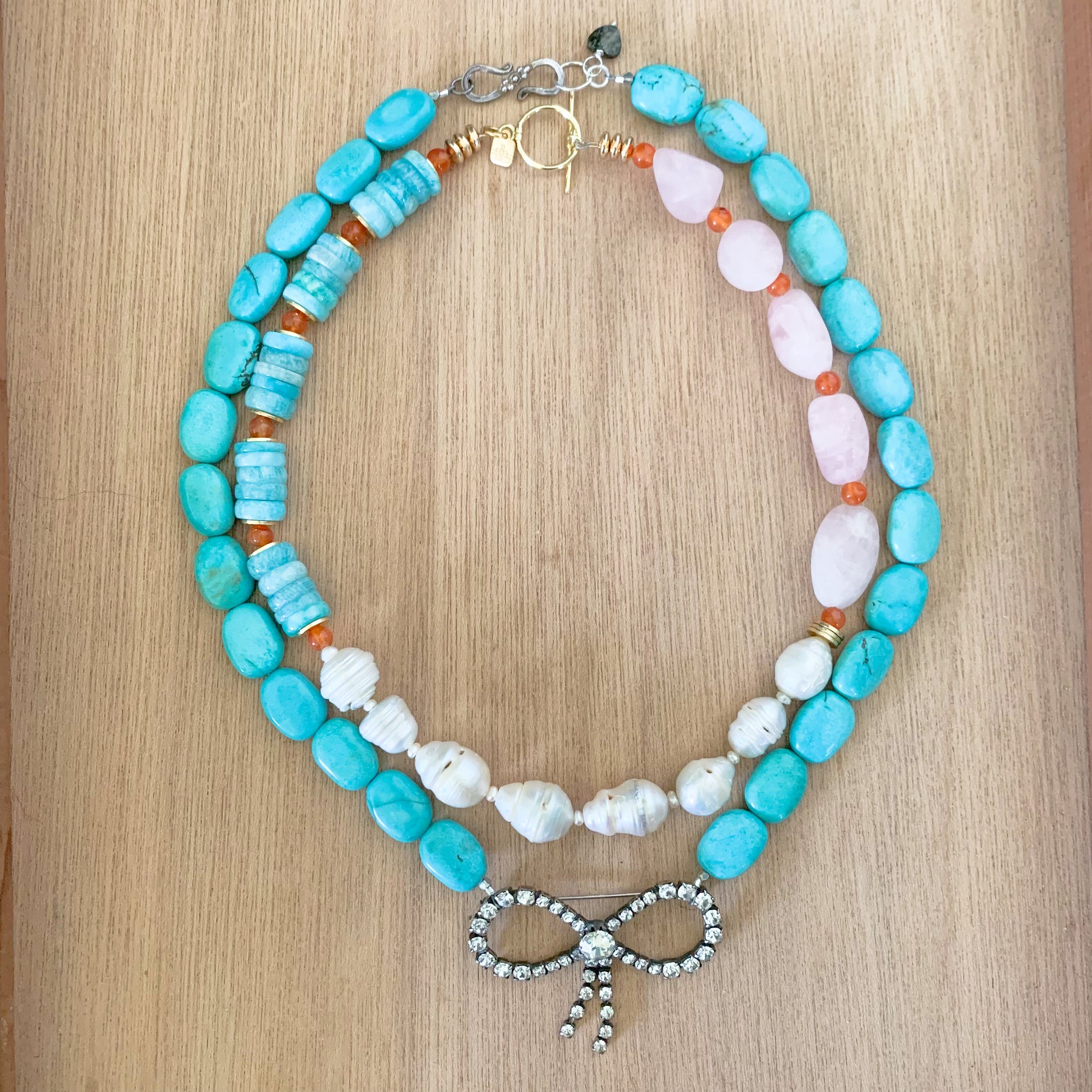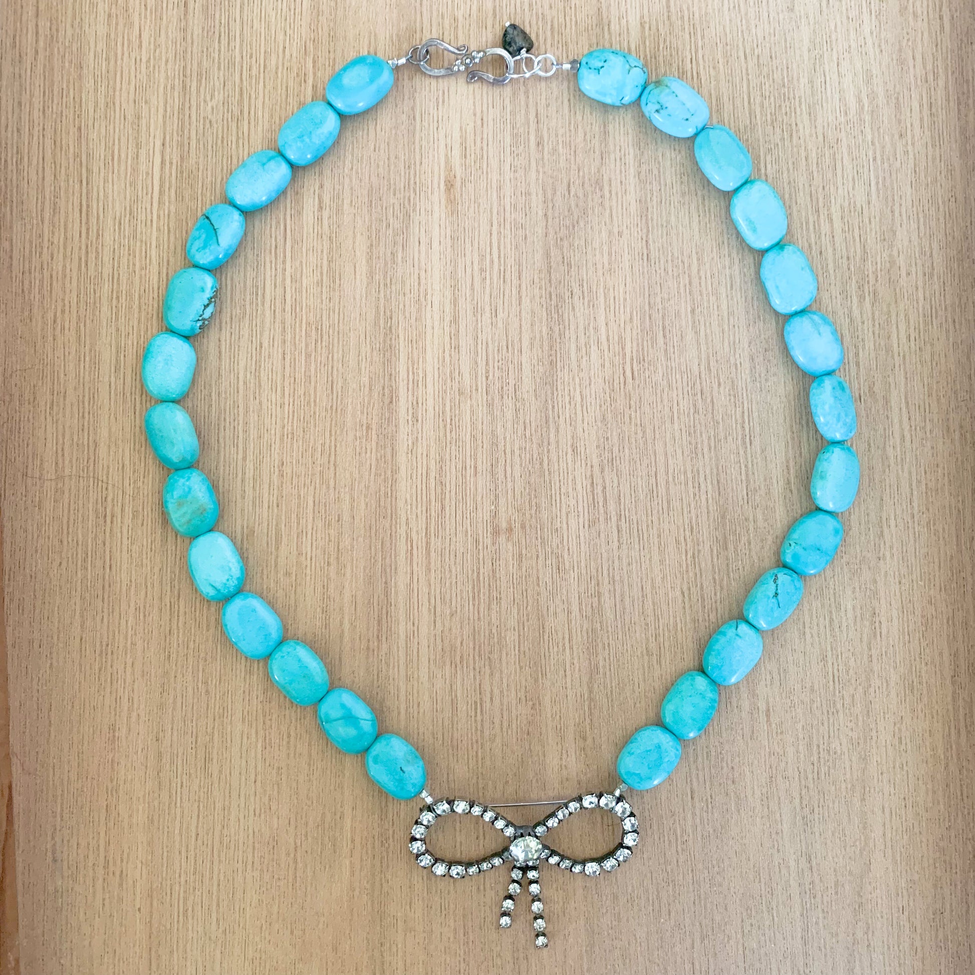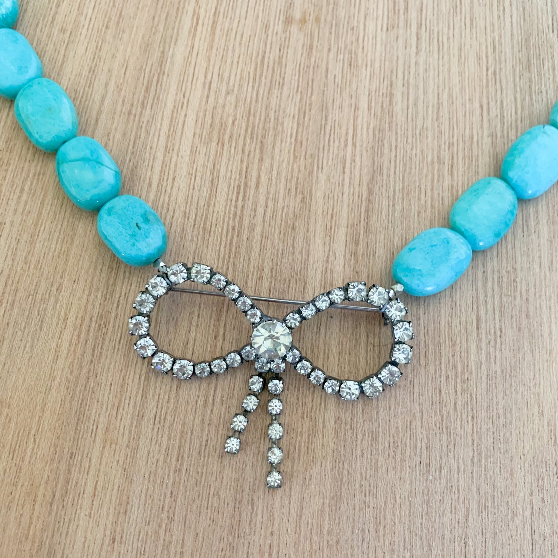 Add this necklace to your regular routine for a look so easy and polished, you'll want to take a bow. Turquoise magnesite stone beads are paired with a sweet vintage rhinestone bow brooch with swaying tails. It's never been easier to put a finishing touch on an outfit!