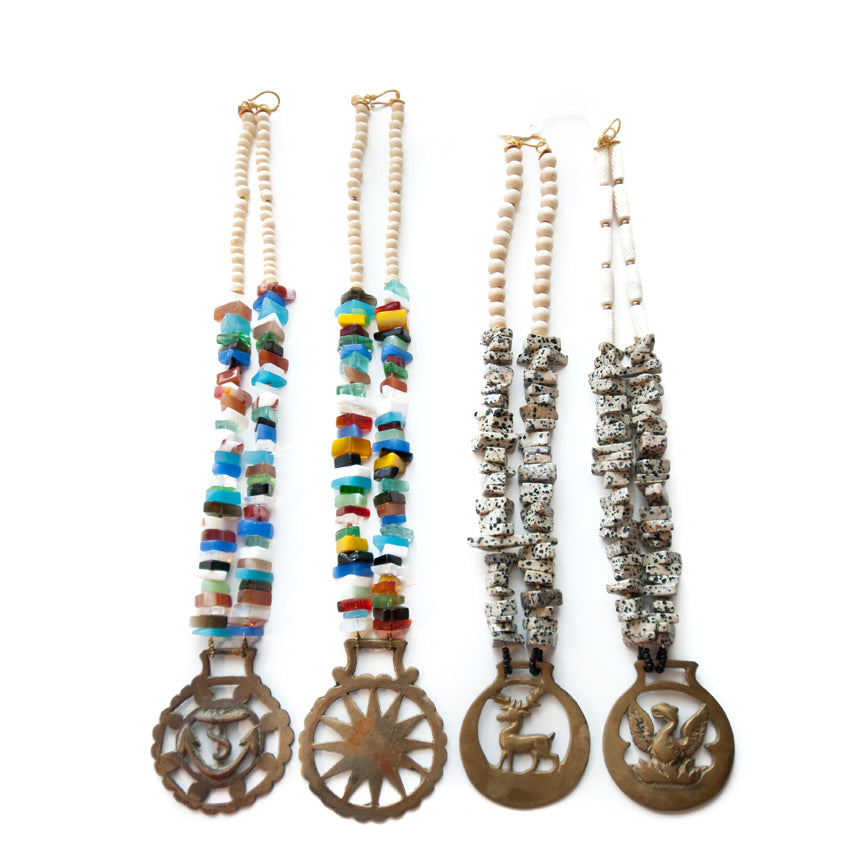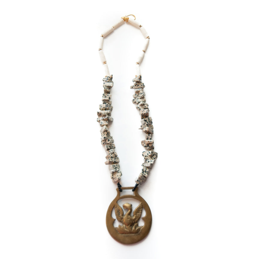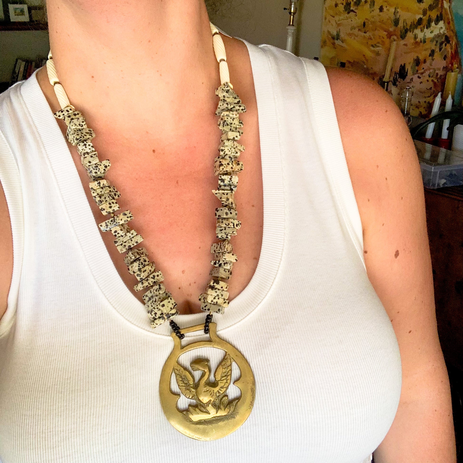 New heights come with every new flight. A classy statement piece featuring a vintage brass equestrian medal with spotted Dalmatian Jasper nuggets and bone beads.
