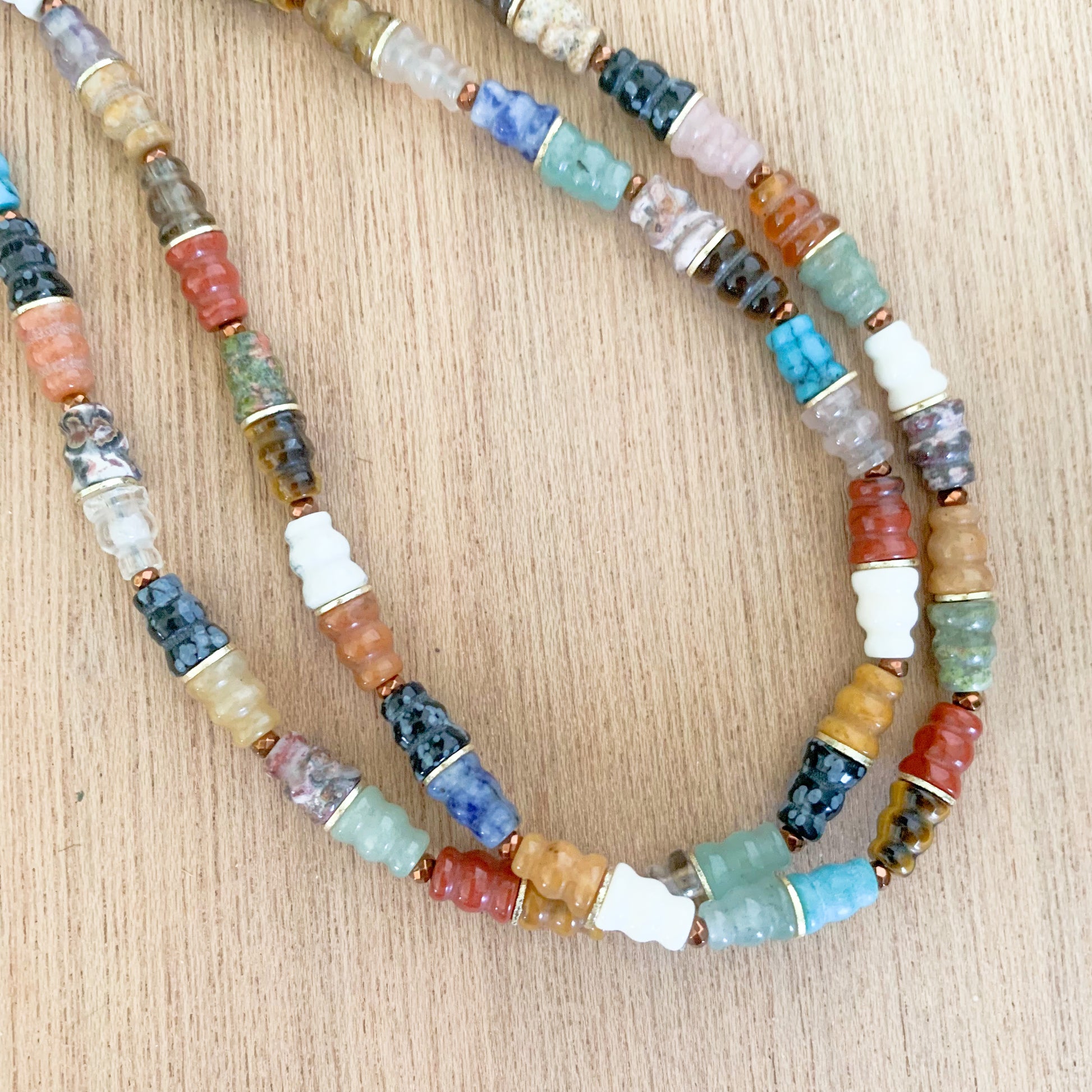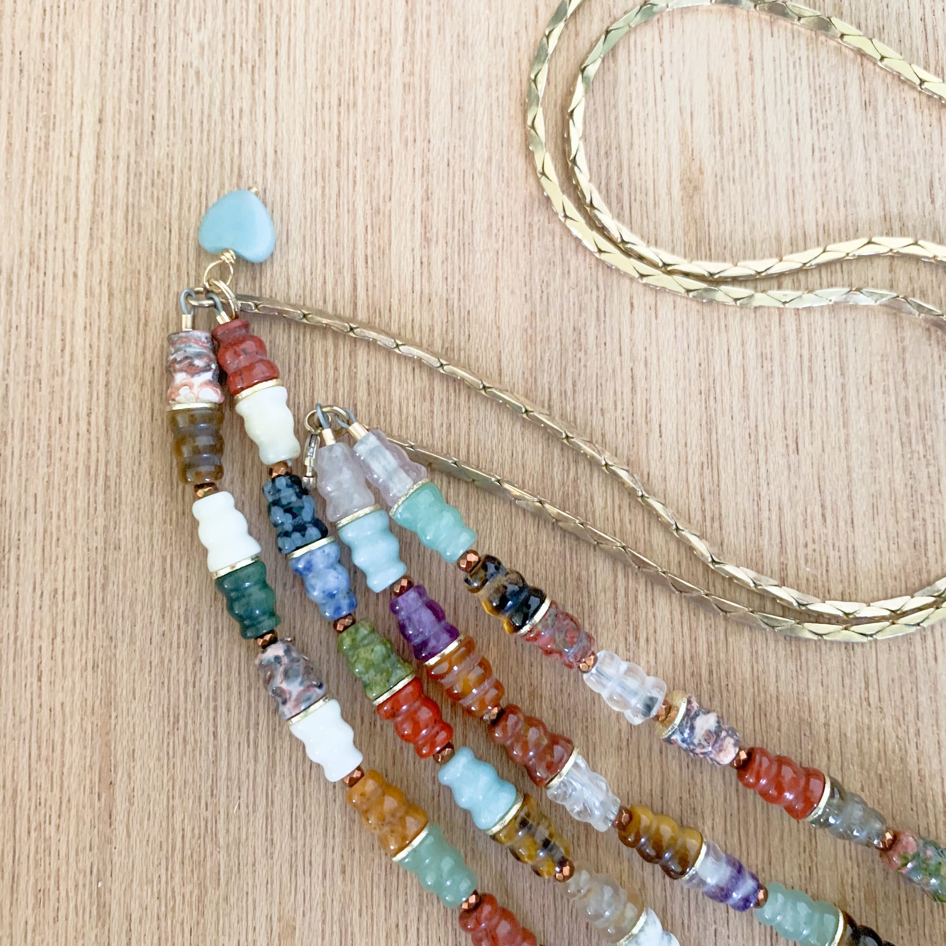 -beehive shaped precious stones, including amazonite, quartz, amethyst, lapis, tiger's eye, jasper, jade, carnelian, and more.