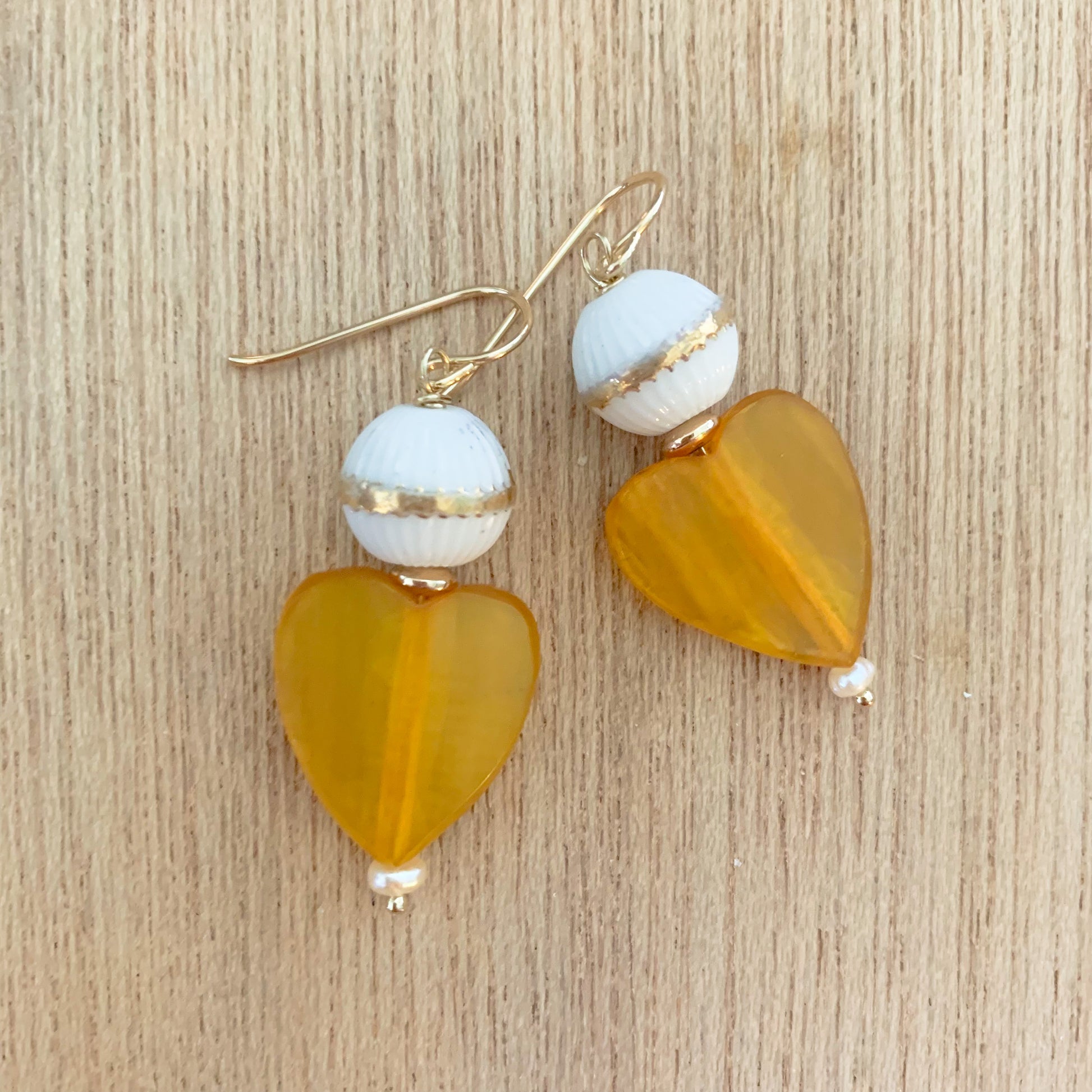 The prettiest yellow horn heart beads are paired with vintage white glass with gilt striping. These are such a cheerful little pair of earrings!
