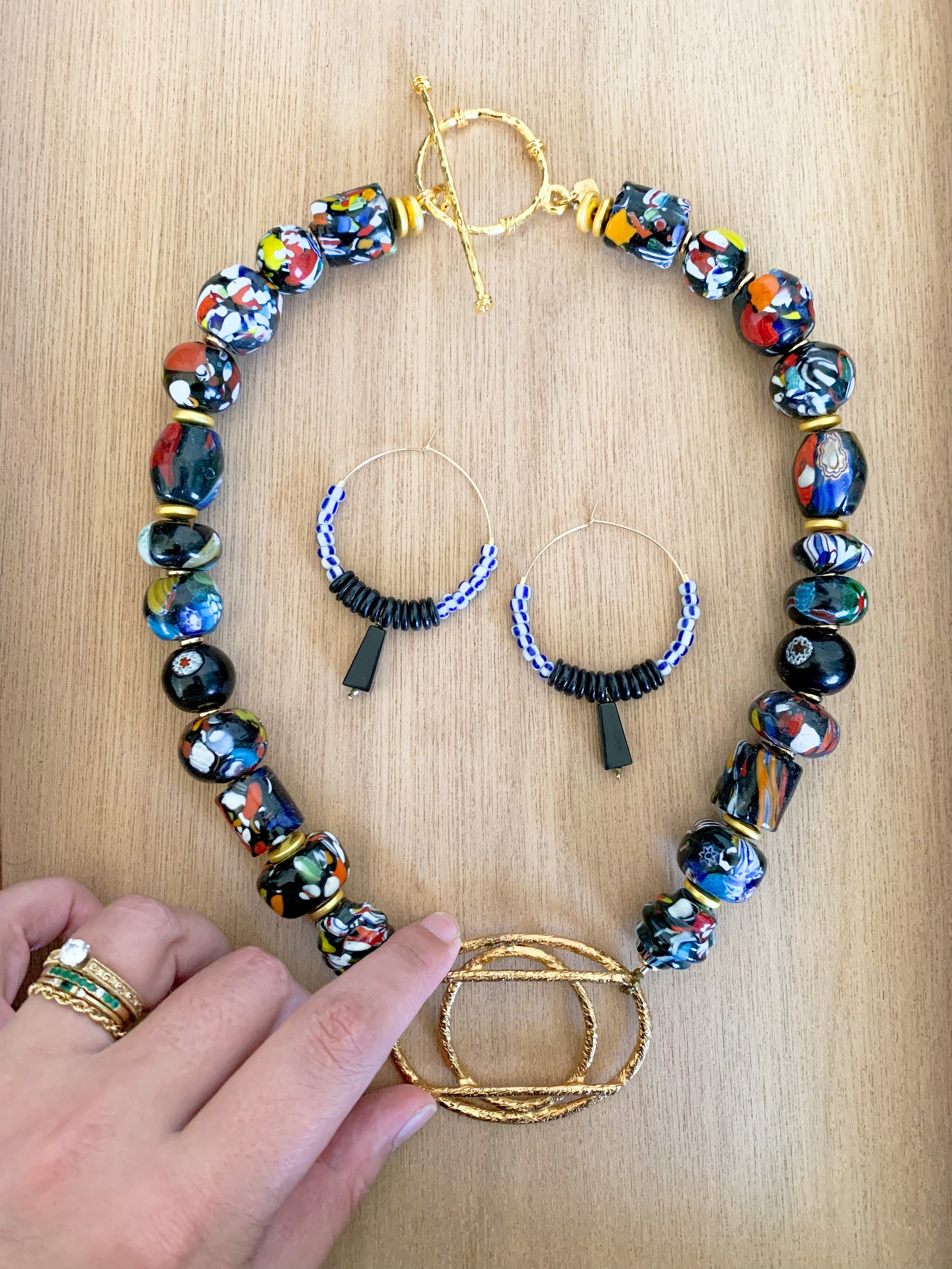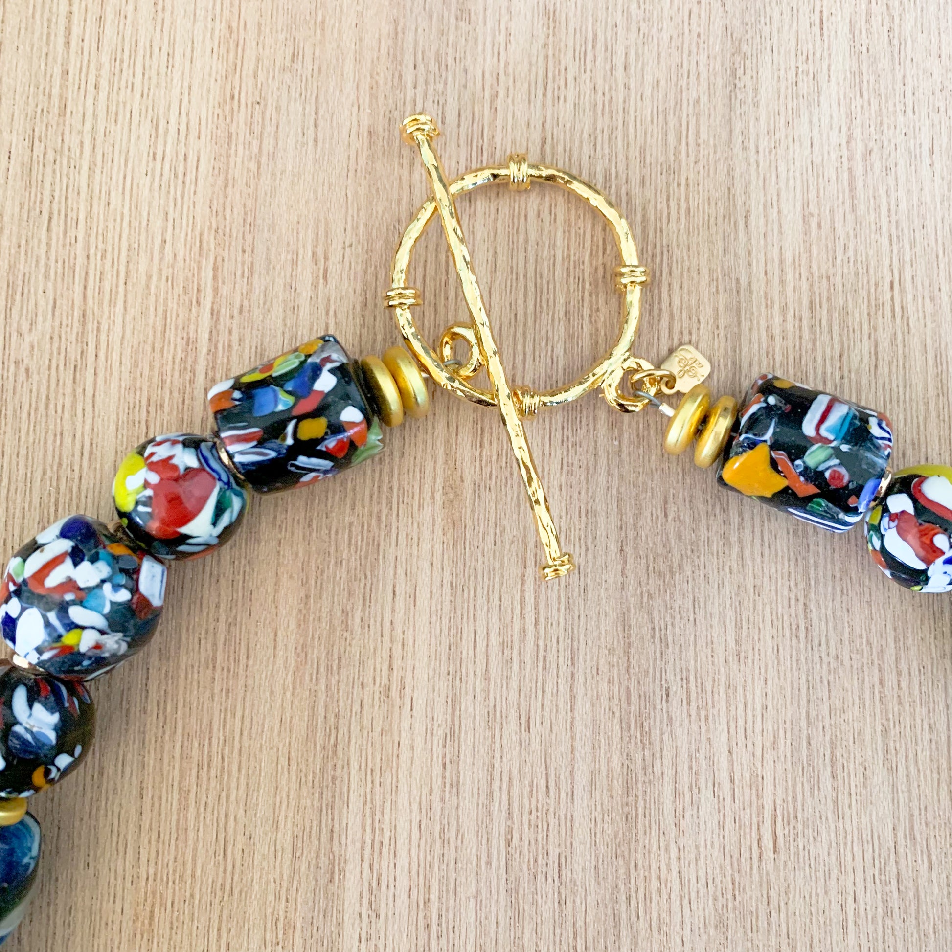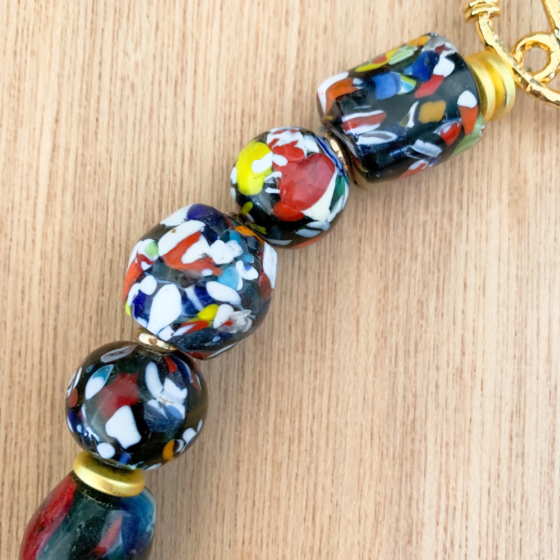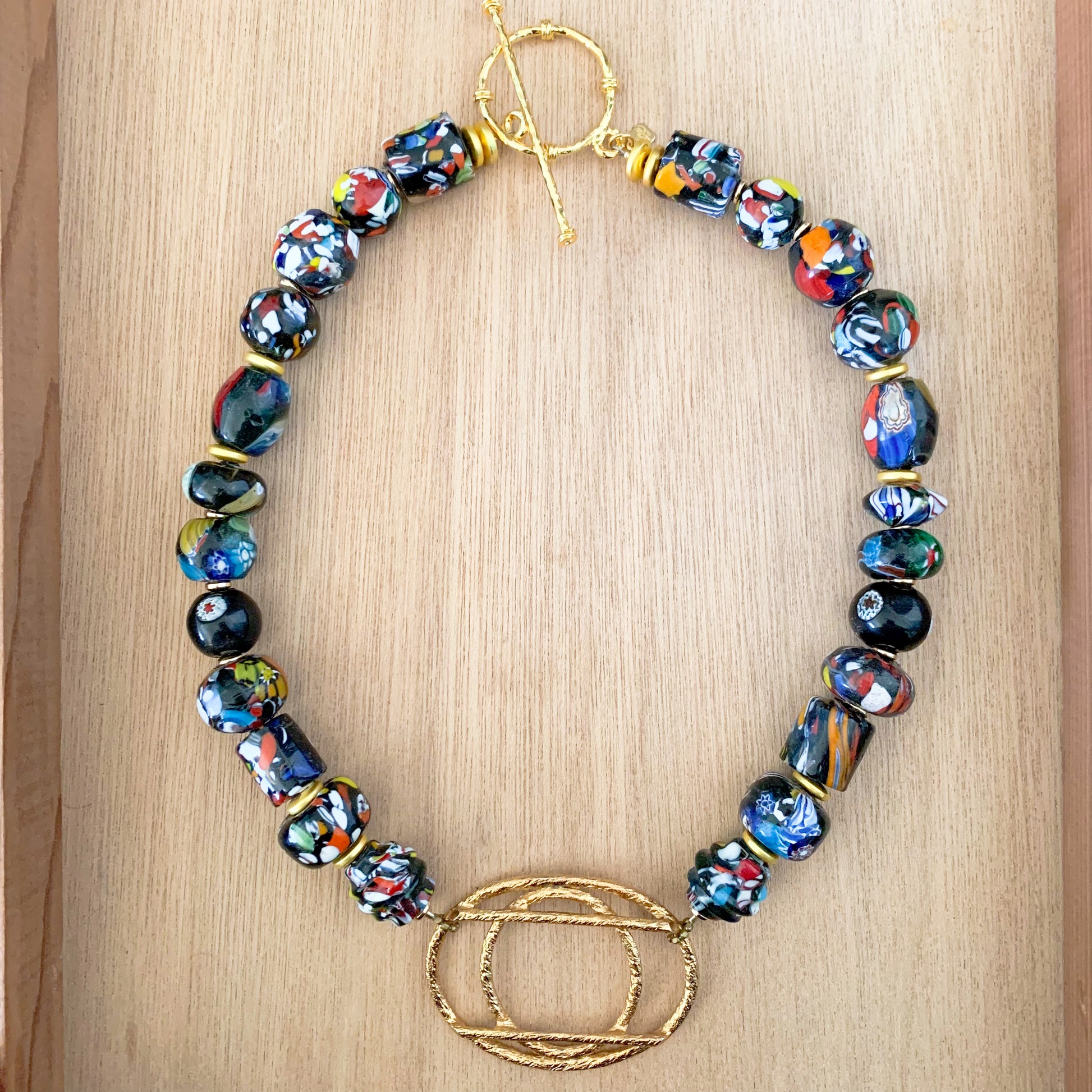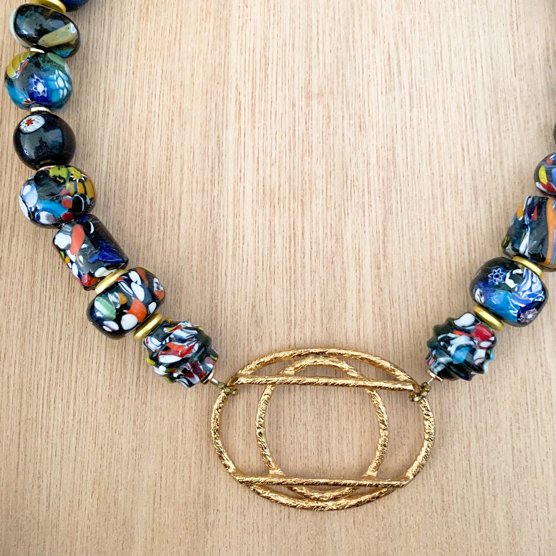 Italy meets England: These stunning Venetian Millifiore glass beads are paired with a vintage gilt buckle from England (maker's mark stamped on the back!) for a special statement necklace! Millifiore means Thousand Flowers, because it is made up of tons of tiny tubes of glass that when sliced look like flowers. These beads are usually made with scraps from other projects in effort to salvage and reduce waste. They are beautiful!