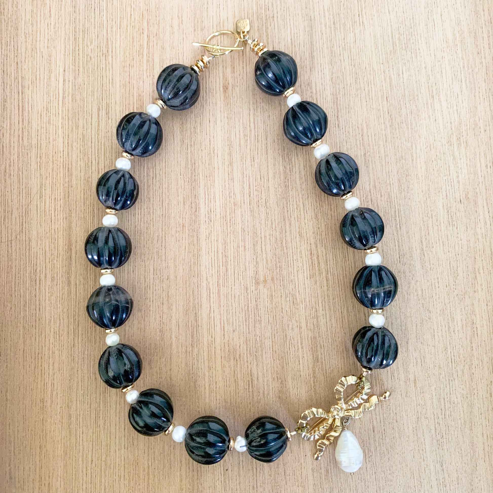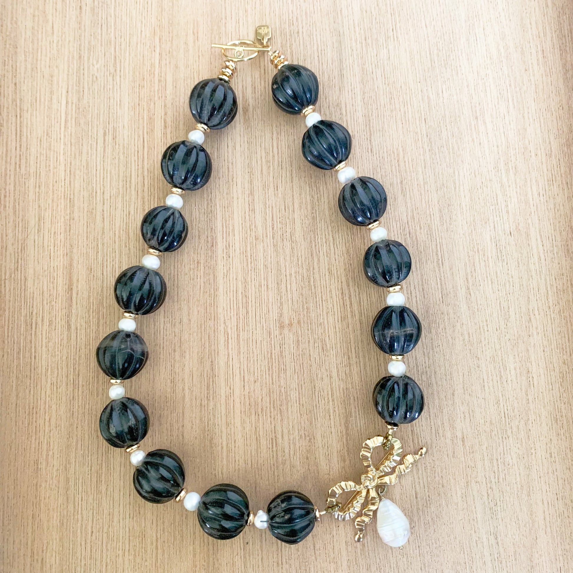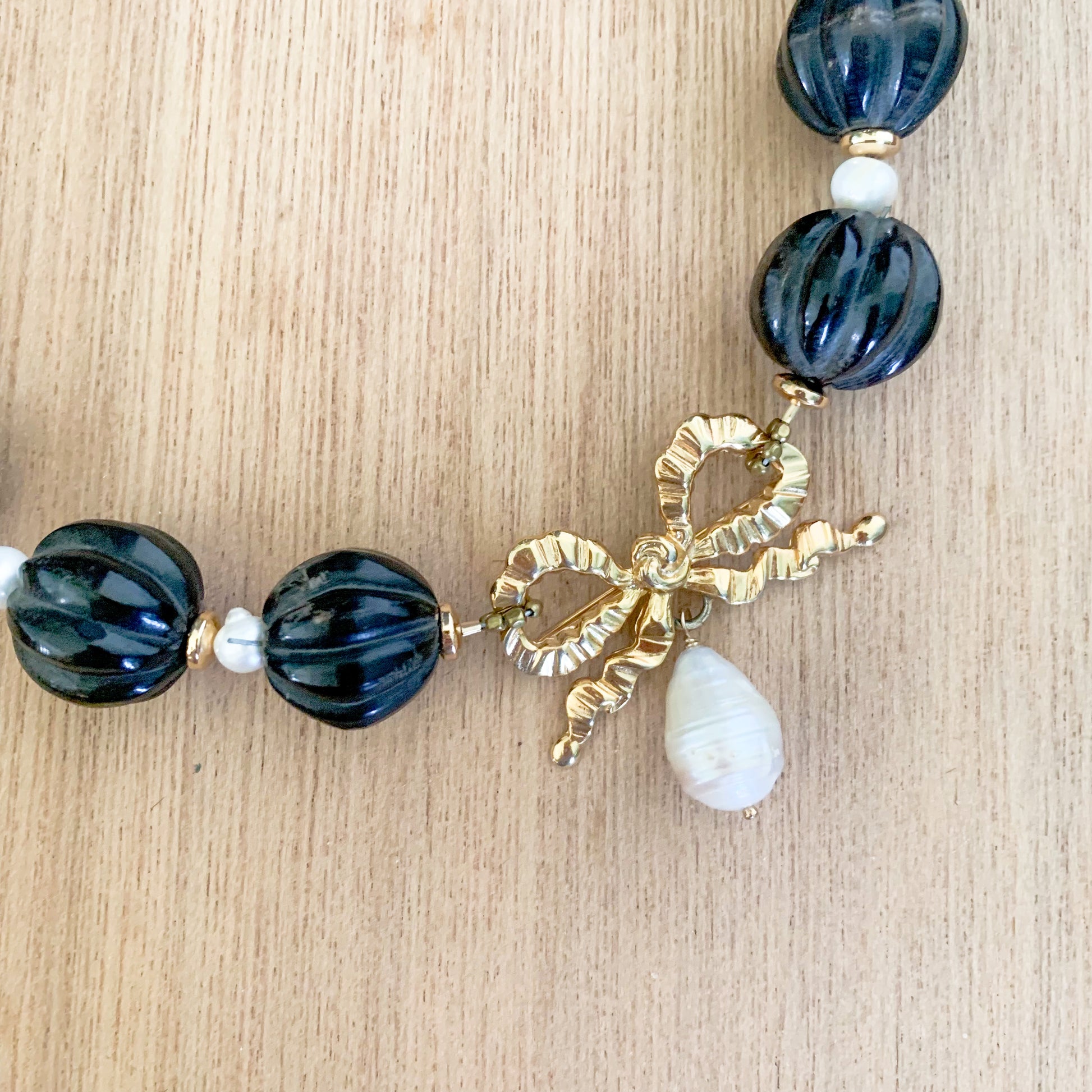 We've seriously fallen for this series of bows! A quaint little vintage gold tone bow brooch is set amongst the prettiest little pearls and scalloped horn beads. A large baroque pearl sways to and fro from the brooch, which is just charming!