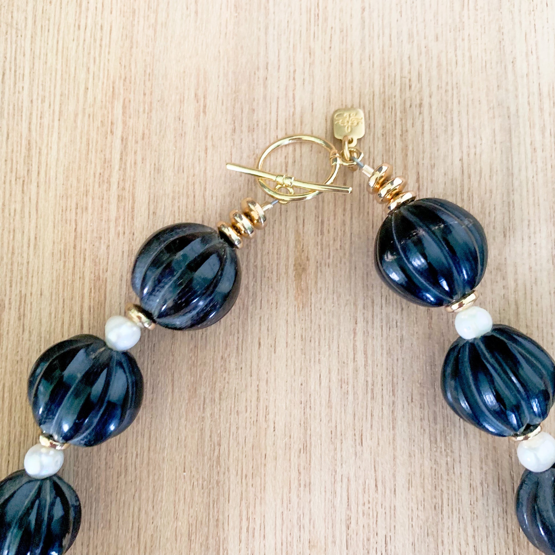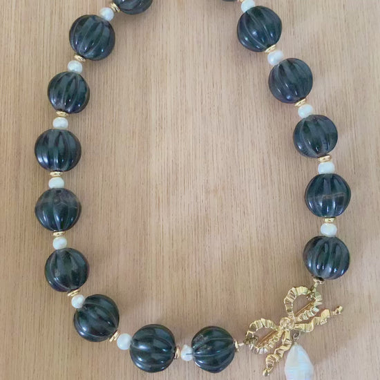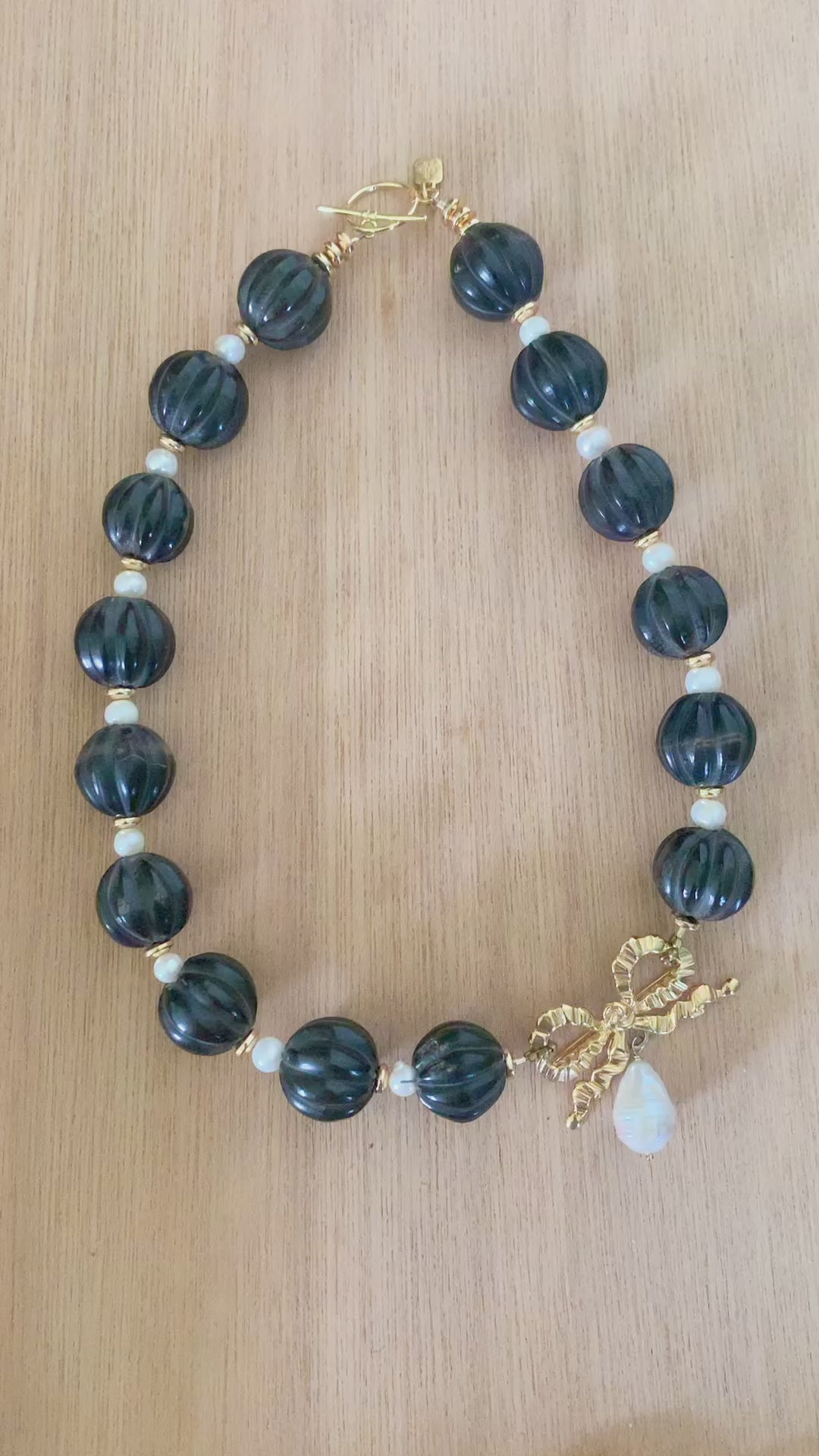 We've seriously fallen for this series of bows! A quaint little vintage gold tone bow brooch is set amongst the prettiest little pearls and scalloped horn beads. A large baroque pearl sways to and fro from the brooch, which is just charming!
