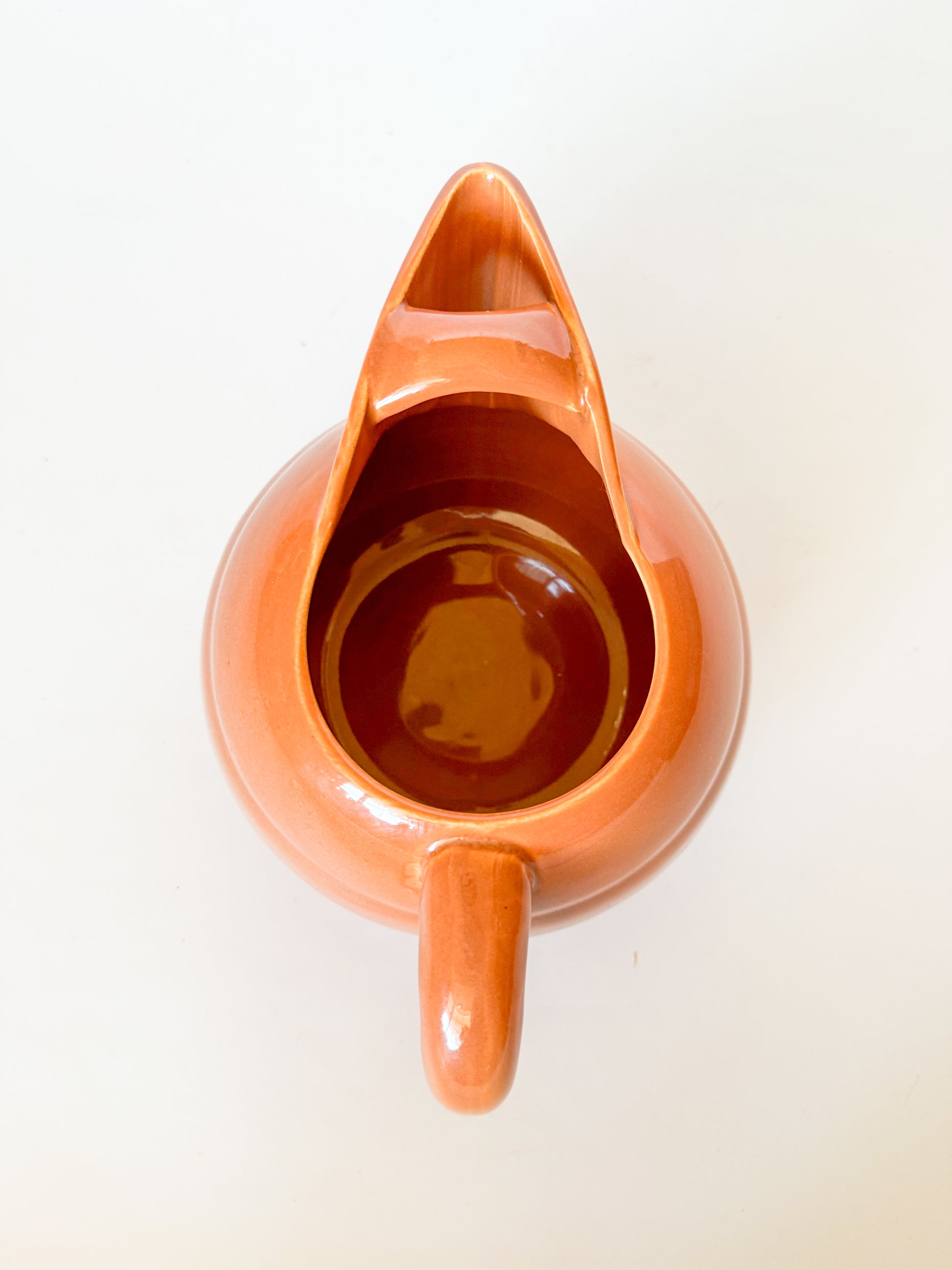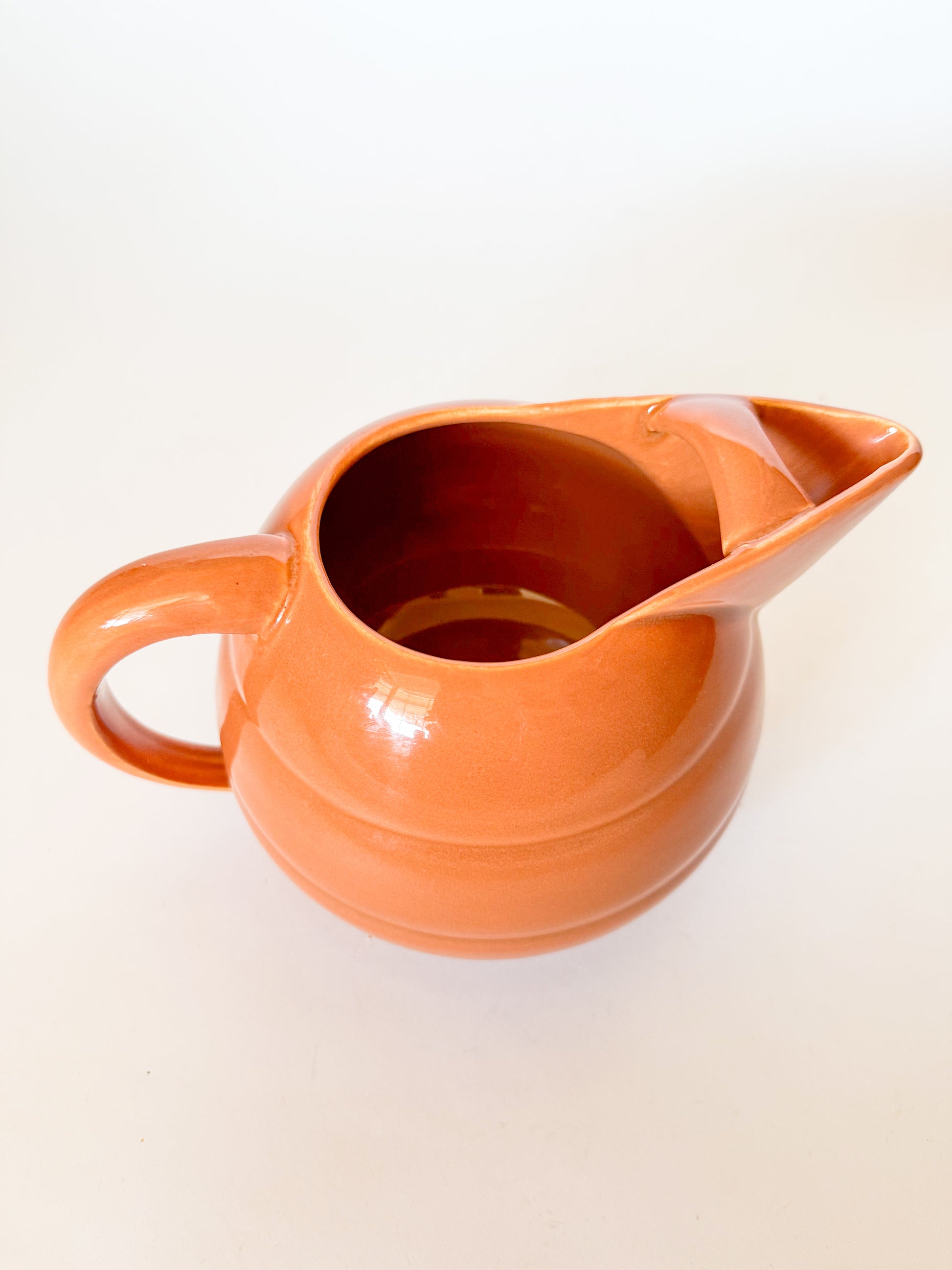 Excellent example of 1930s California Art Deco pottery by Bauer. This terracotta rust colored pottery pitcher features their signature beehive shape with ringed tiers. It has a long pointed spout with an ice lip, perfect for pouring gracefully.