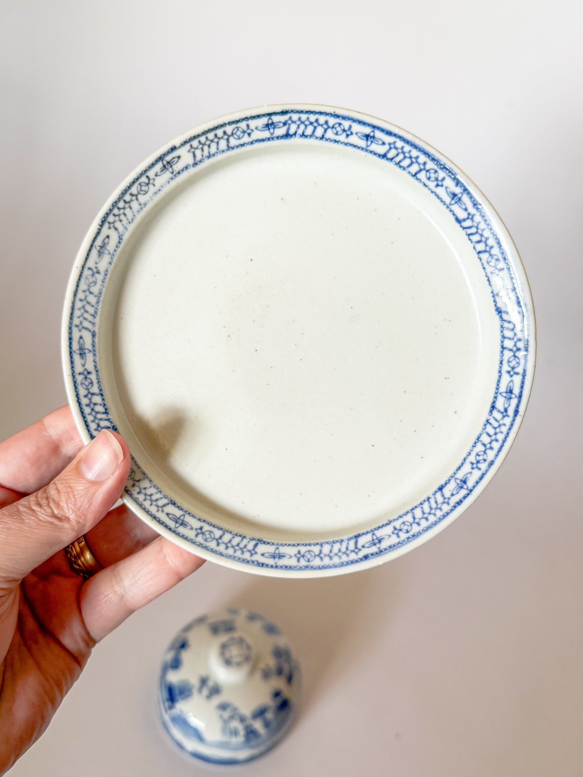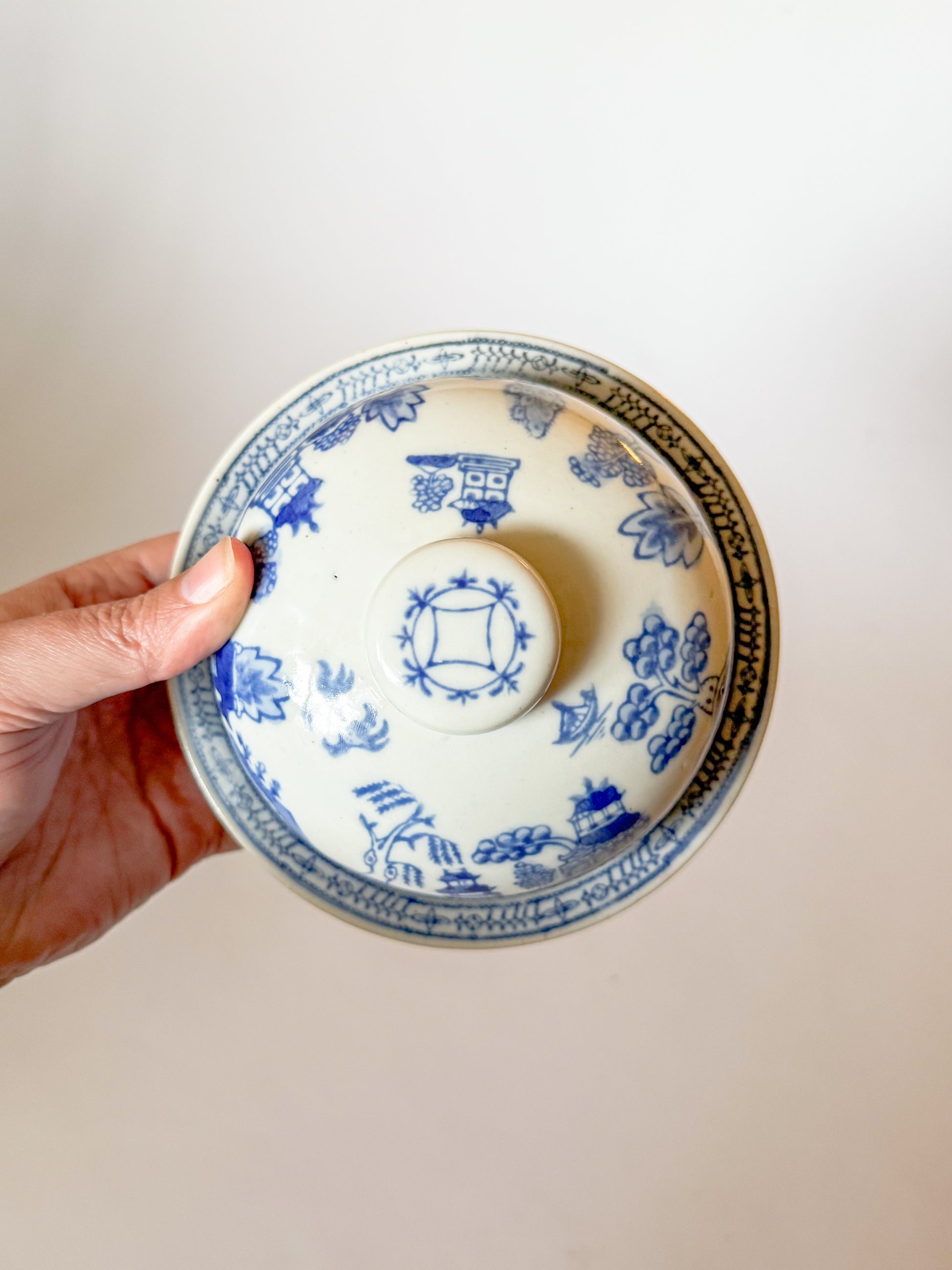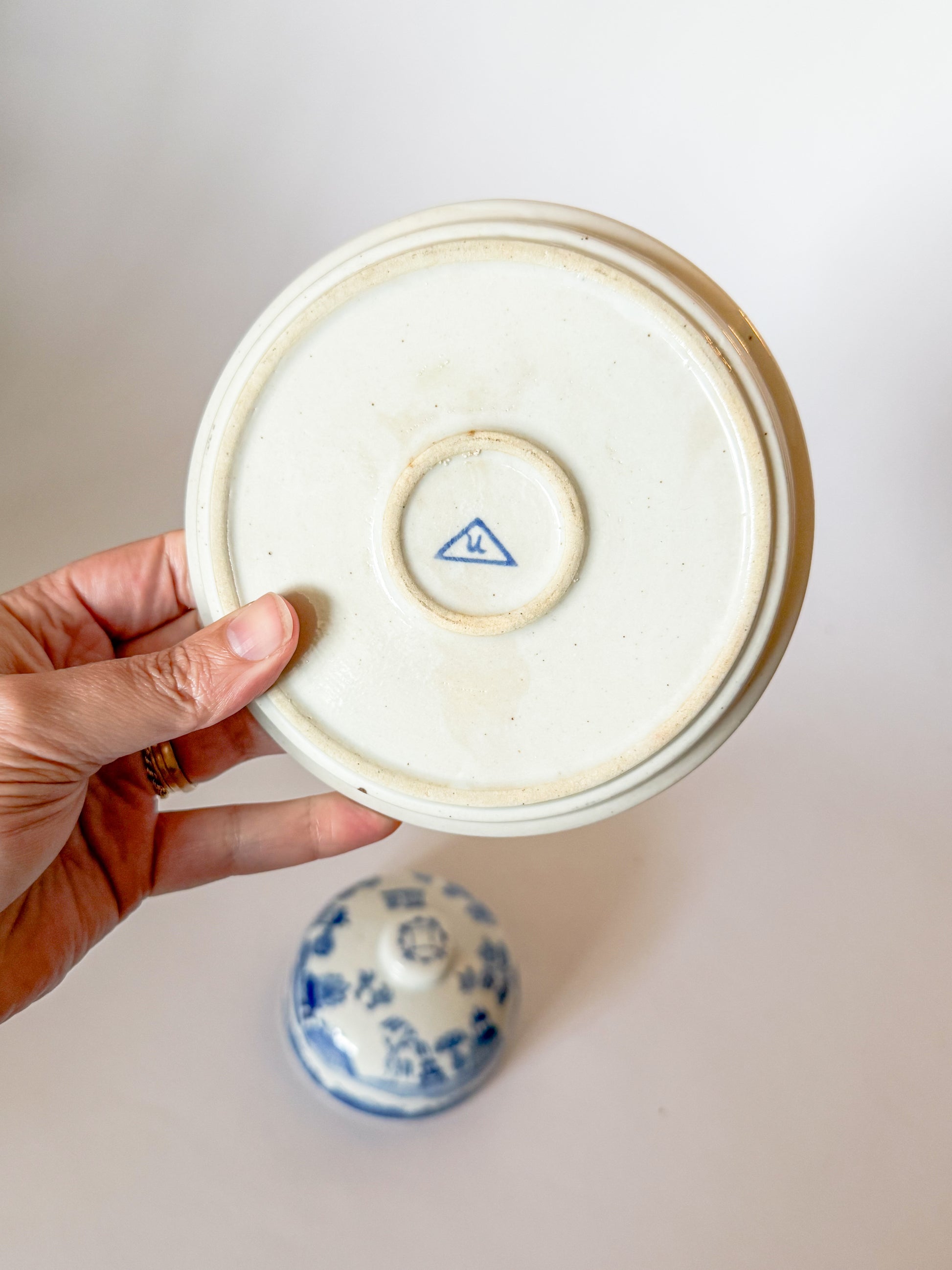 Charming and unique covered dish in a variation of the beloved Blue Willow Pattern. Make your charcuterie tray a little more elegant with this piece as a cheese dome, or use it as a butter dish for some extra chic style. This piece came from a blue and white collector's estate sale!