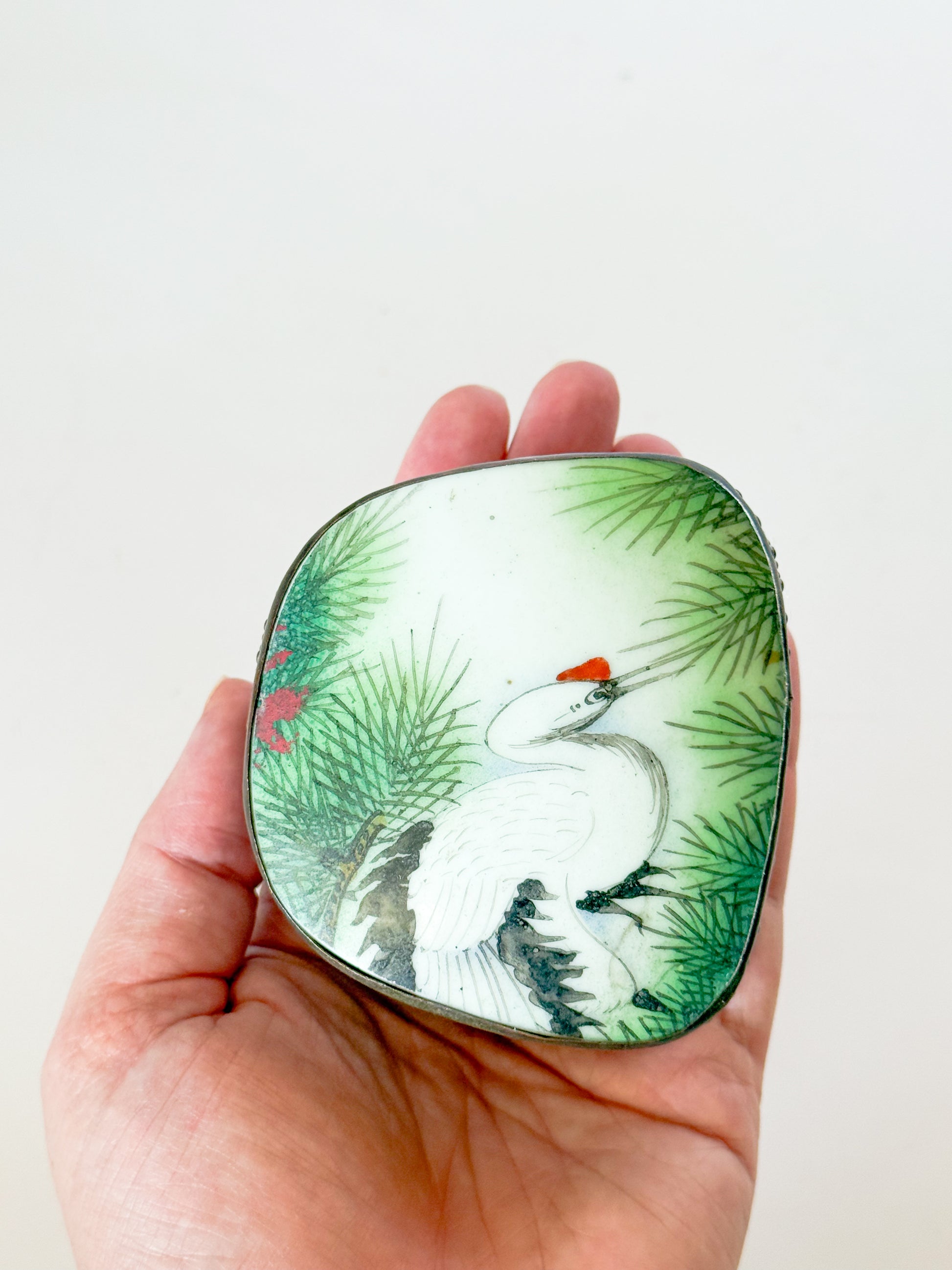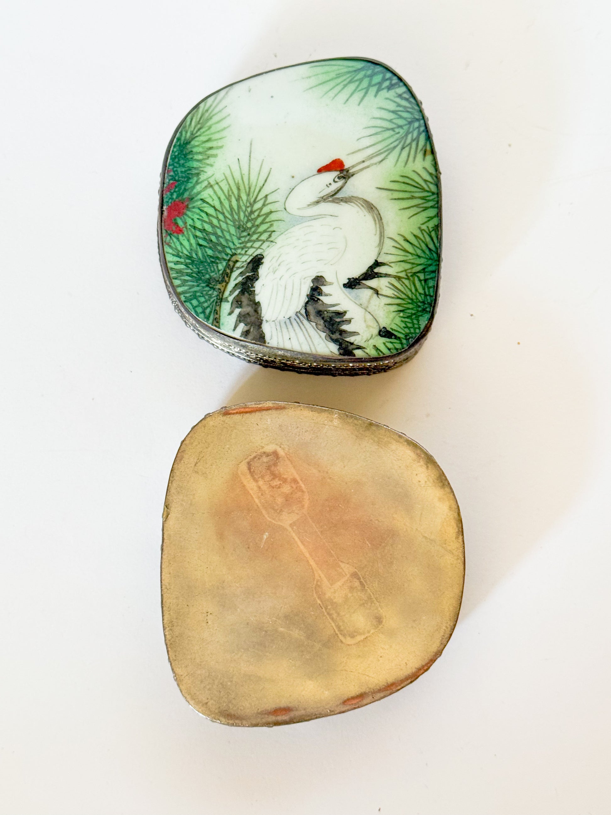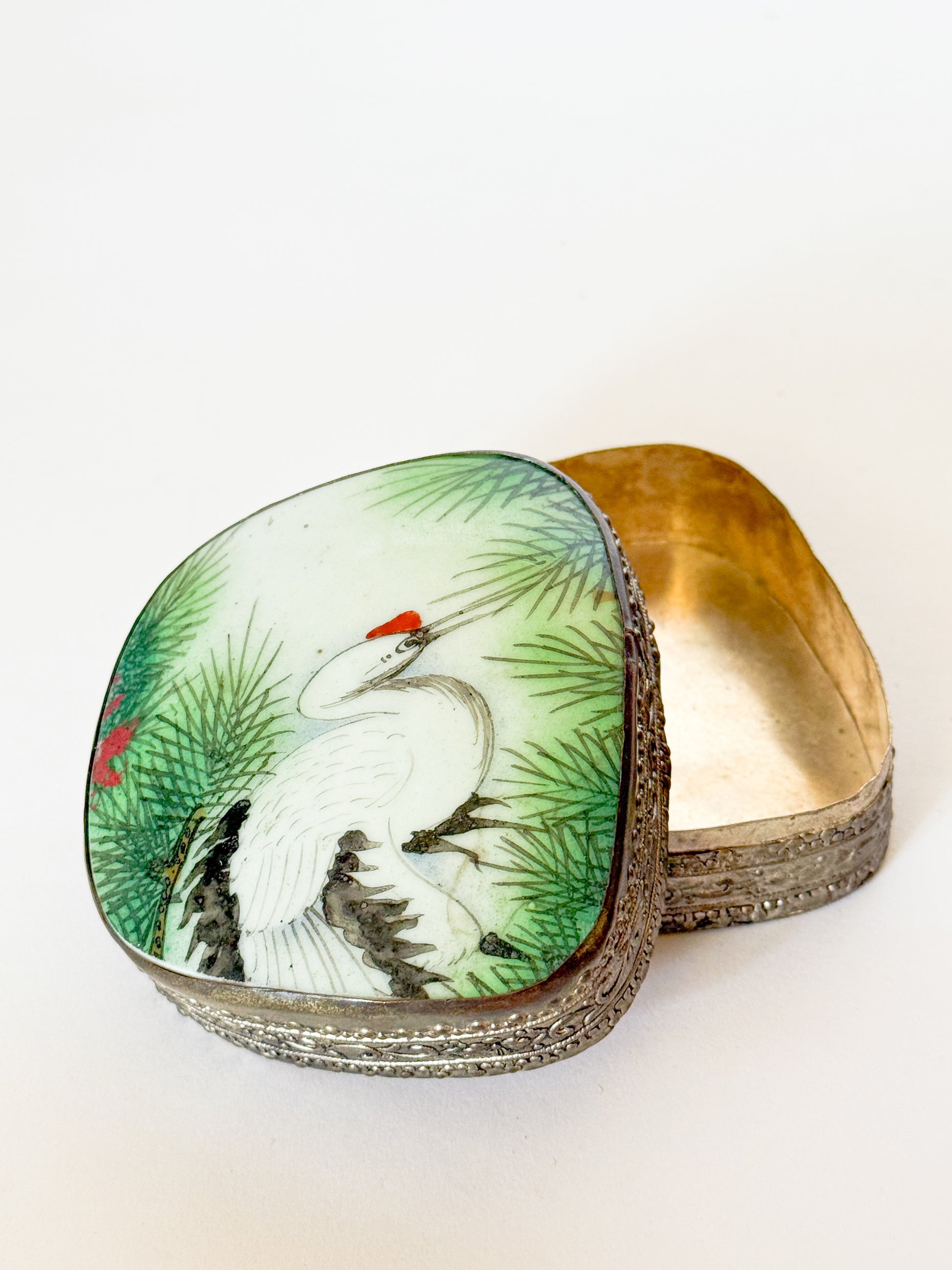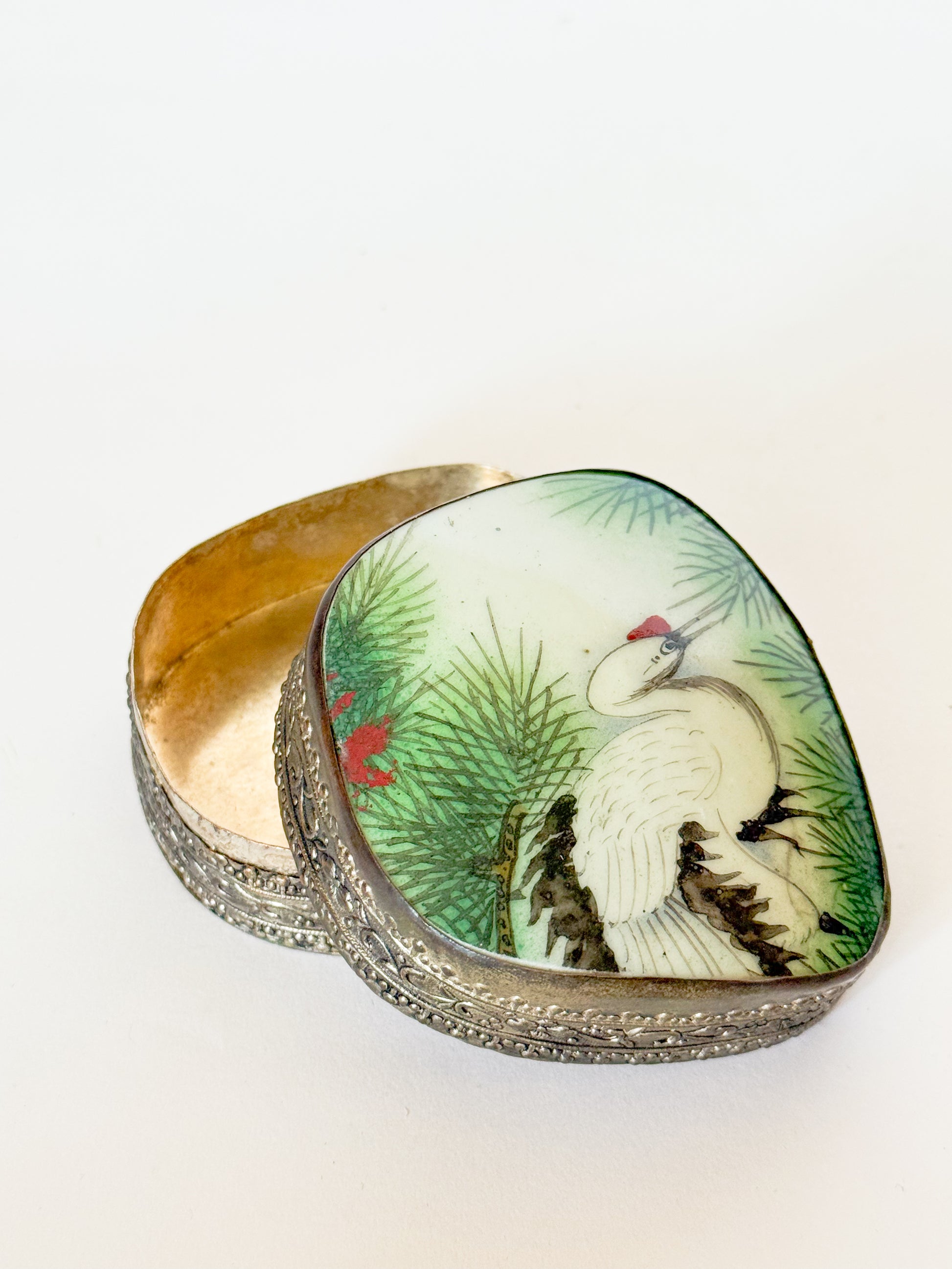 Box is circa 1960s. Made from an antique piece of porcelain and decorative silver-tone metal, the vintage box has a hand-painted scene of a white crane amidst green leafy plants.
