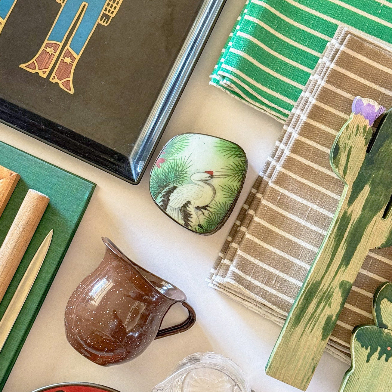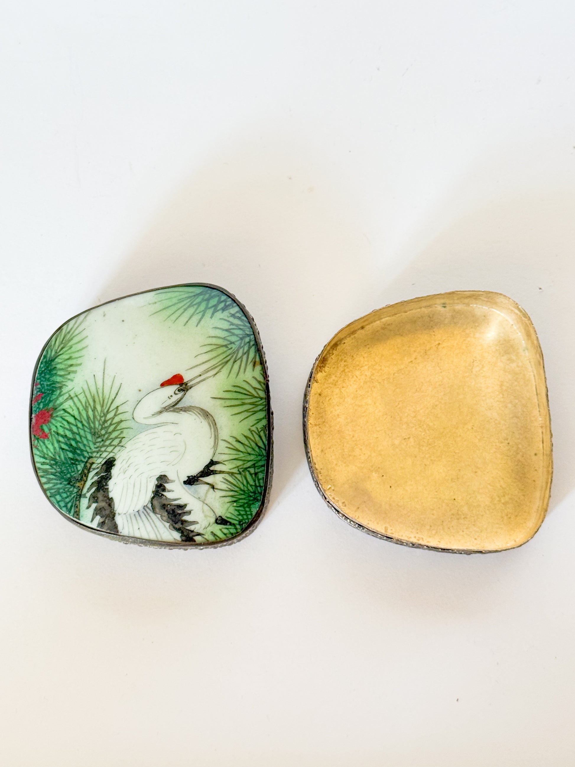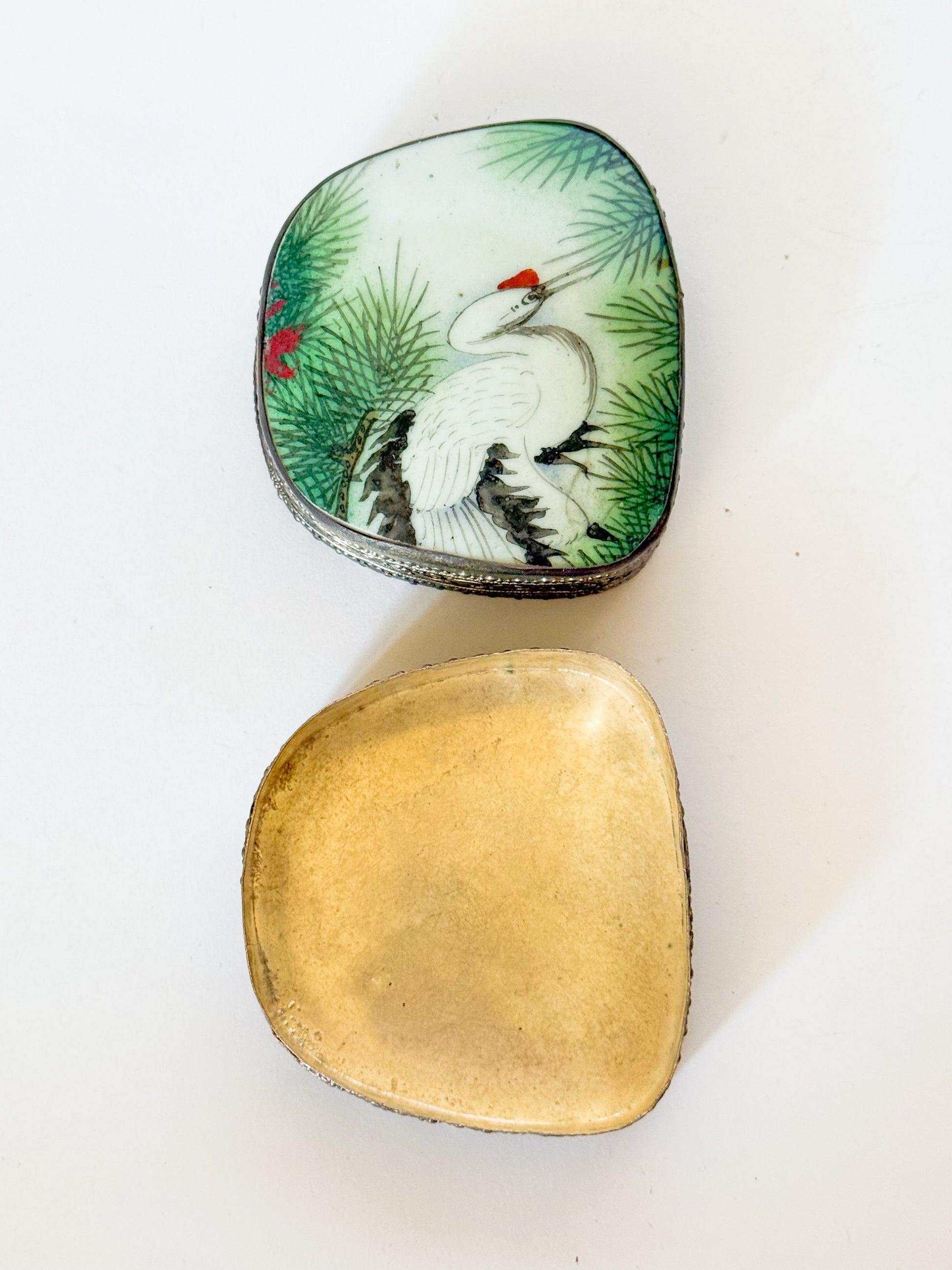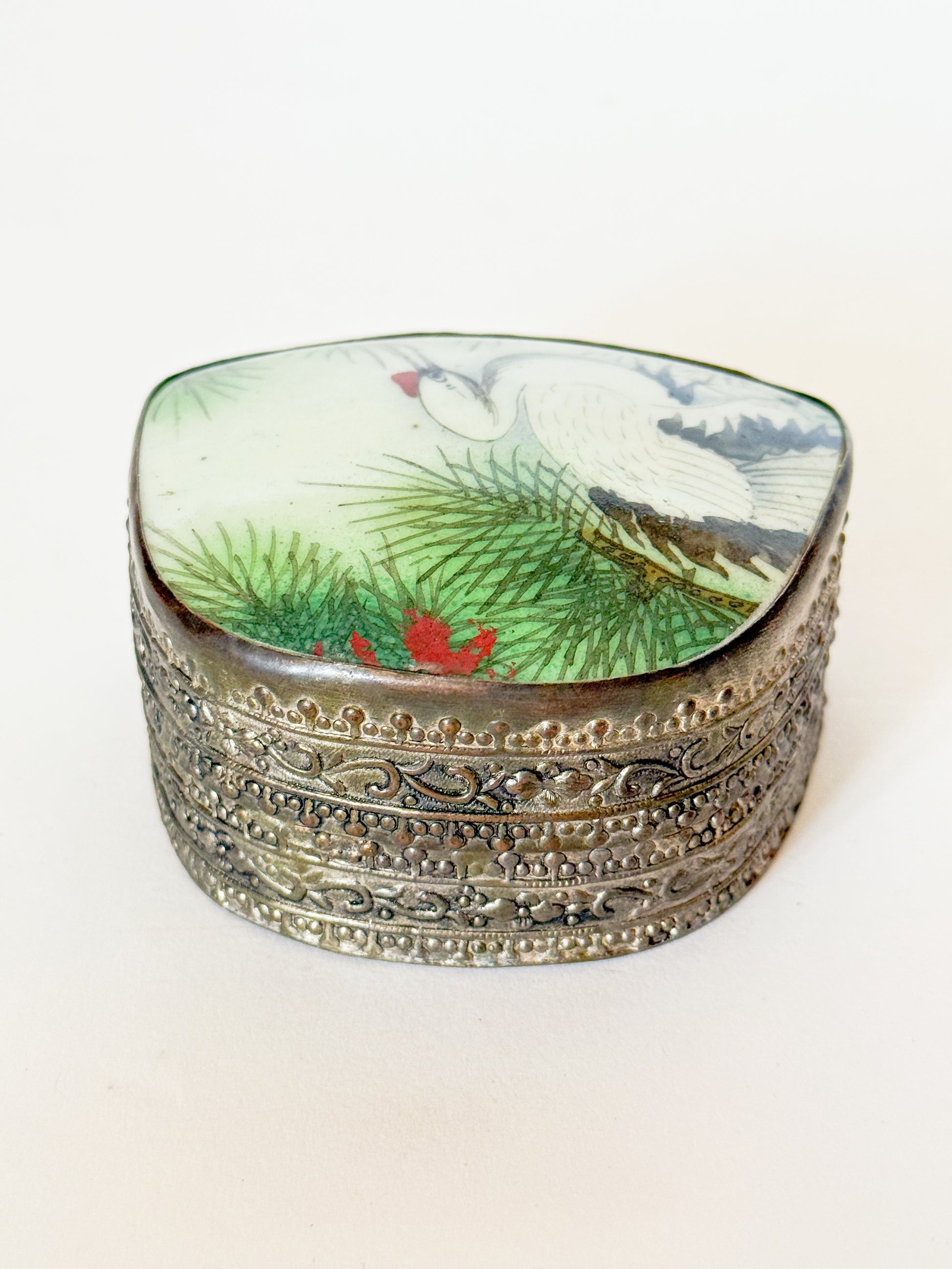Box is circa 1960s. Made from an antique piece of porcelain and decorative silver-tone metal, the vintage box has a hand-painted scene of a white crane amidst green leafy plants.