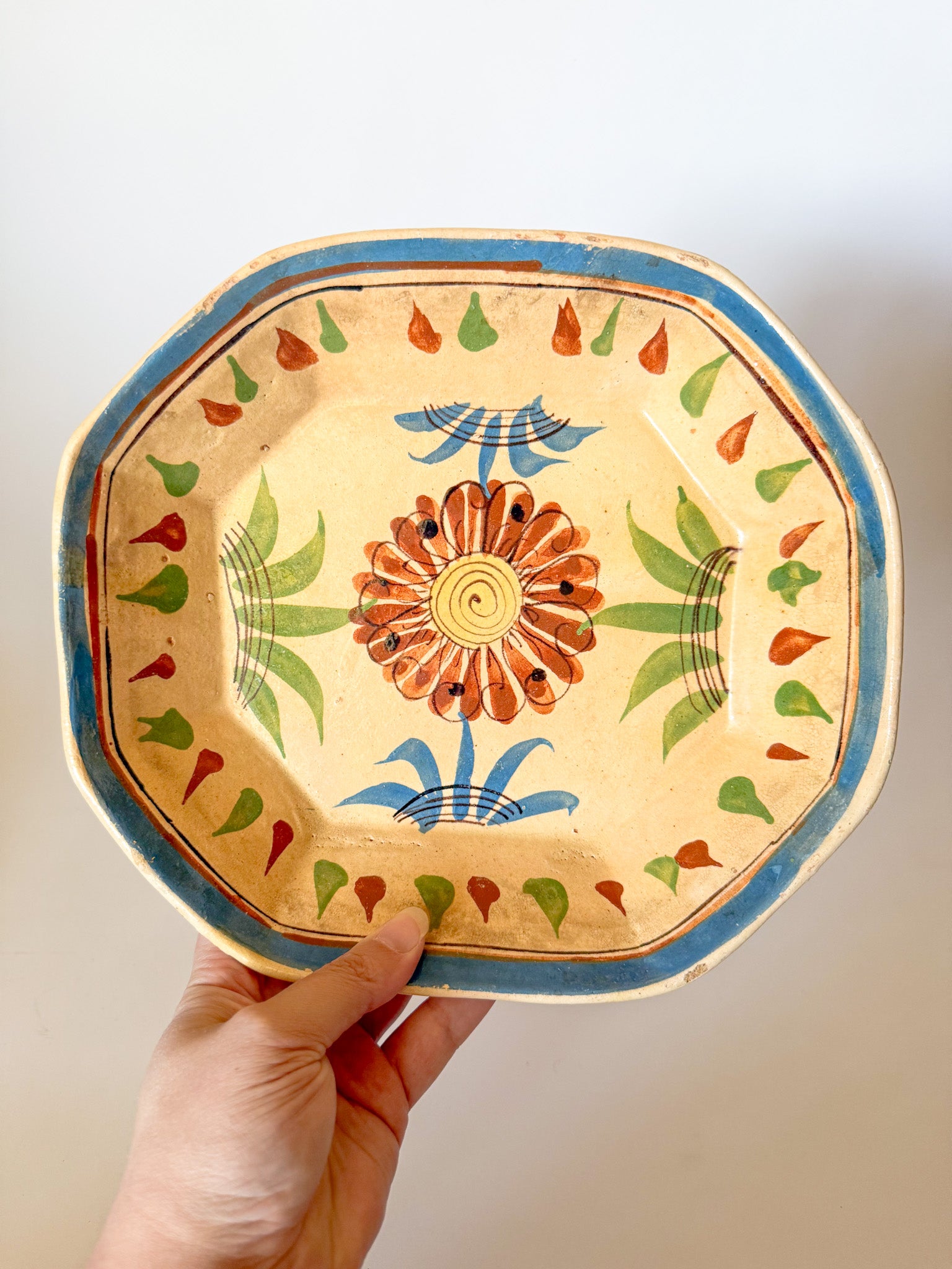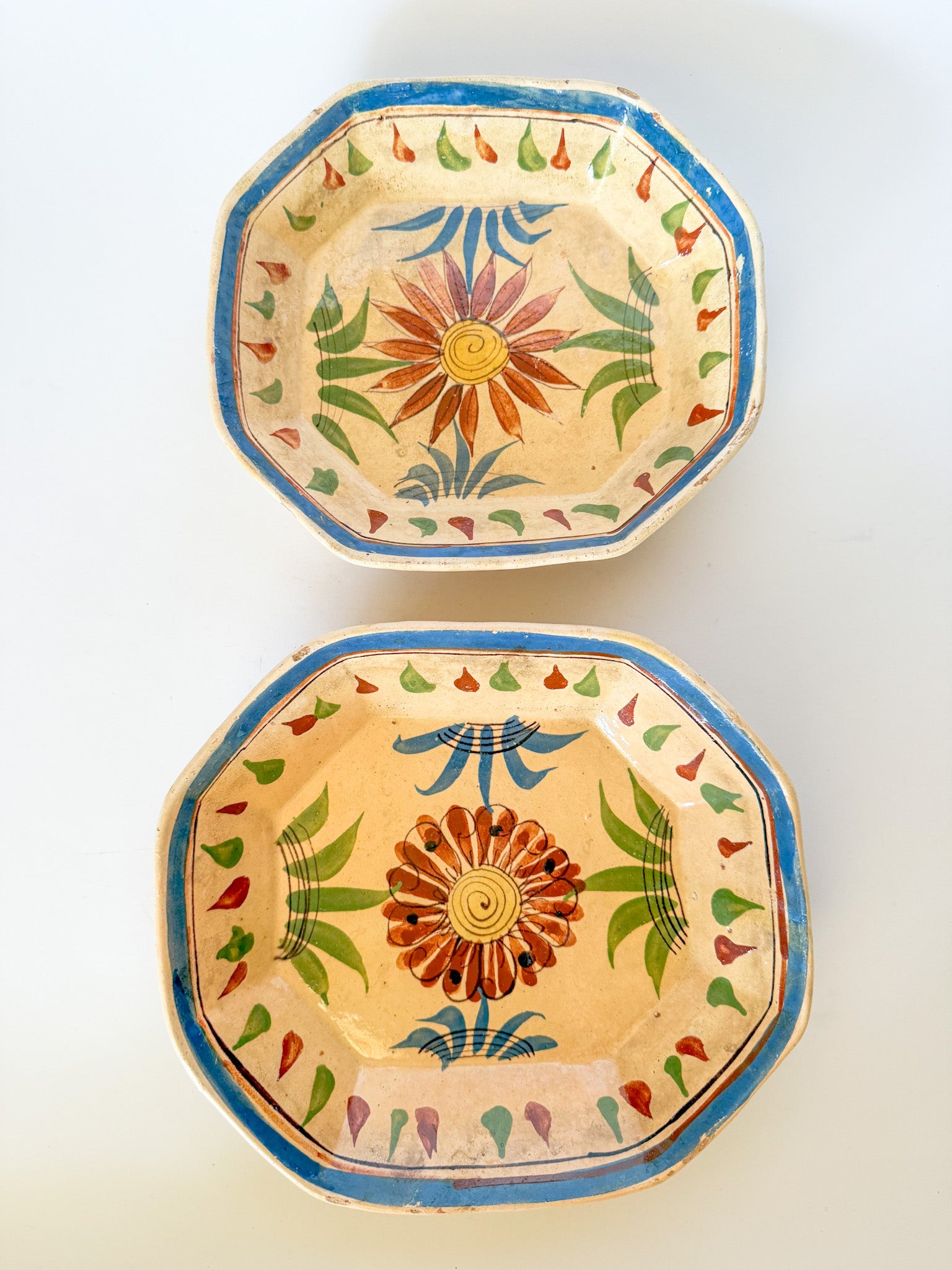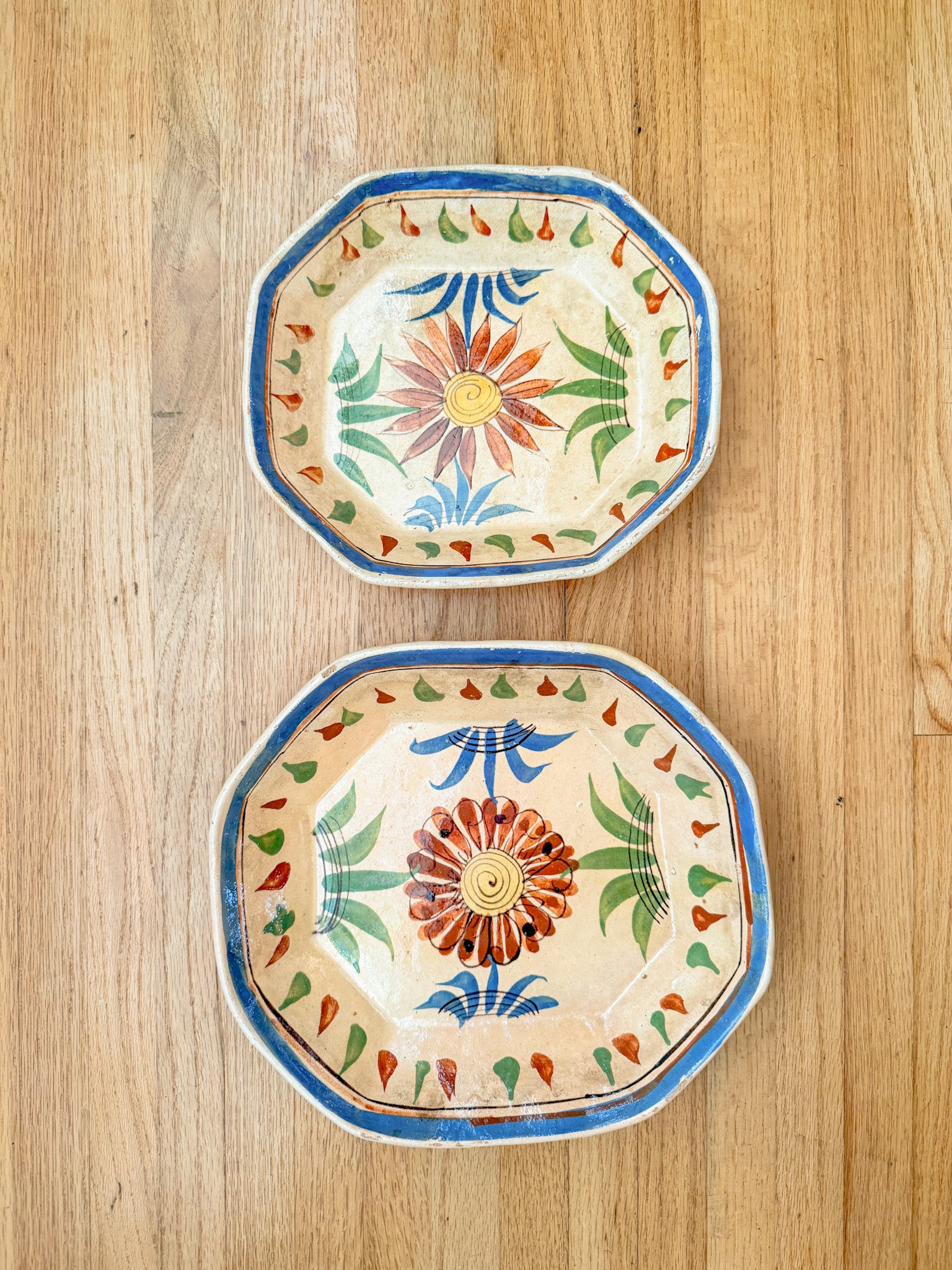 I love and personally collect Mexican pottery, so I tend to be very picky about what I source. This set is really beautiful with a creamy yellow background and a great flower and border motif in shades of rust, denim blue, and green. Iconic Tlaquepaque pottery at its finest!