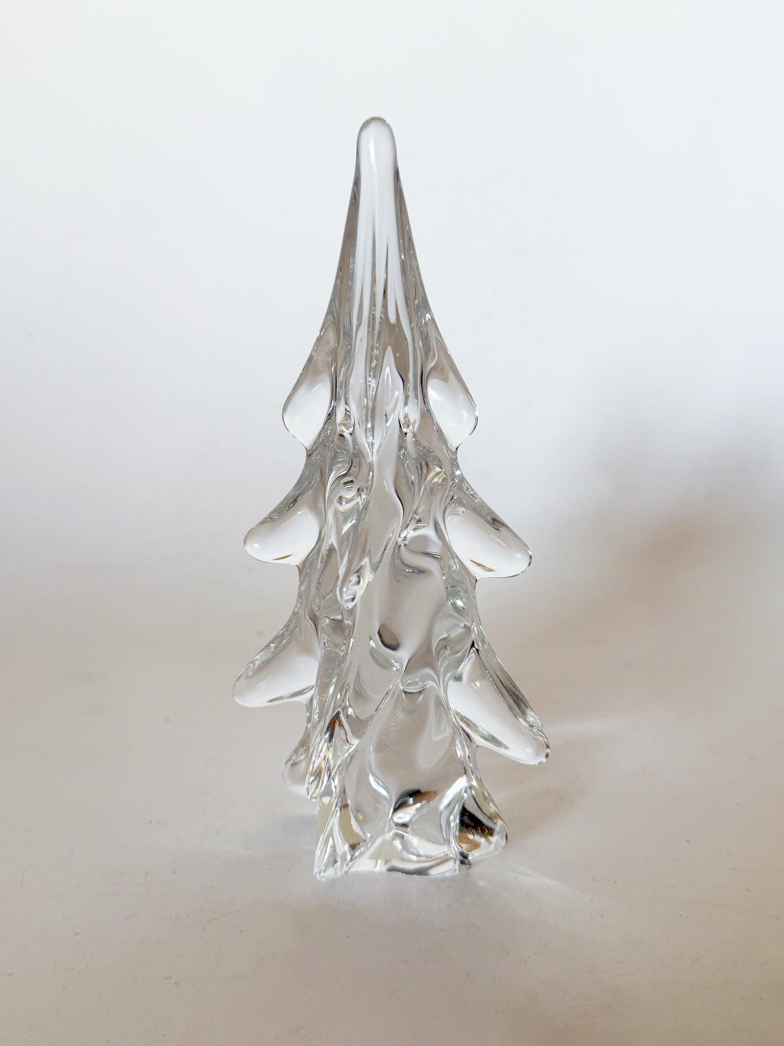 An elegant and simple blown glass crystal Christmas tree, made in Japan. This artisan hand blown tree has a polished pontil mark on the bottom, and would be lovely grouped with other trees!
