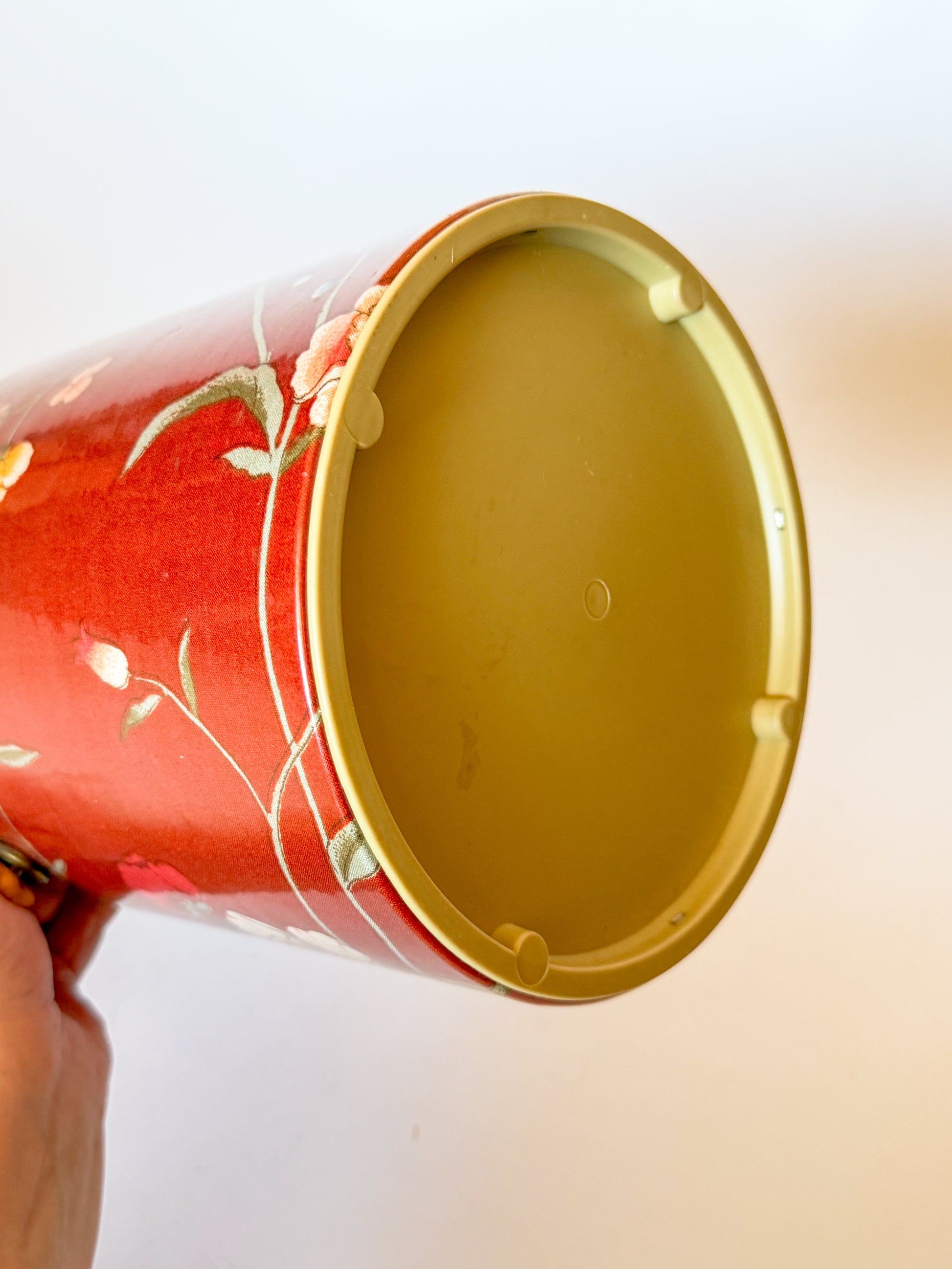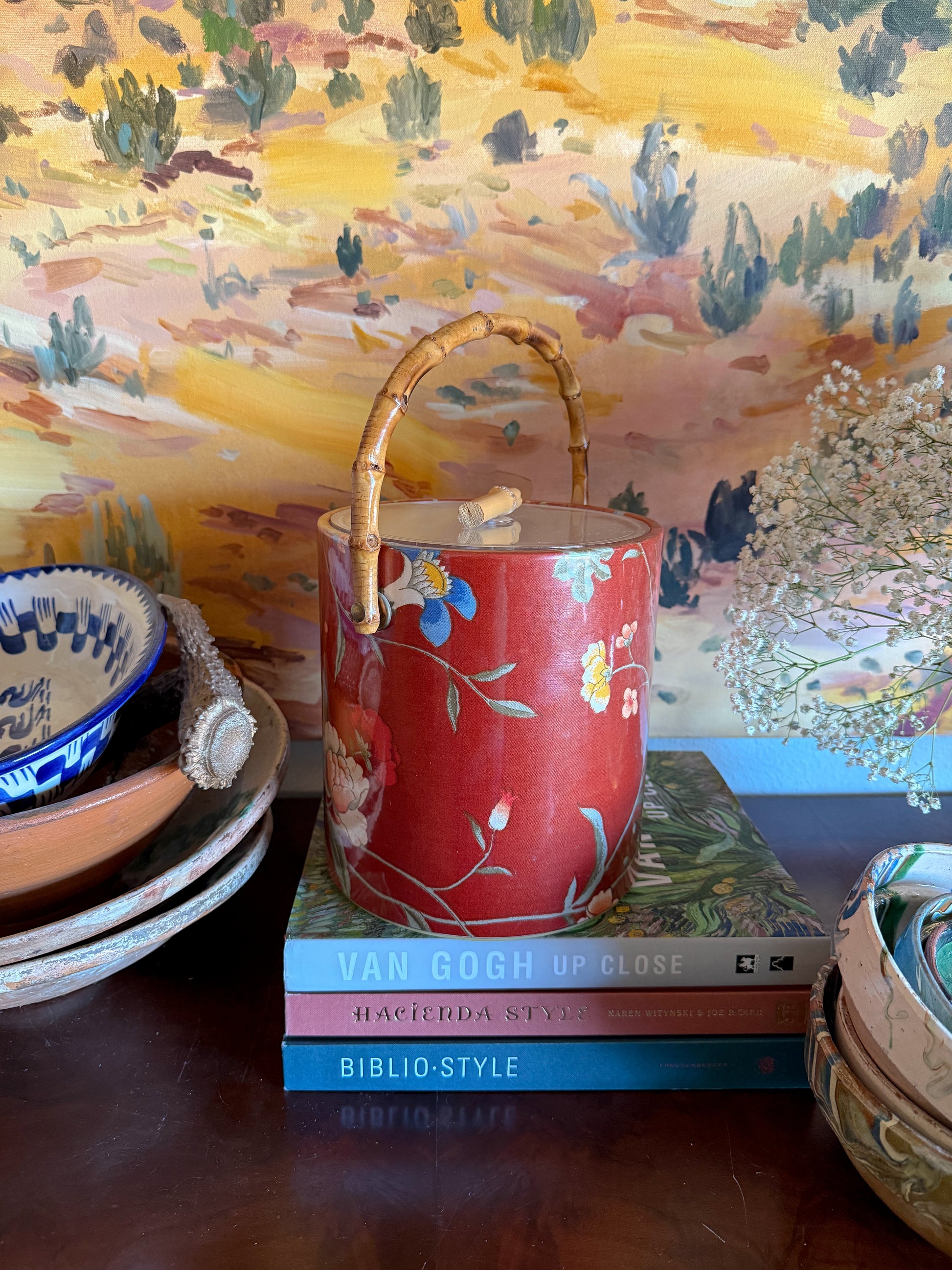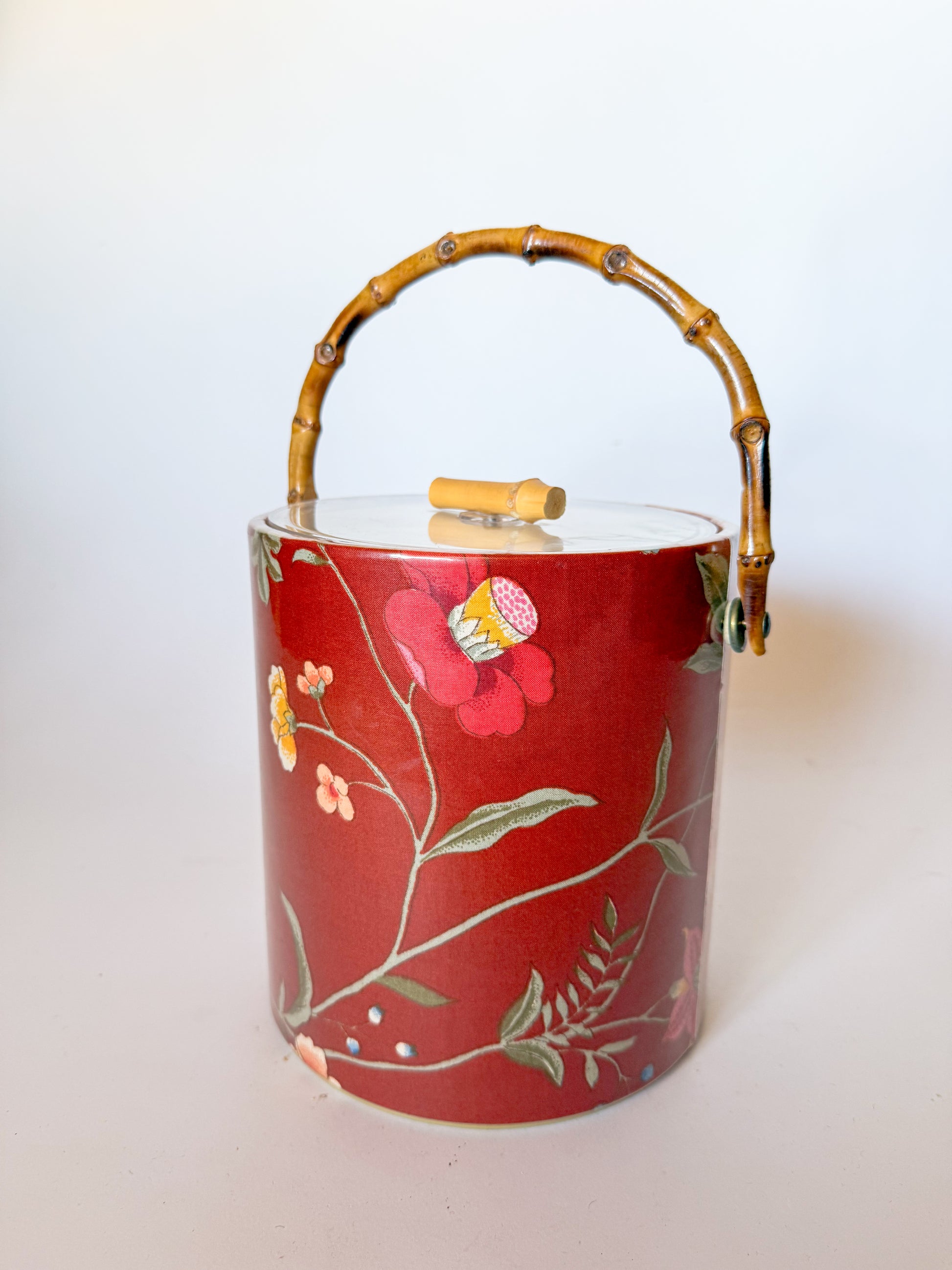 Absolutely fabulous vintage floral chintz ice bucket featuring a burnt bamboo handle and knob, giving a Chinoiserie meets English Cottage look. This statement piece is so lovely, words hardly can describe it. The warm red fabric features scattered blooms in cheerful colors. It is covered in a sleek clear plastic layer to protect the fabric and make it easy to clean.