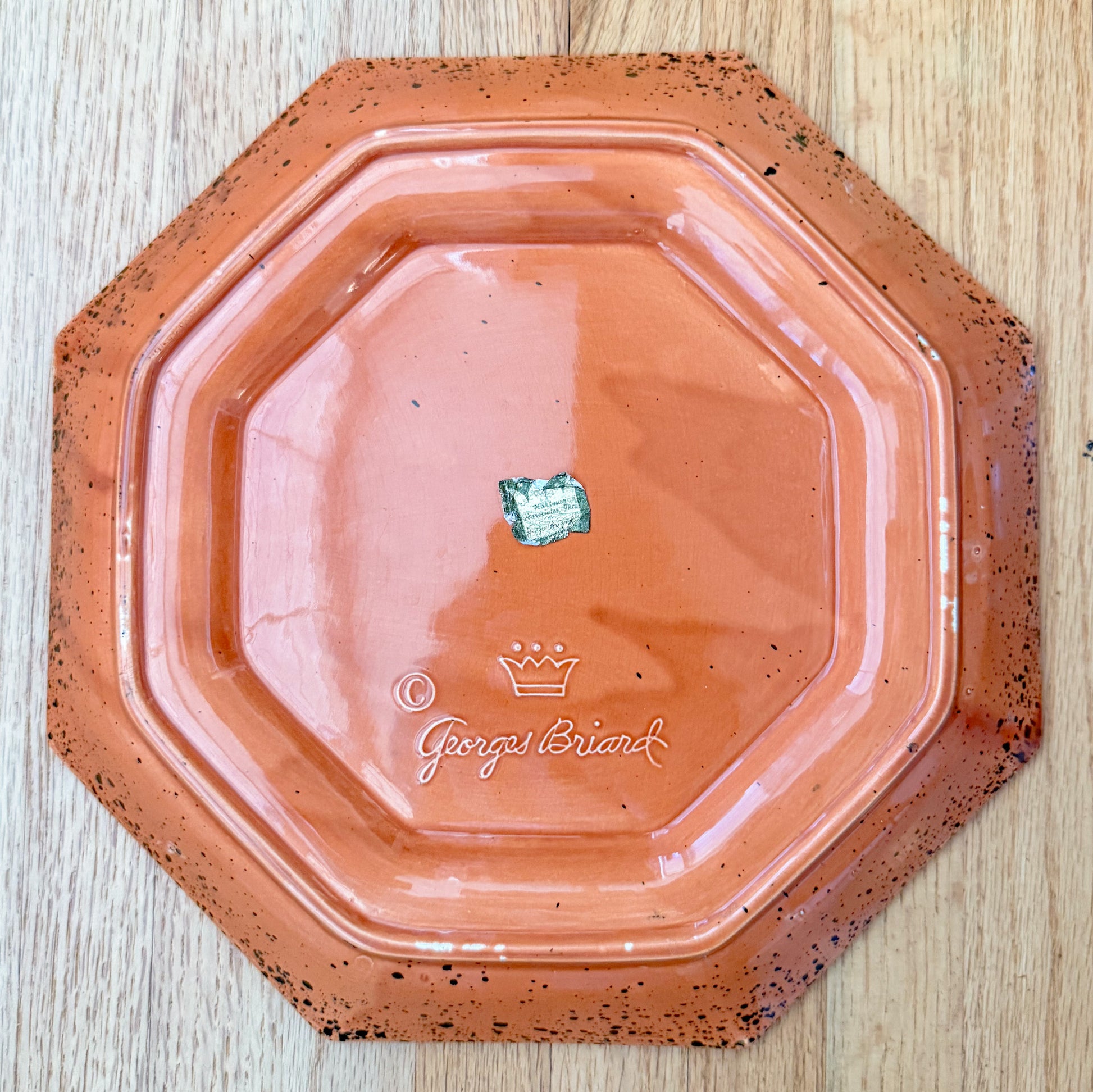 Serving charcuterie never looked so chic. Rare 1970s Georges Briard splatterware octagonal charcuterie serving plate, with removable wood center plate, in a lovely warm pumpkin color with dark green splatter, reminiscent of the popular Sharland pieces made in Italy today. Splatterware is very on trend now, but it has been a go-to, classic design style for centuries. This particular piece is Mid Century, and still so chic. It looks as if it has never been used!
